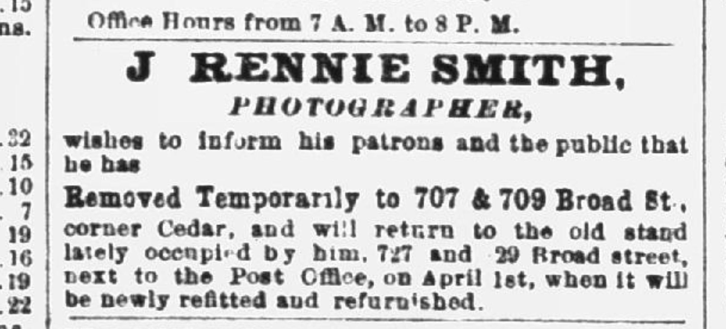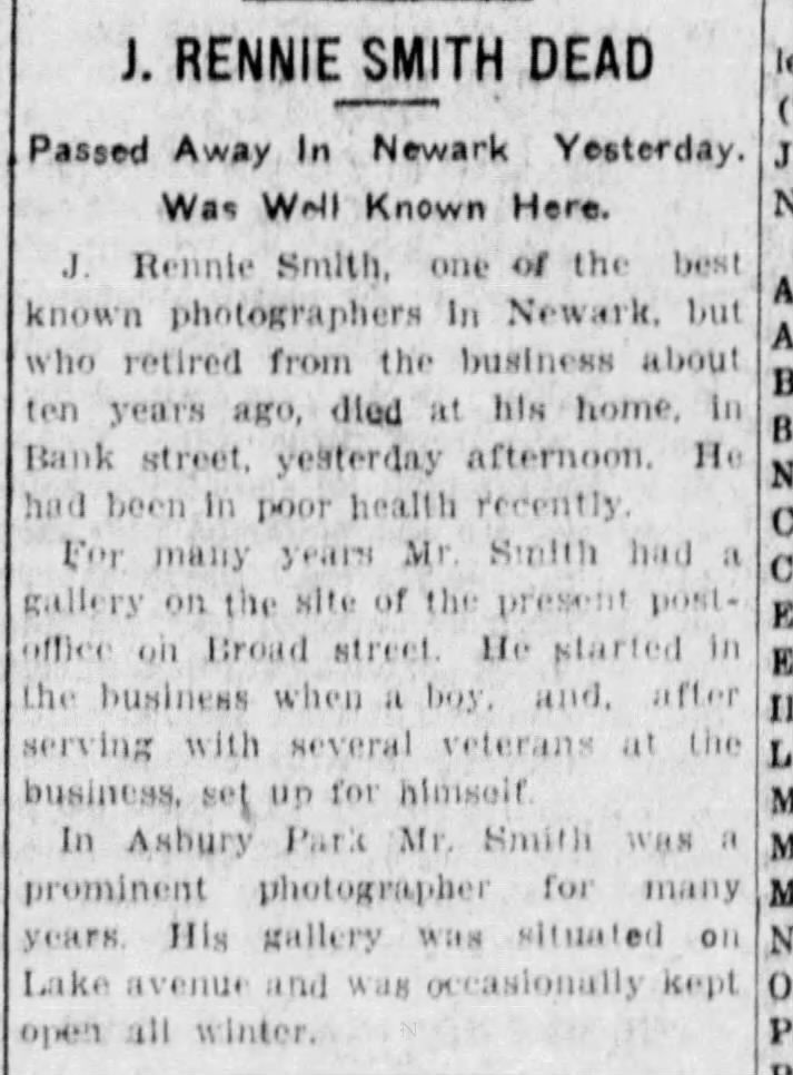 Photograph of an unidentified wearing a jacket and tie taken at J. Rennie Smith's photographic studio, 727 & 729 Broad Street, Newark New Jersey. Smith was a prominent photographer in Newark and Asbury Park 1880-1895. The photograph comes from the Bosworth collection of unidentified photos.