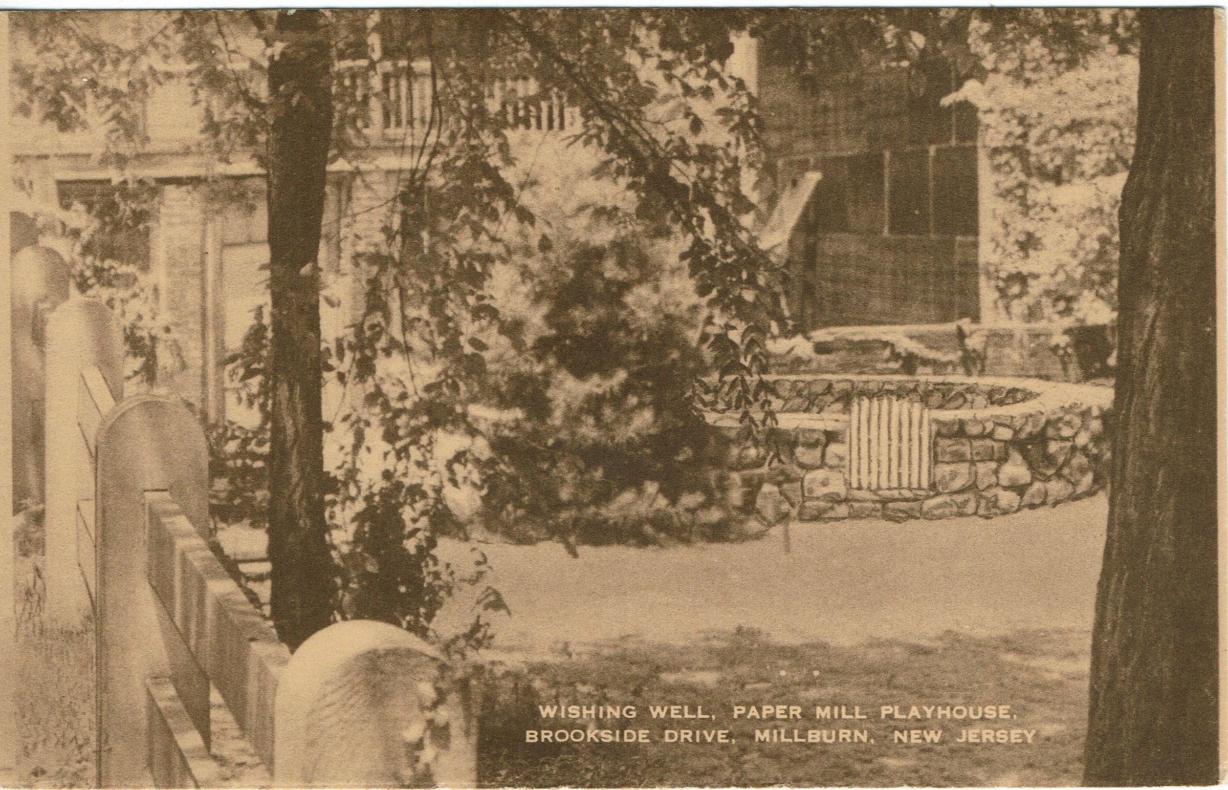 Postally unused, sepia photographic postcard of the wishing well, outside the Paper Mill Playhouse on Brookside Drive in Millburn, NJ.