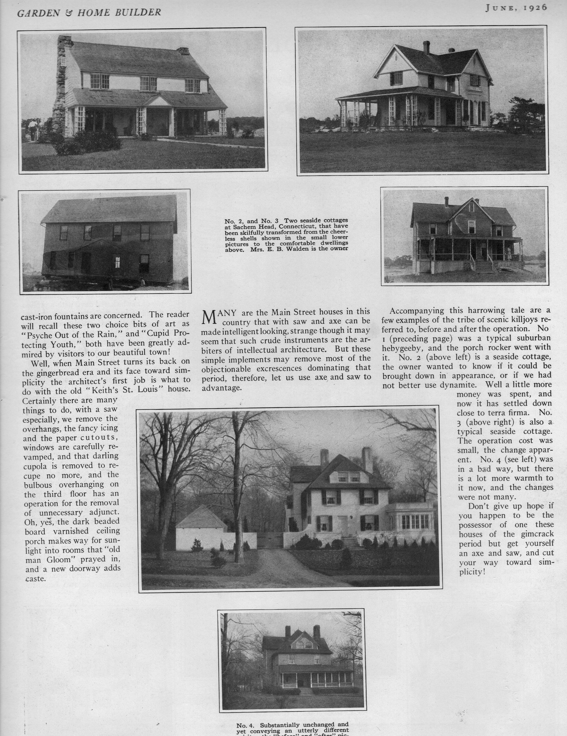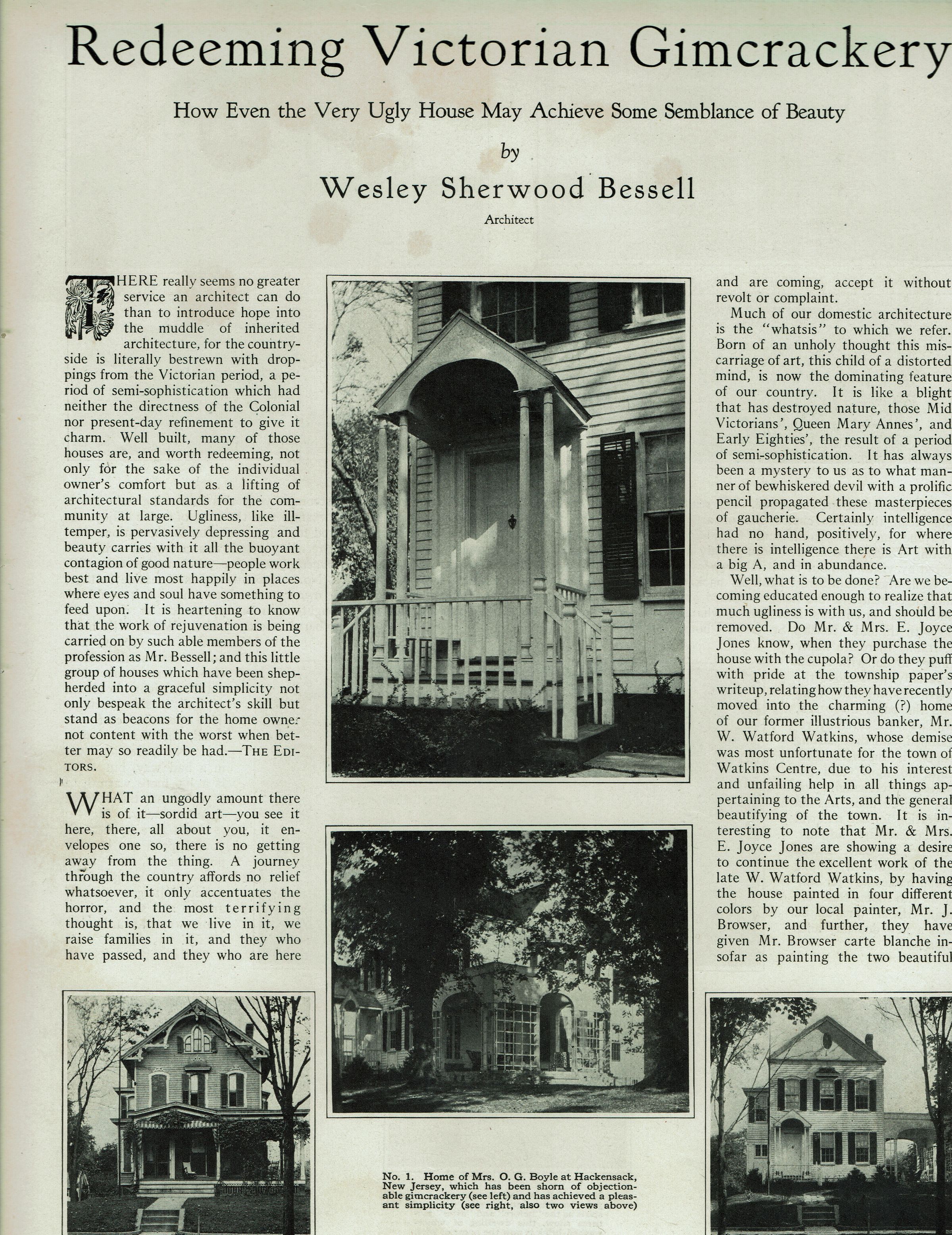 Welsey Sherwood Bessell, "Redeeming Victorian Gimcrackery: How Even the Very Ugly House May Achieve Some Semblance of Beauty," Garden & Home Builder, June 1926, p. 345-346.