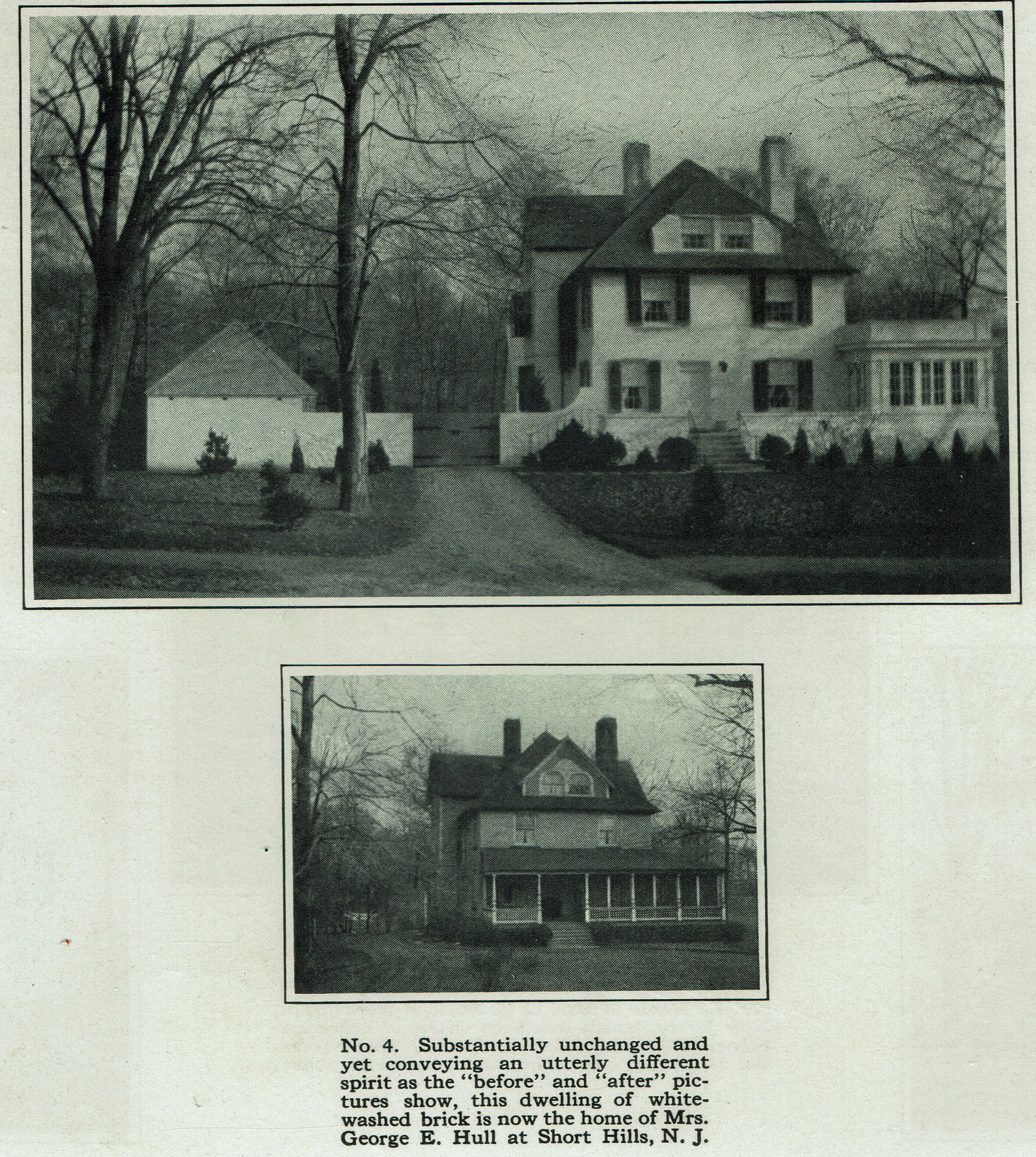 Article by architect Wesley Sherwood Bessell critical of the "gimcrackery" he attributes to Victorian style architecture in favor of the Colonial style. Among the examples of before (ugly) and after views is the home of Mrs. George E. Hull, 108 Forest Drive, Short Hills.