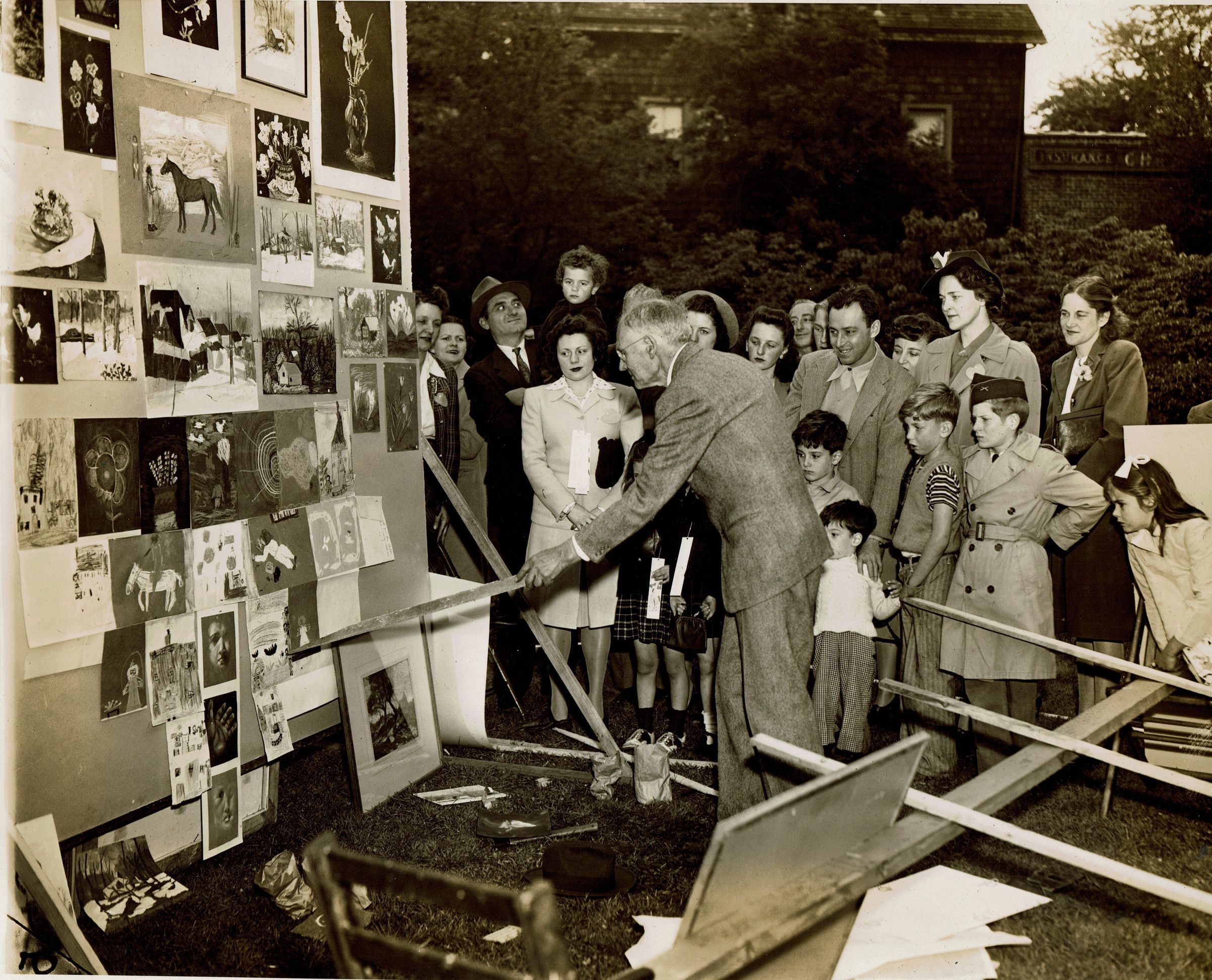 Photograph of Van Dearing Perrine lecturing about children's art at the June 3, 1944 Village Festival in Taylor Park sponsored by the Millburn Short Hills Art Center.