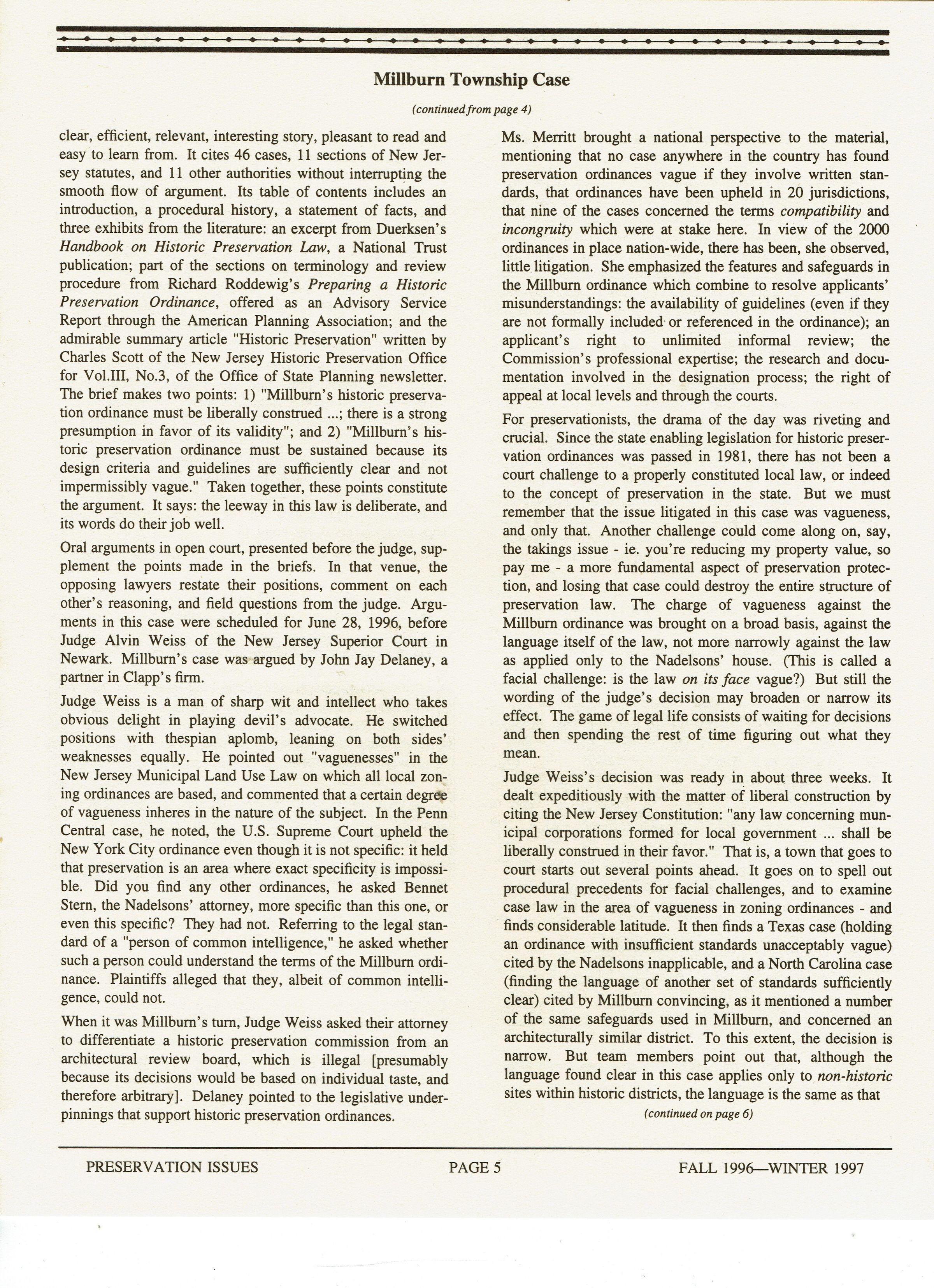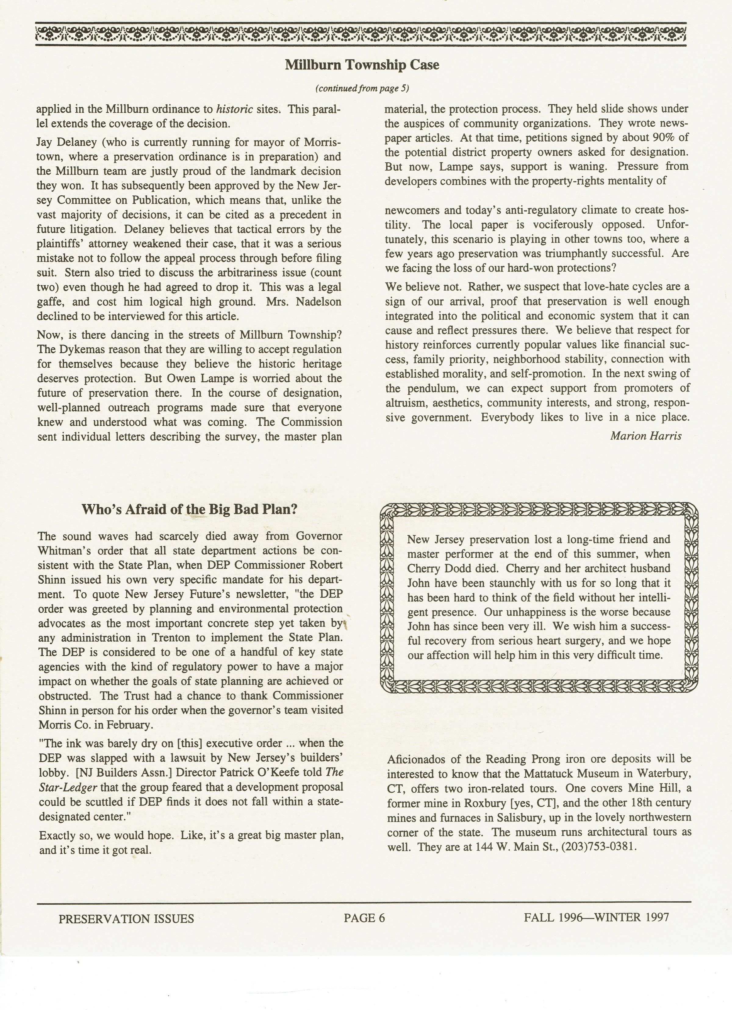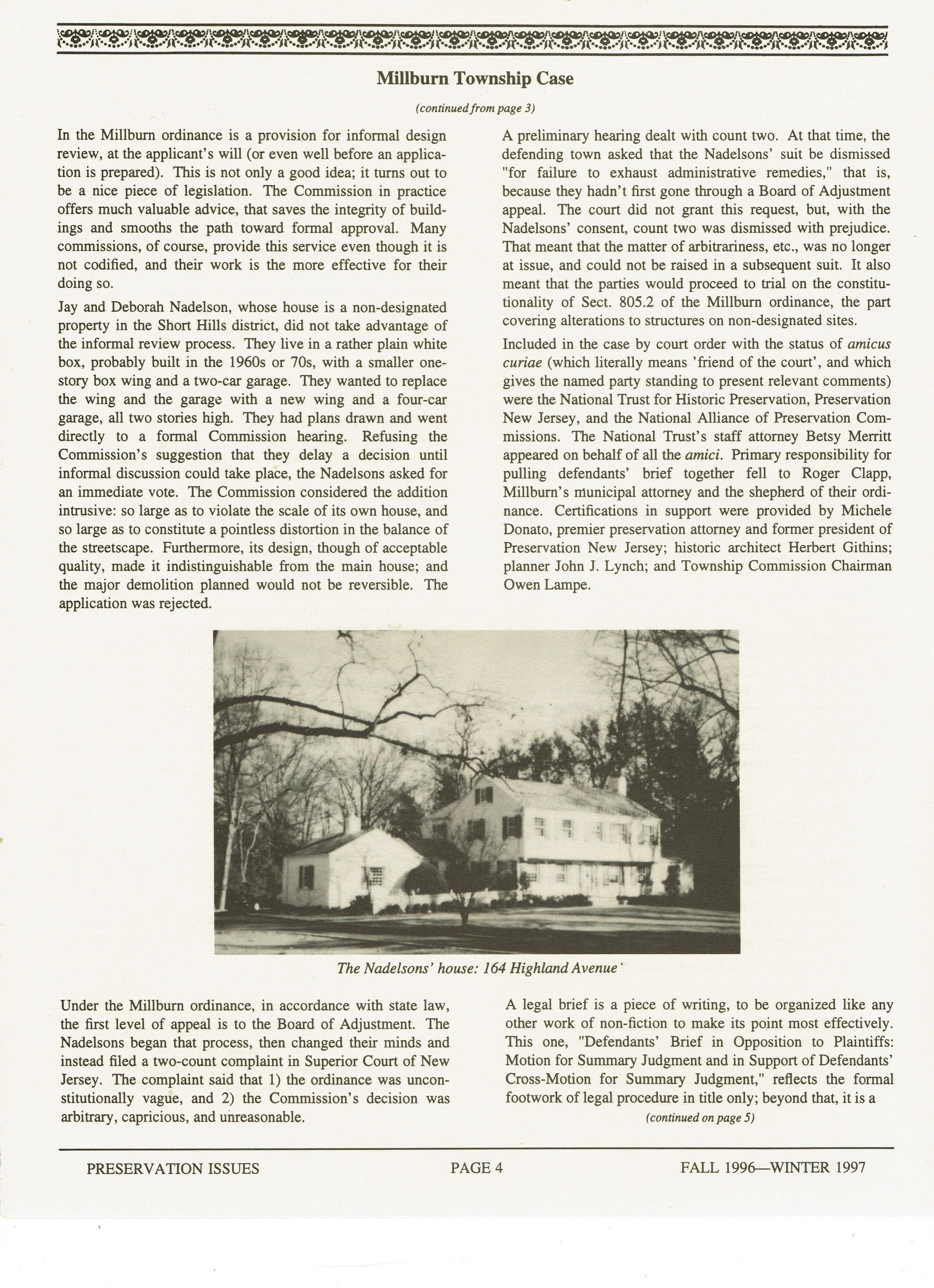 "Preservation's First Legal Challenge in New Jersey, and Millburn Wins," Preservation Issues from the Morris County Trust for Historic Preservation, Fall 1996-Winter 1997. 8 pp., illustrated with B&W plates. Article on the landmark case to preserve Hartshorn House #50, "The Fortress," 7 Chestnut Place.
