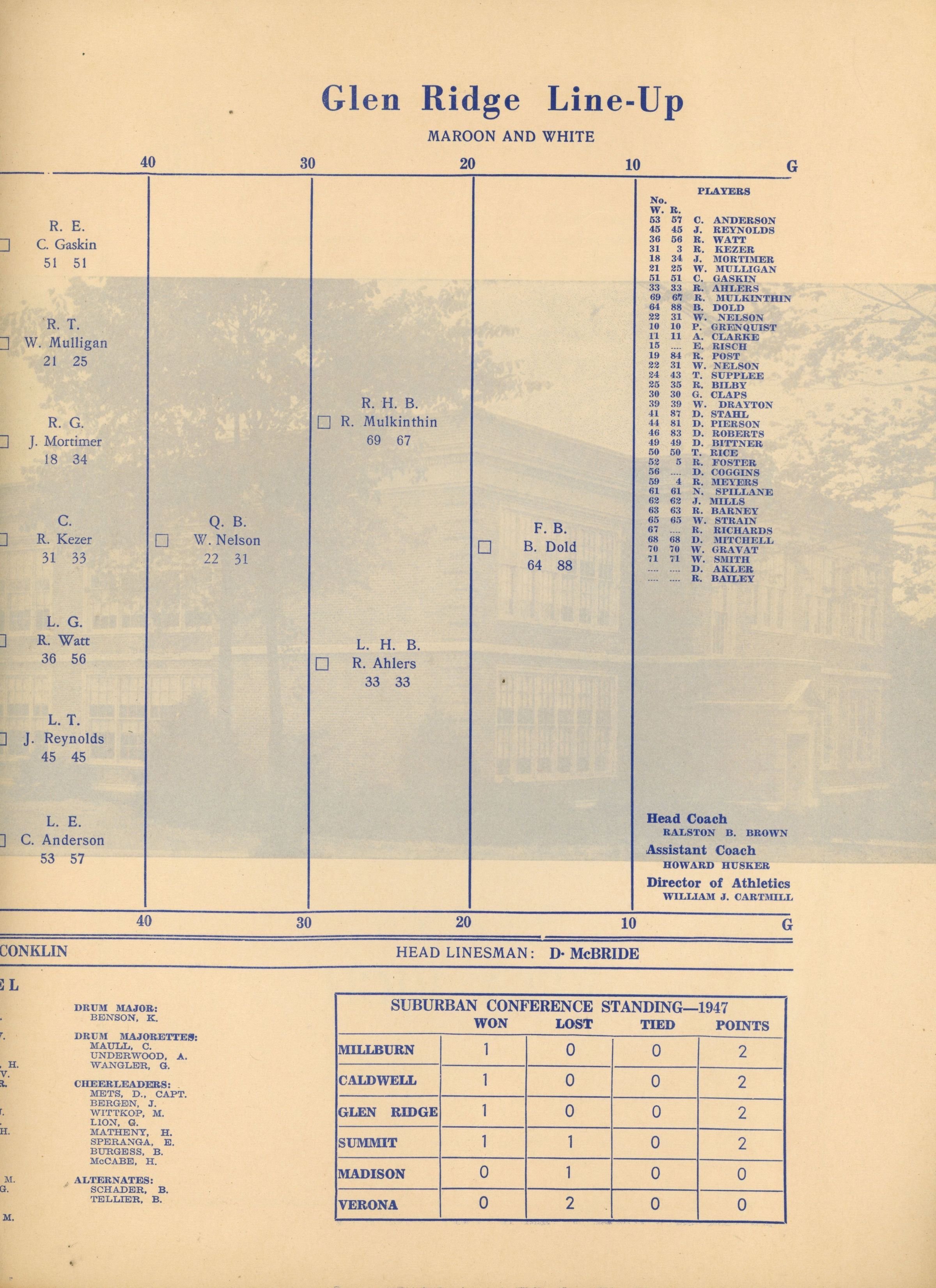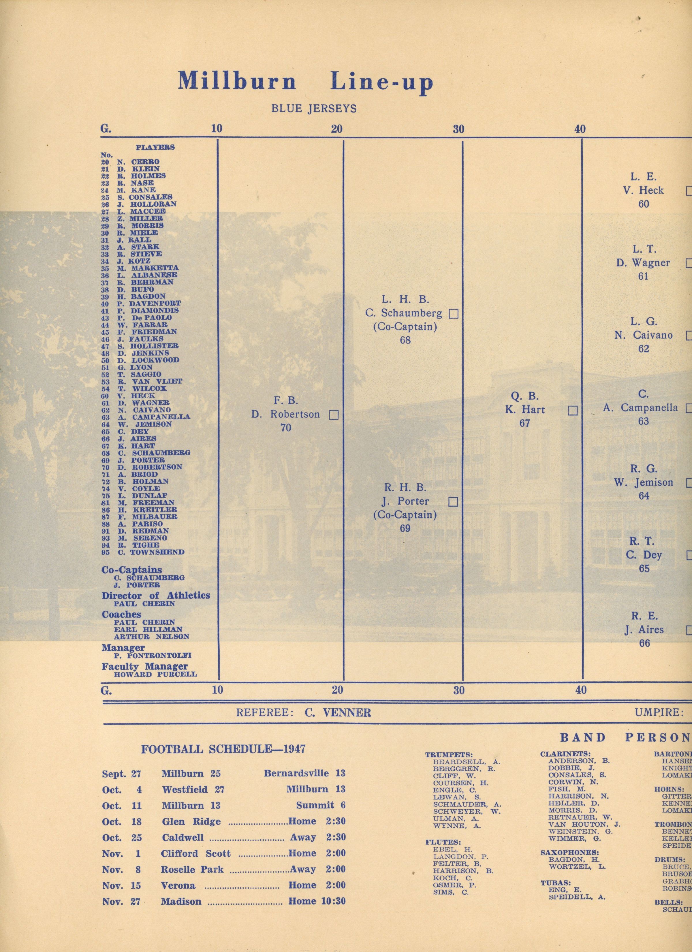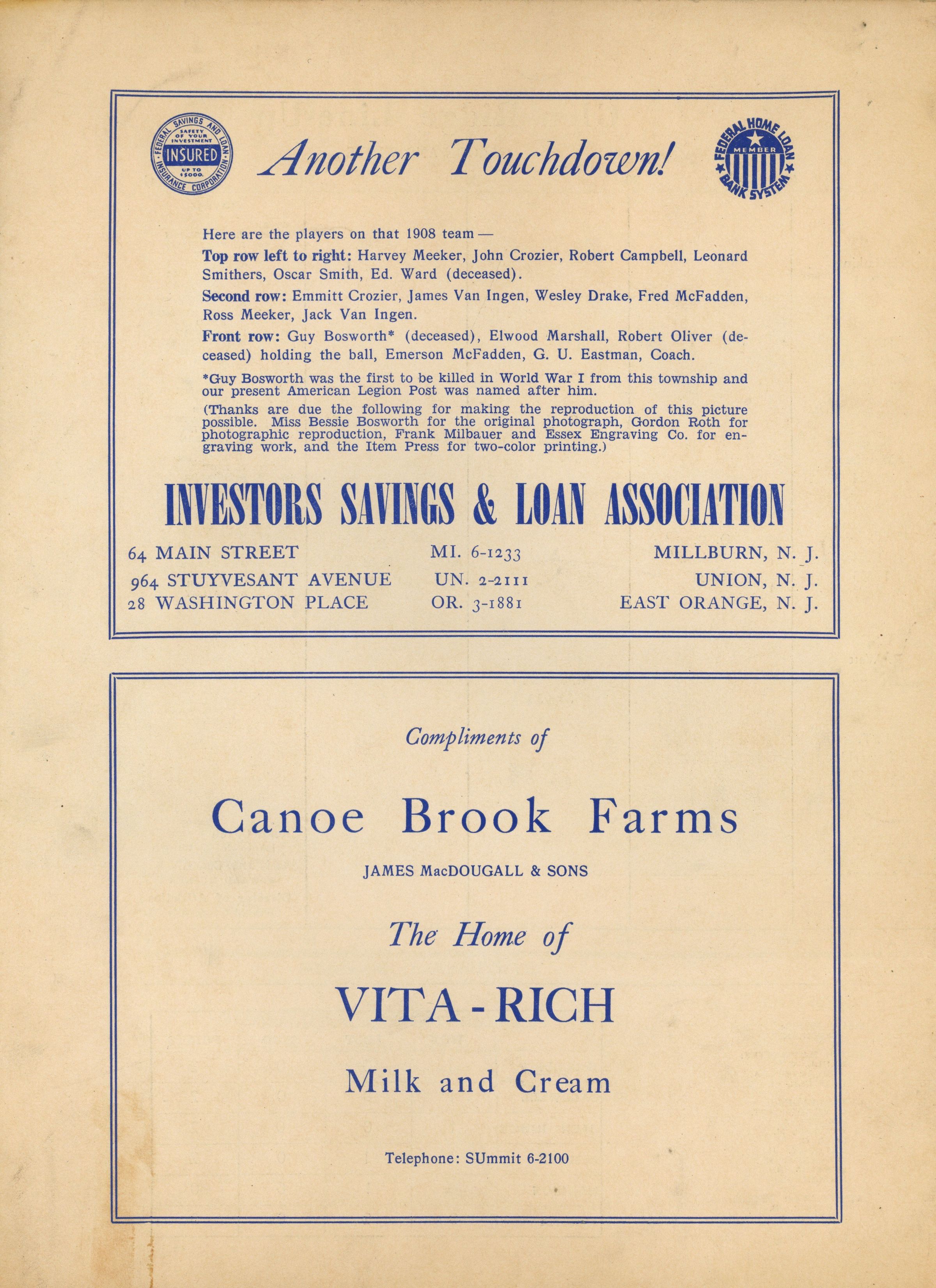 Archive Entry Archive Entry Go back Prev Item Next Item Bosworth: Millburn High School 1947 Football Program with 1908 Team, 1947 Publication Entry/Object ID2025.062.084AcquisitionAccession2025.062DimensionsHeight11-3/4 inWidth8-3/4 in