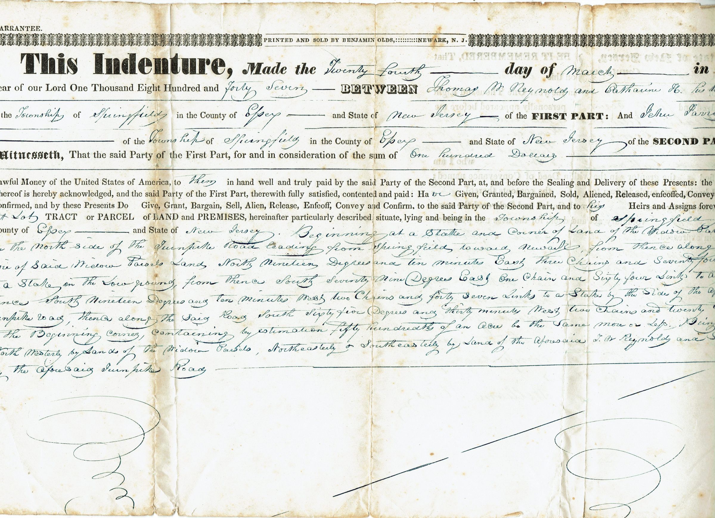 Deed issued on March 24, 1847 between Thomas M. Reynolds and Catharine H. Reynolds of Springfield an Jehu Farrow of Springfield for the sale of land for the sum of $100.