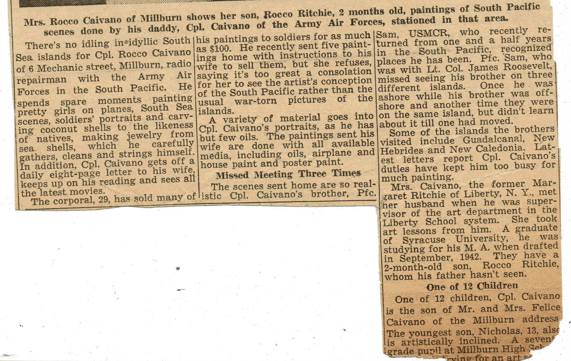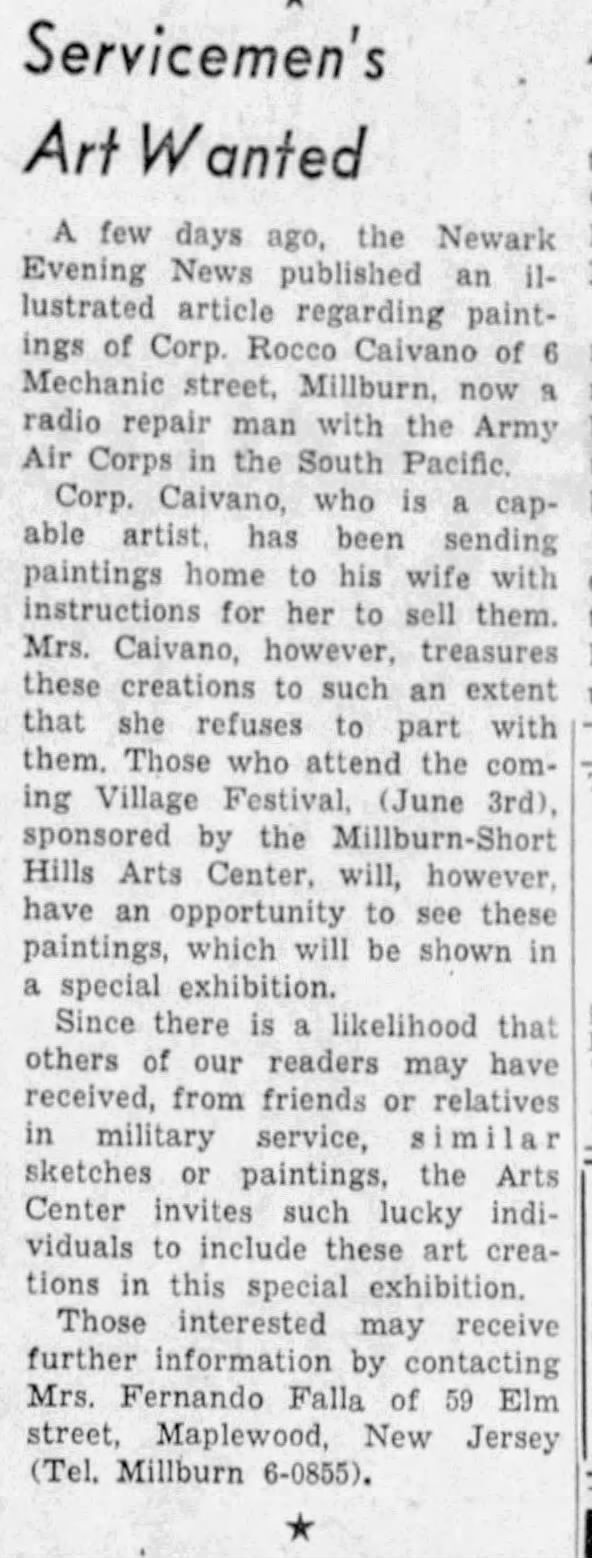 Archive Entry Archive Entry Go back Prev Item Next Item Millburn Art Center: Rocco Caivano Paintings from the South Pacific, 1944 Publication Entry/Object ID2023.214.114CollectionMillburn Art CenterAcquisitionAccession2023.214