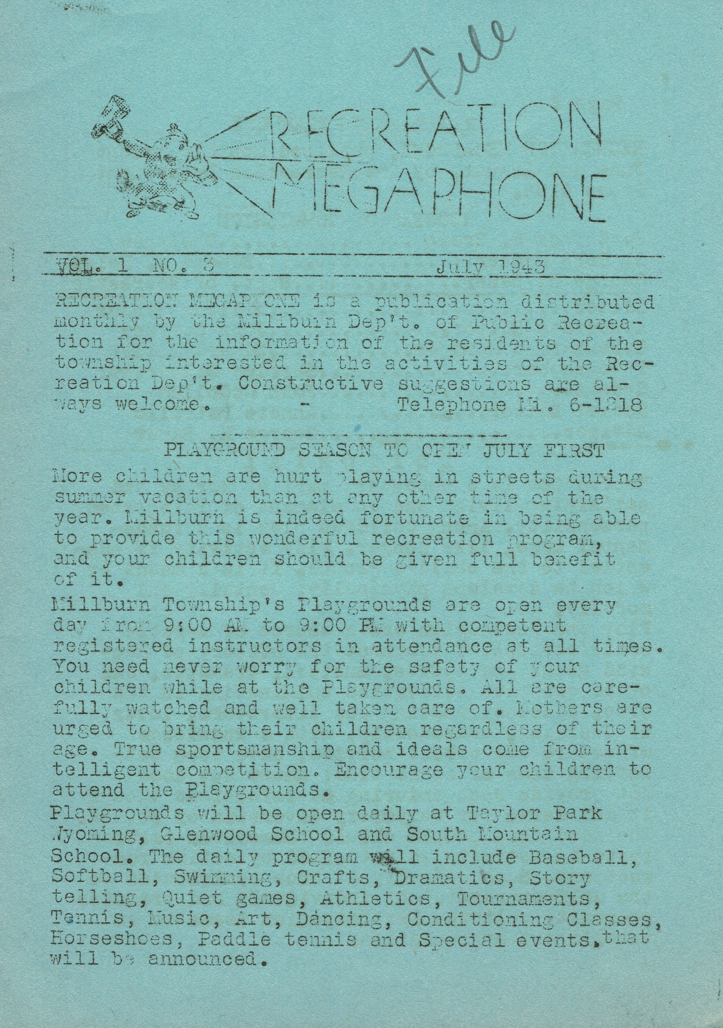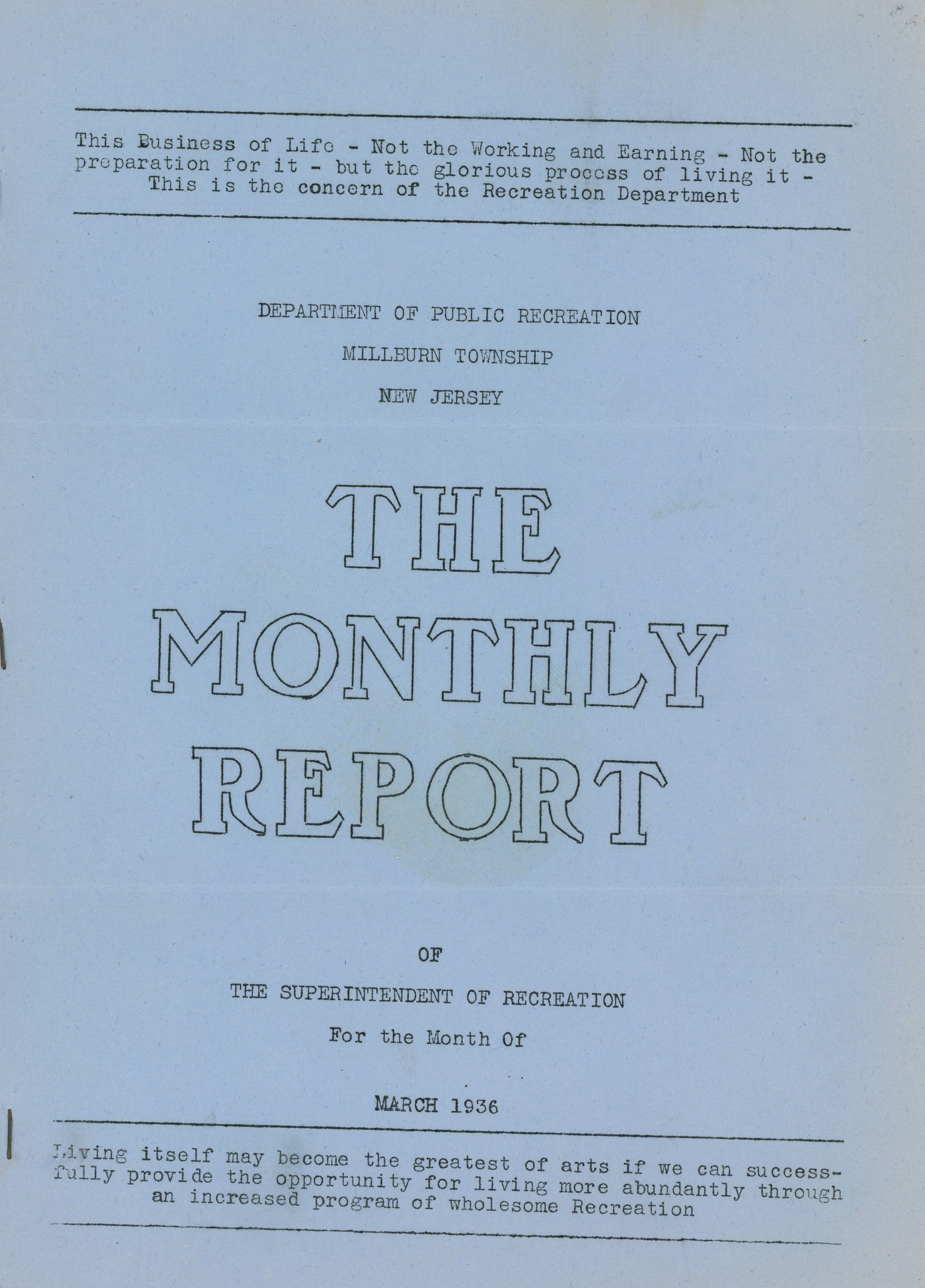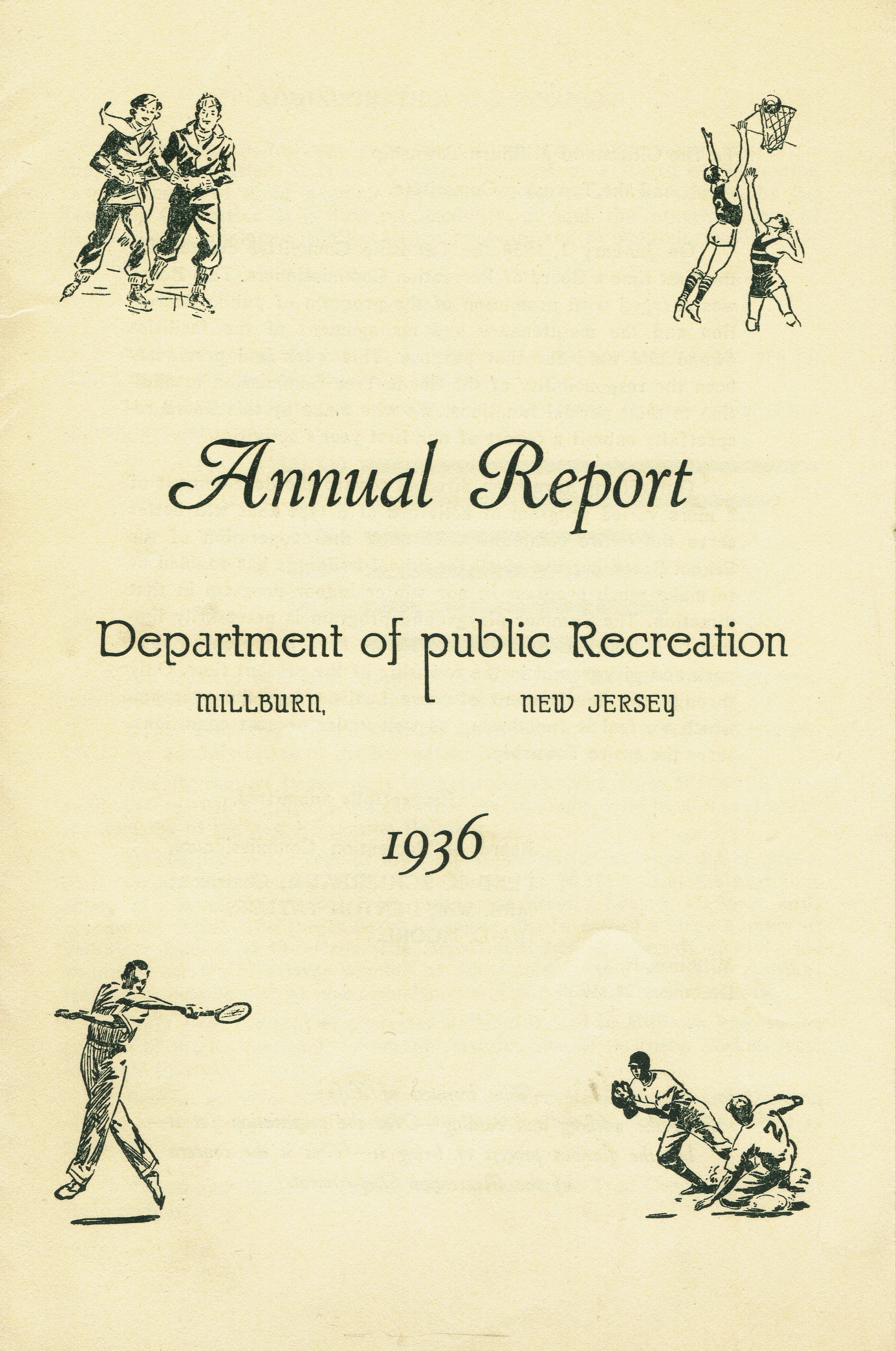 Pamphlets describing programs and events from the Millburn Department of Recreation: 1936 Annual Report, The Monthly Report March, April, June-August, 1936, July 1943 Recreation Megaphone Newsletter.