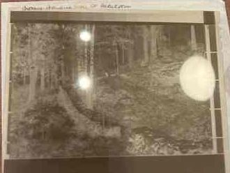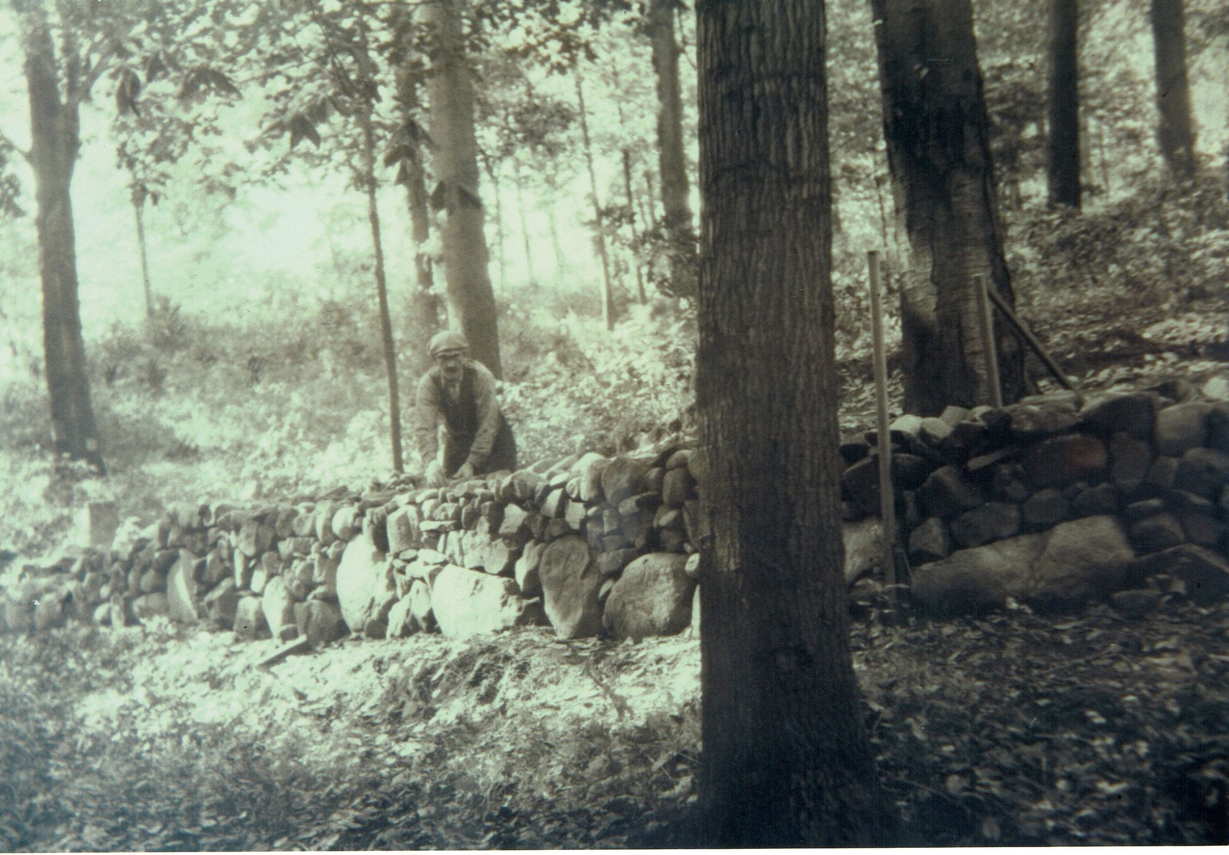 Cora Hartshorn's handyman and mason building the stone drywall at the Arboretum. Photograph and negative