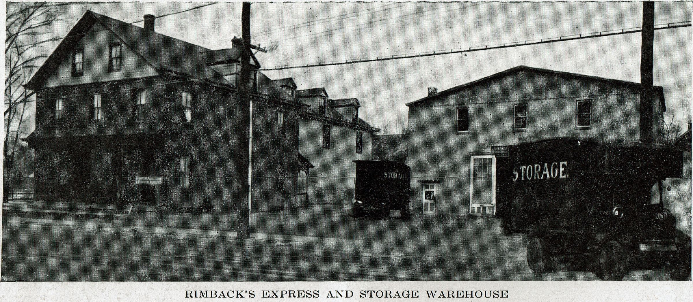 Photograph of Rimback's Express Moving Company and Storage Warehouse on Millburn Avenue from "South Orange, Maplewood, Millburn & Springfield, N.J." New York: G.W. Richardson (undated), belonging to William Mangold (60 Whittingham Terrace, Millburn). See: 2022.236.020.