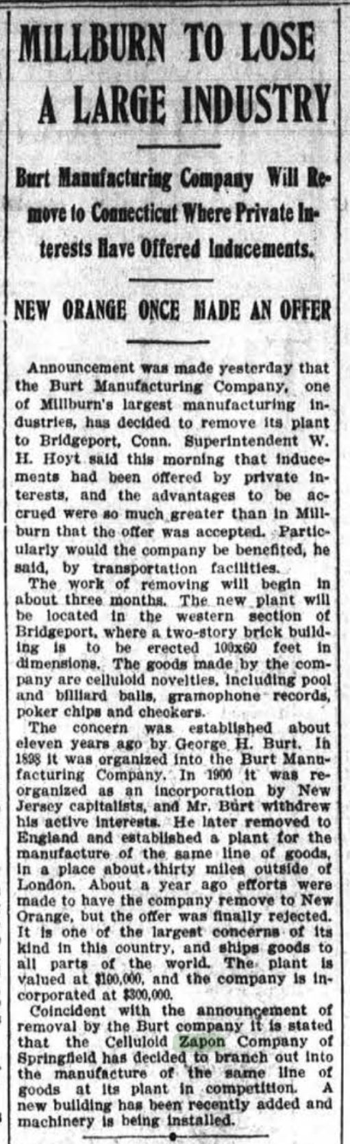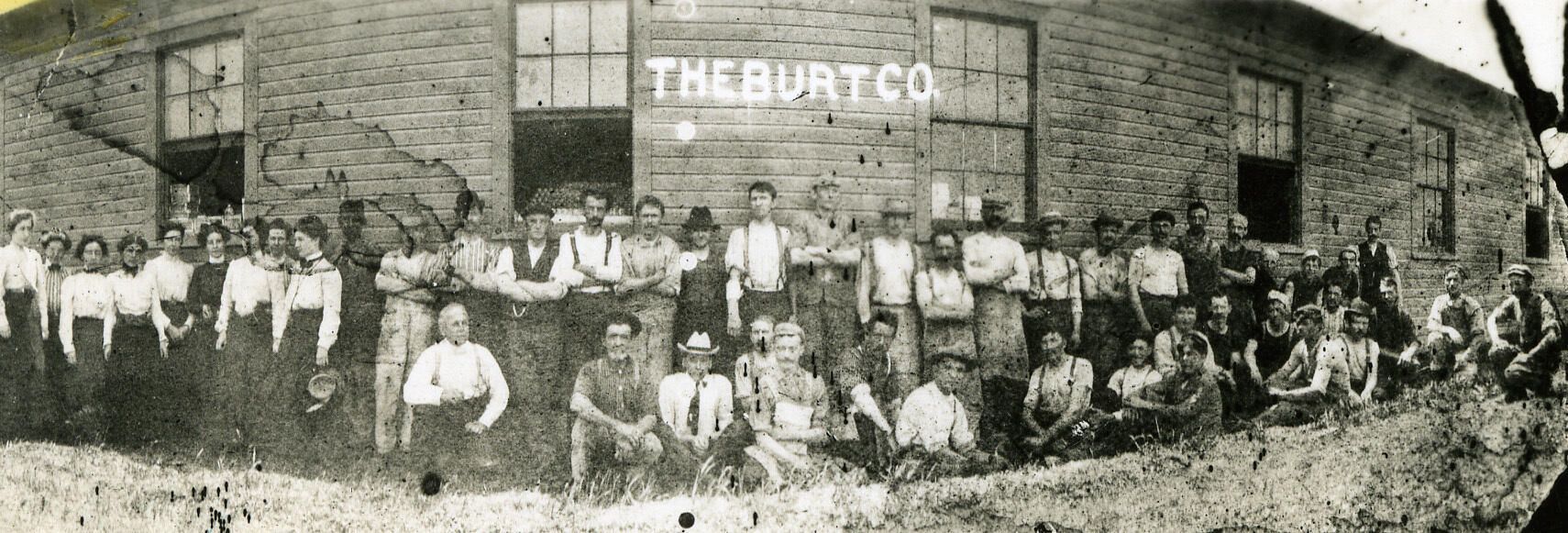 Male & Female Workers Pose Outside The Burt Company Factory. The Burt Billiard Ball Company was the largest Pool Ball Works in America at the time. Site was near where South Mountain School is today. George H. Burt, b. November 1863, died before 1920 census. Married Ella Marie (b. 1864), c. 1888. Father was an ivory turner. George Burt founded the concern in c. 1891, establishing the Burt Manufacturing Company in 1898. The company was reorganized in 1900 and Burt moved to England in October 1900 to pursue similar interests.