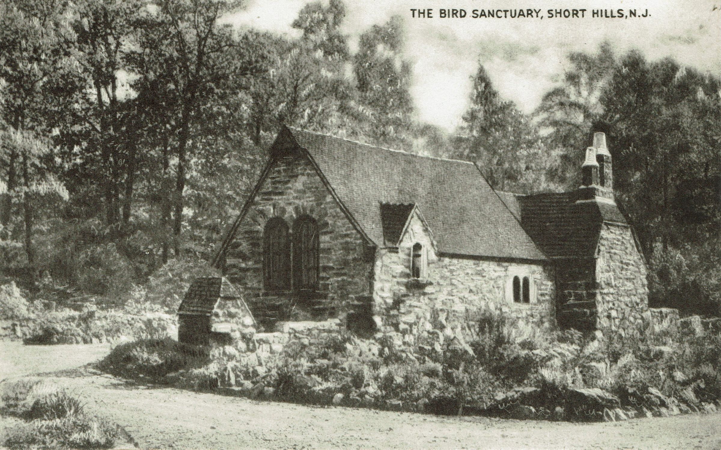 Postally unused. Real-photo postcard view of the stone house at the Cora Hartshorn arboretum on Forest Drive in Short Hills. Designed by leading architect of the the period Bernhardt Muller, the building was constructed using stone from the Hartshorn quarry. It was designed in 1931 & completed in 1933.