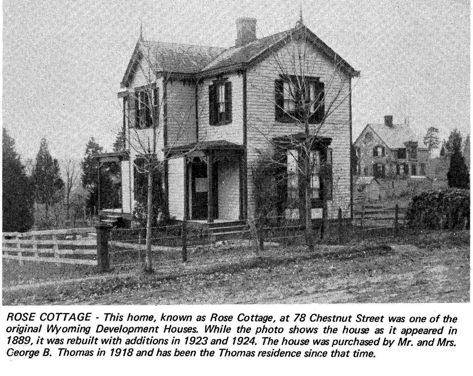 Photograph of 78 Chestnut Street from the 1978 David Gibson Historic Sites Survey. The house was constructed c. 1880 and was part of the original Wyoming Development Homes. It became the home of architect Joy Wheeler Dow when he moved to Wyoming in 1882. It was then called Rose Cottage because of the flowers.