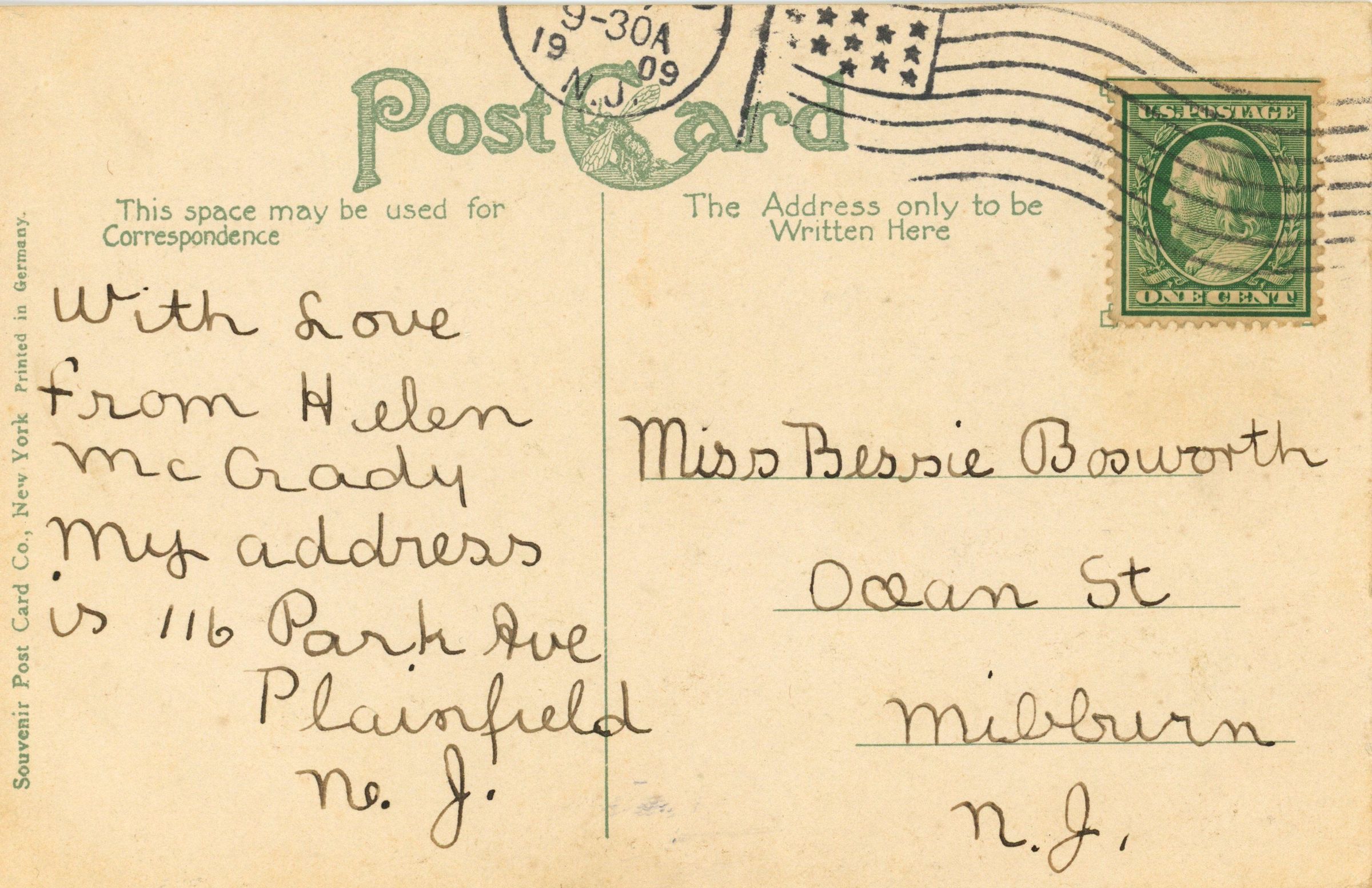 Postally used, color postcard of Plainfield Country Club, Plainfield, N.J., postmarked 1909 and addressed to Miss Bessie Bosworth, Ocean Street, Milburn, N.J. The message reads, "With love from Helen McGrady. My address is: 116 Park Avenue, Plainfield, N.J."