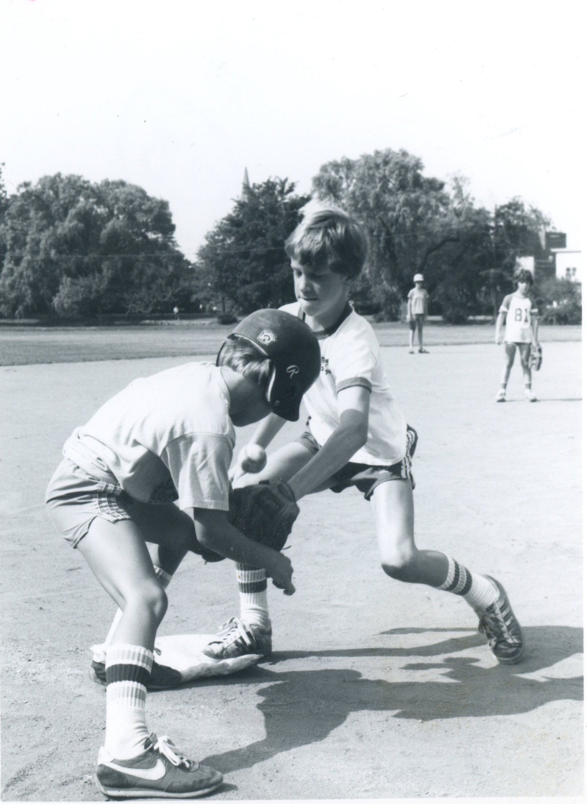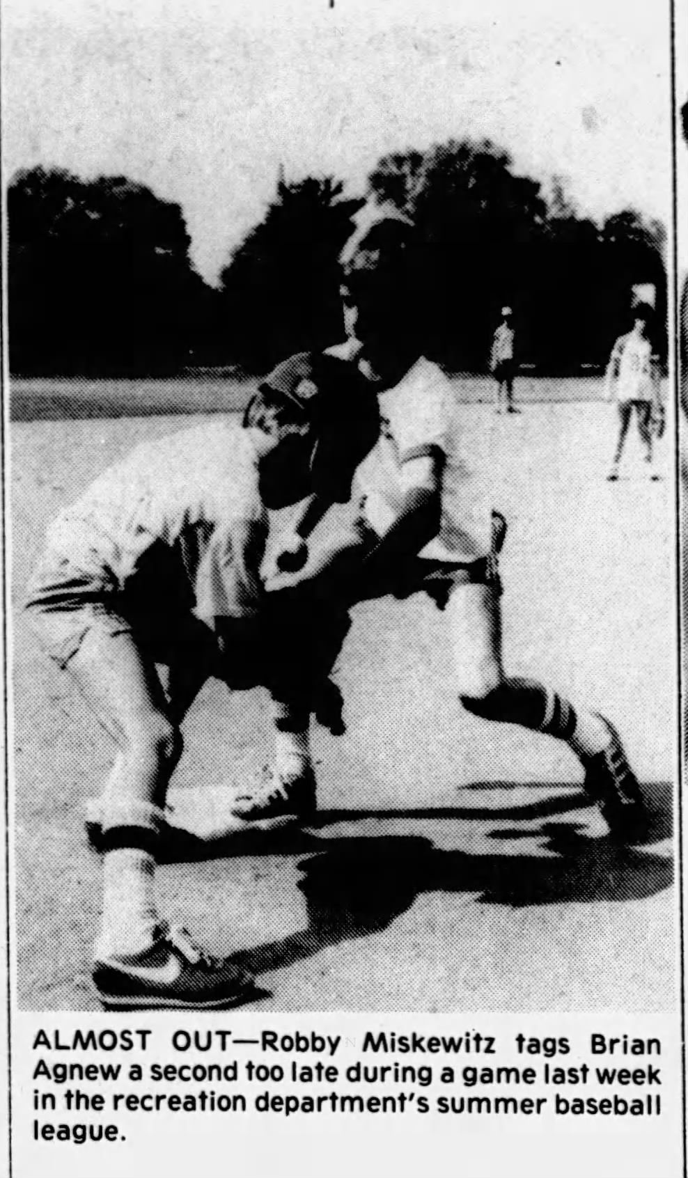 Photograph of Millburn Recreation Department's baseball team from August 1982. The photograph was published in the Item, August 12, 1982 and shows Robby Miskewitz tagging Brian Agnew.