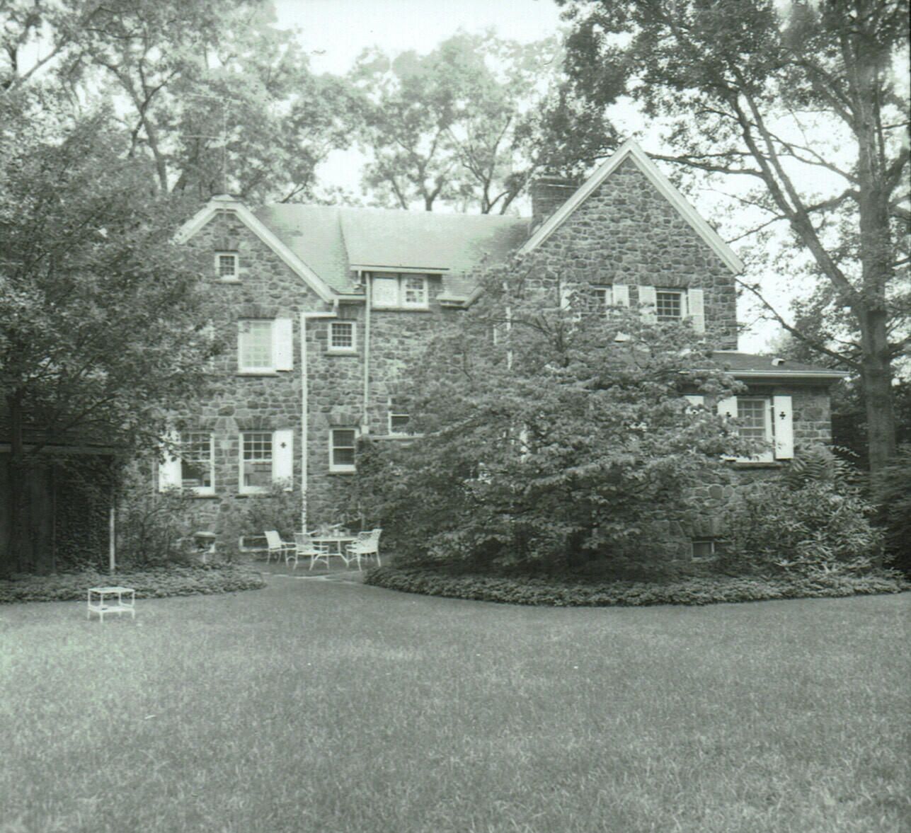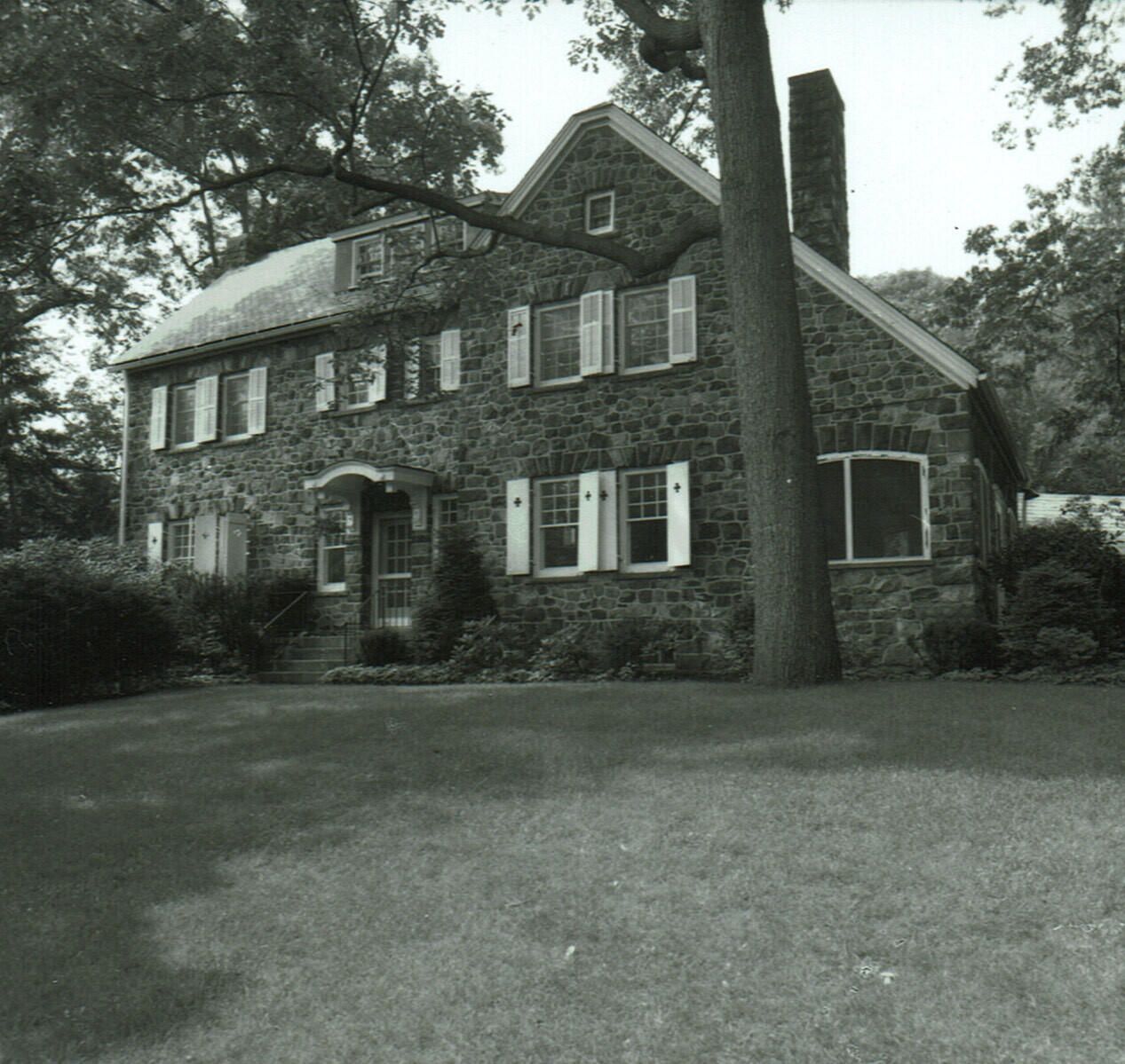 Photograph of 110 Knollwood Road. Hartshorn House # 67. This mirror image to 45 Northern Drive (20th cent. Eclectic with gable roof and slate covering) was built ca. 1900. According to members of the Layng family, Arthur McEntee was the architect of the house. Note entrance porch and brackets on roof over entrance. Note also the lead design in the windows flanking the entrance door.