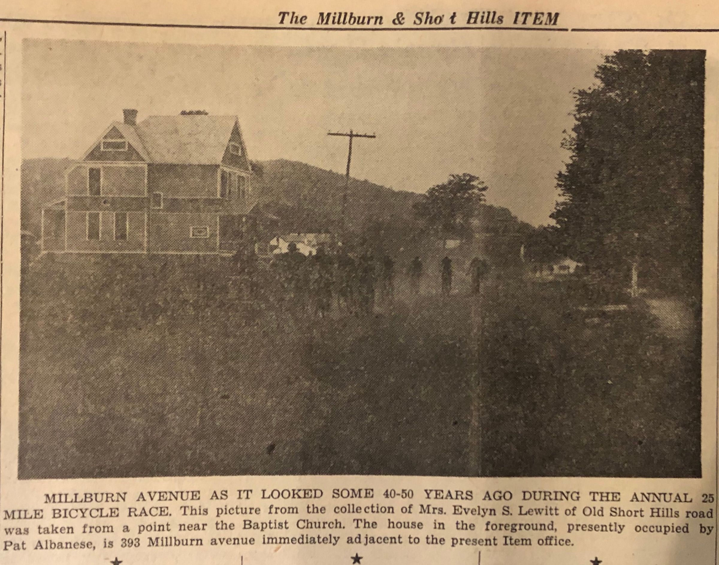 Photograph of the Irvington-Millburn Road Race with the bicycles passing 393 Millburn Avenue. May 30 (Year is unknown). Photograph is mounted on card. Verso of card stamped "Millburn Item" 3 Col. 65 Screen.