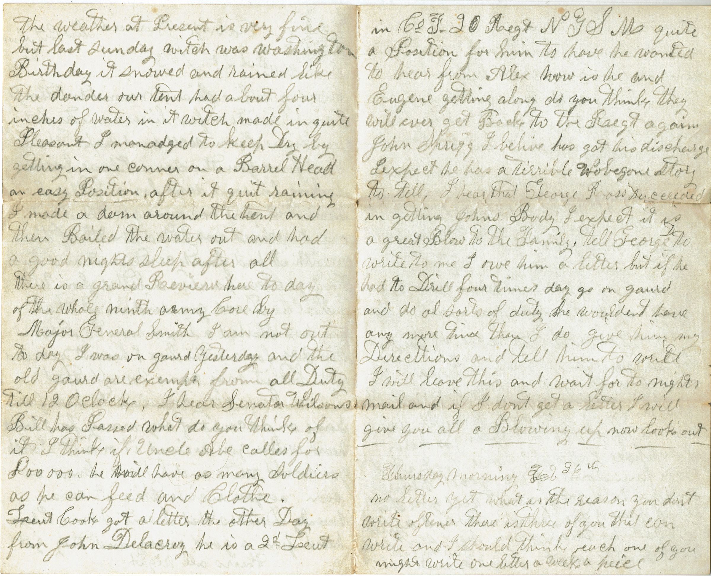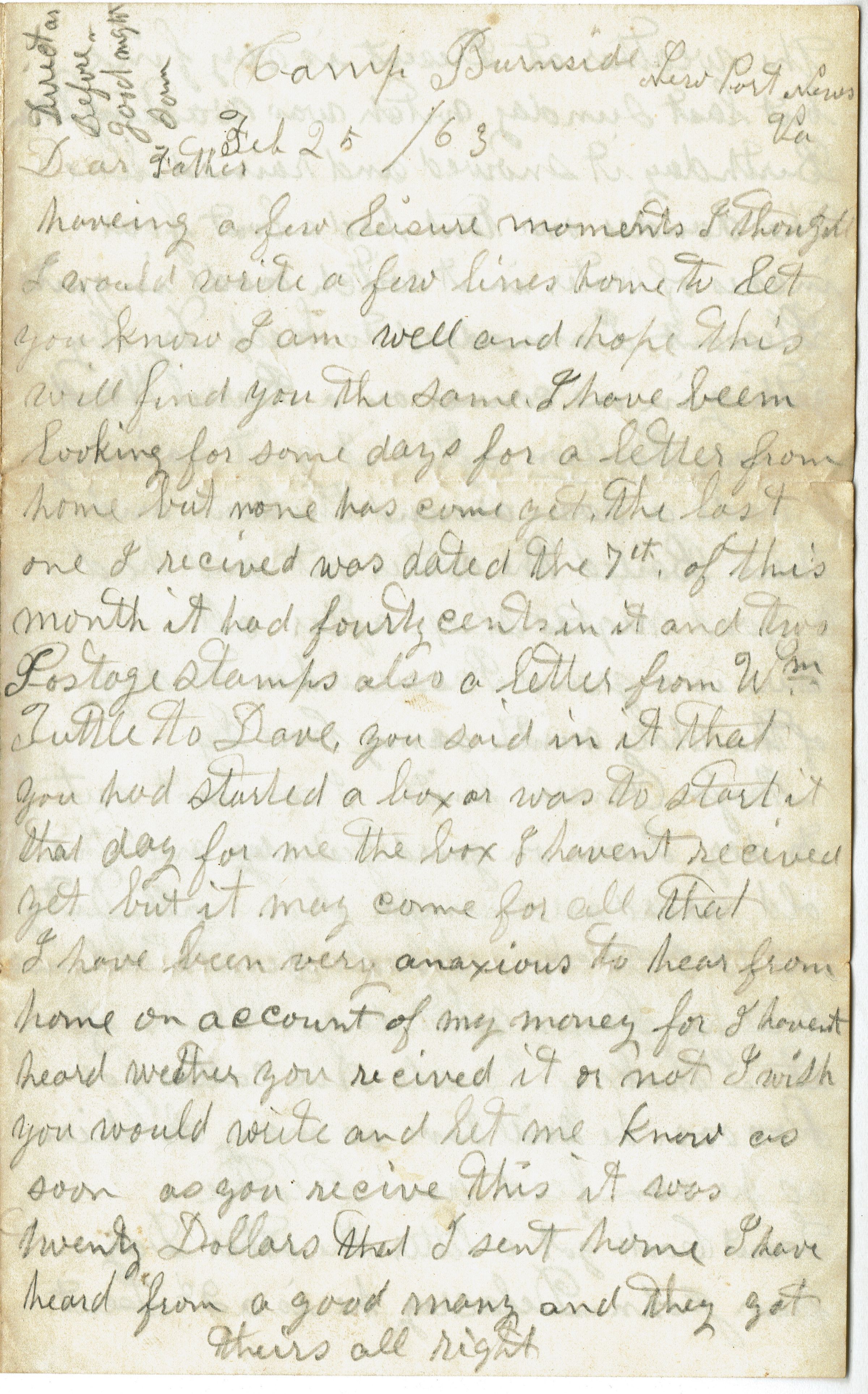 Letter from Samuel B. Parsil to his father dated February 25, 1863 from the 27th NJ Infantry stationed at Camp Burnside, near New Port News, Virginia. Letter mentions George Ross coming to collect the body of John (Drew) Ross to bring it home.