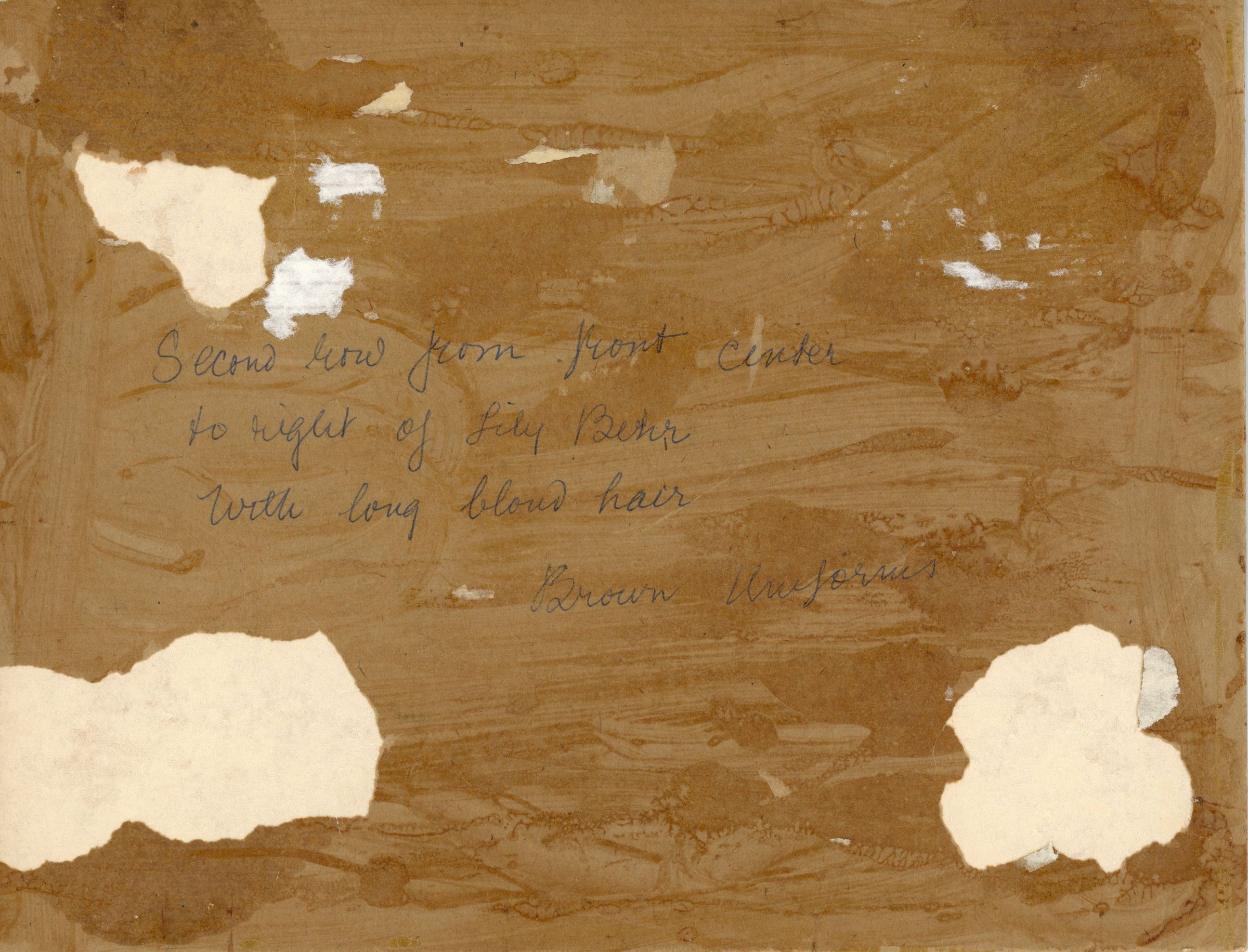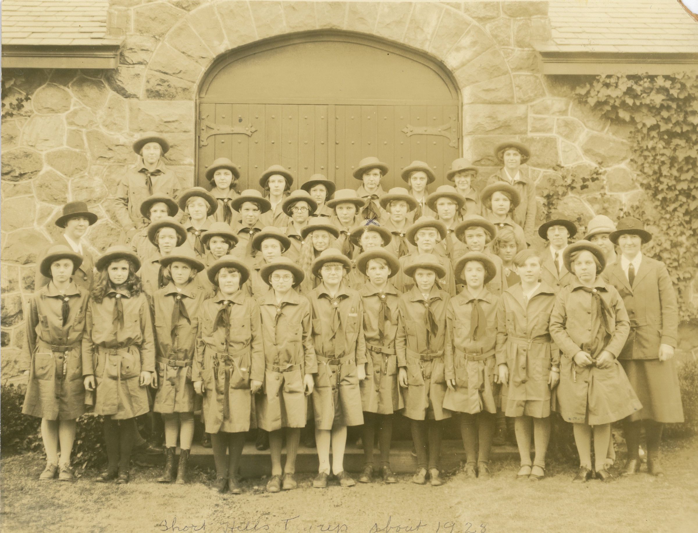 Photograph of the Short Hills Girl Scout Troop standing by Christ Church in c. 1928. Pictured in the photograph is Catherine Hartshorn (indicated by the blue X mark). Inscription on verso of photography identifies Catherine Hartshorn's location as being the in the second row from front, center and to the right of Lily Behr.