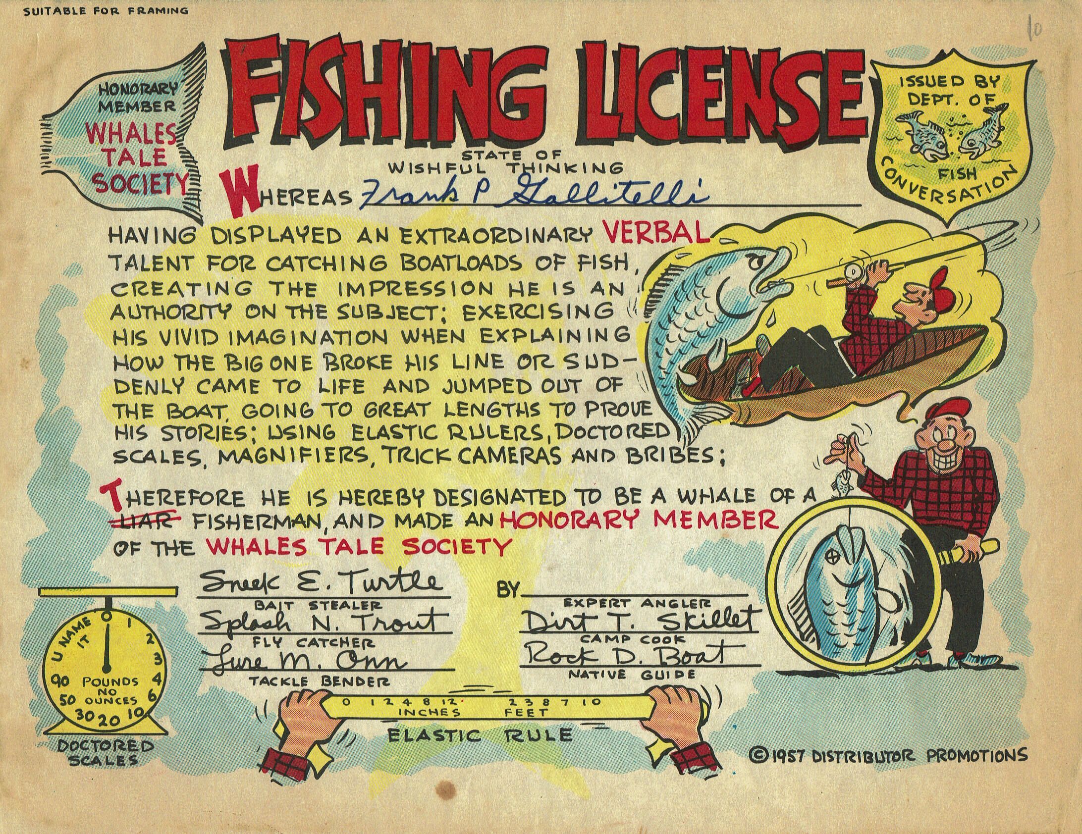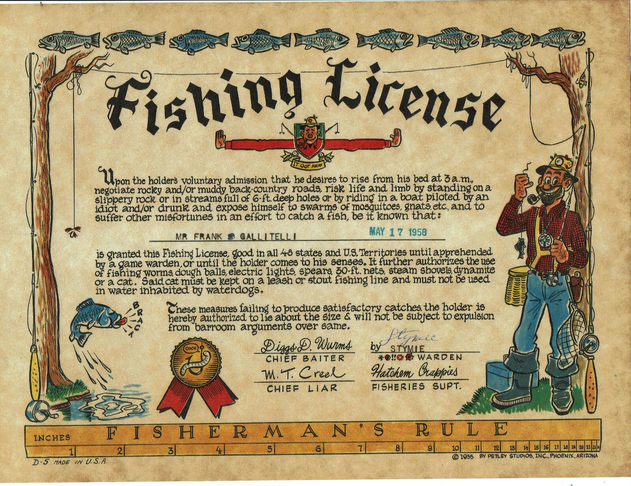 Archive Entry Archive Entry Go back Prev Item Next Item Gallitelli: Frank Gallitelli Fishing Licenses 1958 Object/Artifact Entry/Object ID2021.321.001AcquisitionAccession2021.321DimensionsDimension Description8 1/2 x 11"