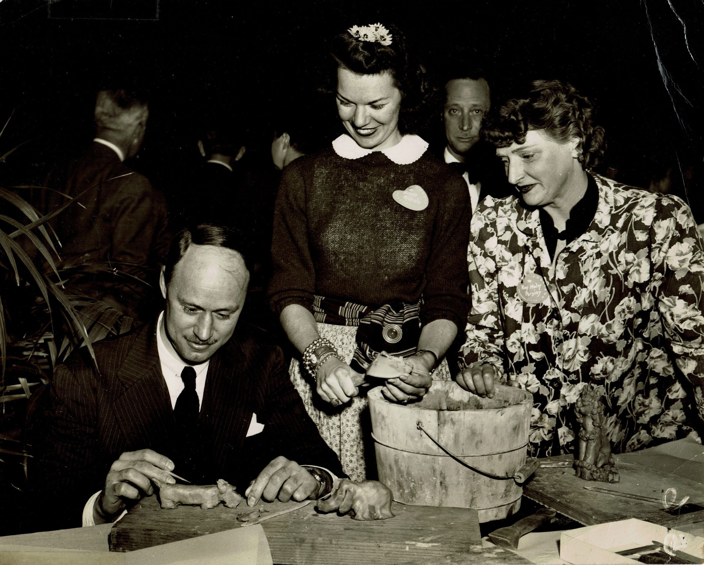 Photograph of Robert S. Trowbridge (57 Jefferson Avenue, Maplewood, N.J) modeling with clay at the Millburn Short Hills Art Center's "A Night in Bohemia" event, December 1, 1944 at Glenwood School, Short Hills. Watching him are Joyce Malcolm (Short Hills) and Mrs. Donald D. Persing (Kilmer Drive), Short Hills.