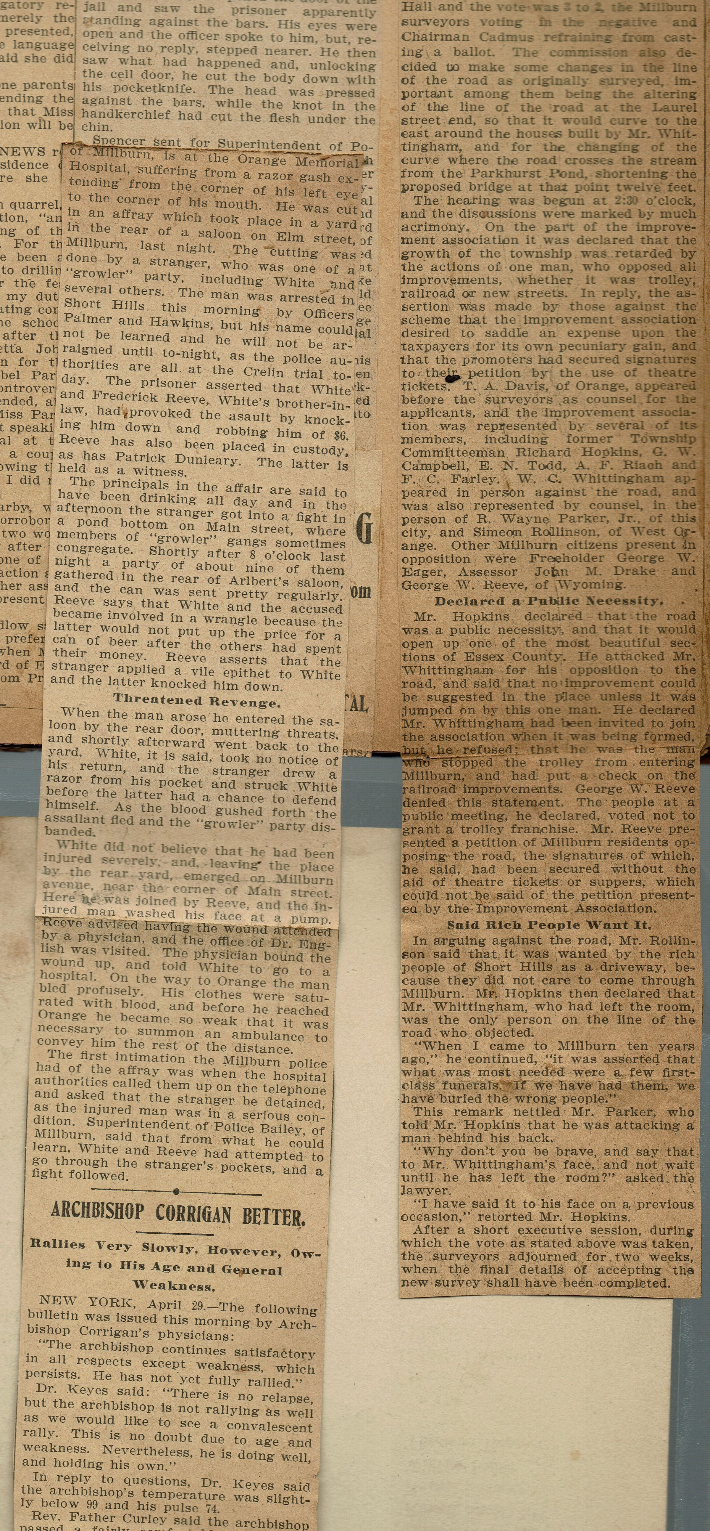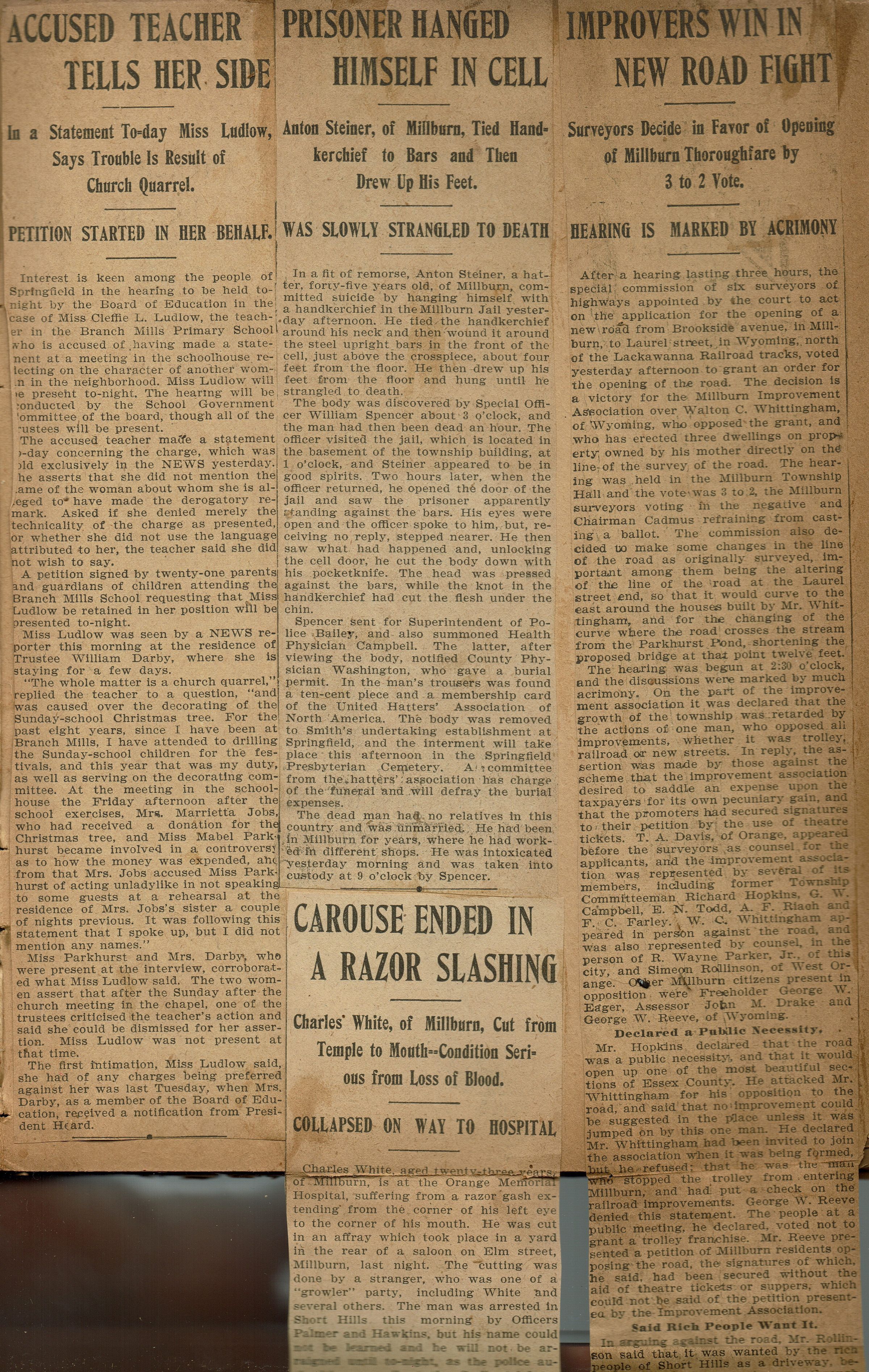 Newspaper clippings from page 18 of the scrapbook belonging to the Flanagan family (44 Mechanic Street, Millburn). Topics covered included crime, suicide, opening of Brookside Avenue to Laurel Street in Wyoming. Those involved in the debate over opening the road included: Walton C. Whittingham, G.W. Campbell, E.N.Todd, F.C. Farley, George W. Eager, John M Drake, George W. Reeve.
