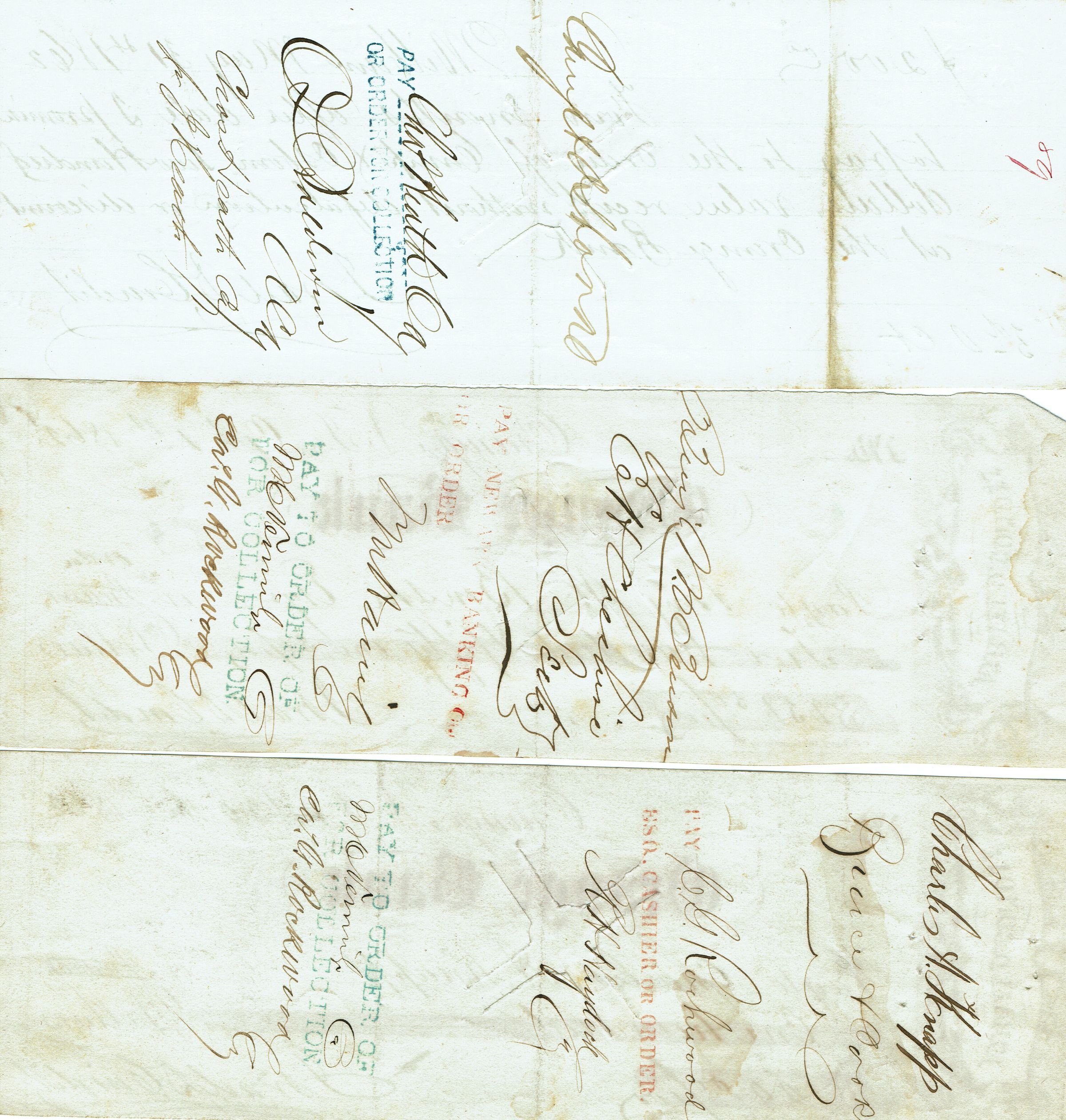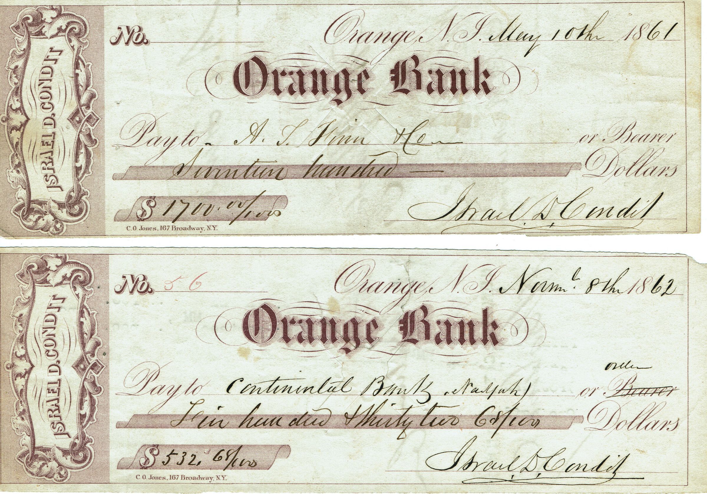 Hand-written Promissory Note from Israel D. Condit, Millburn, May 30, 1862 and 4 checks drawn from the Orange Bank dated May 10, October 1, October 20 and November 8, 1862 and signed by Israel D. Condit. Note and Checks are countersigned on verso.