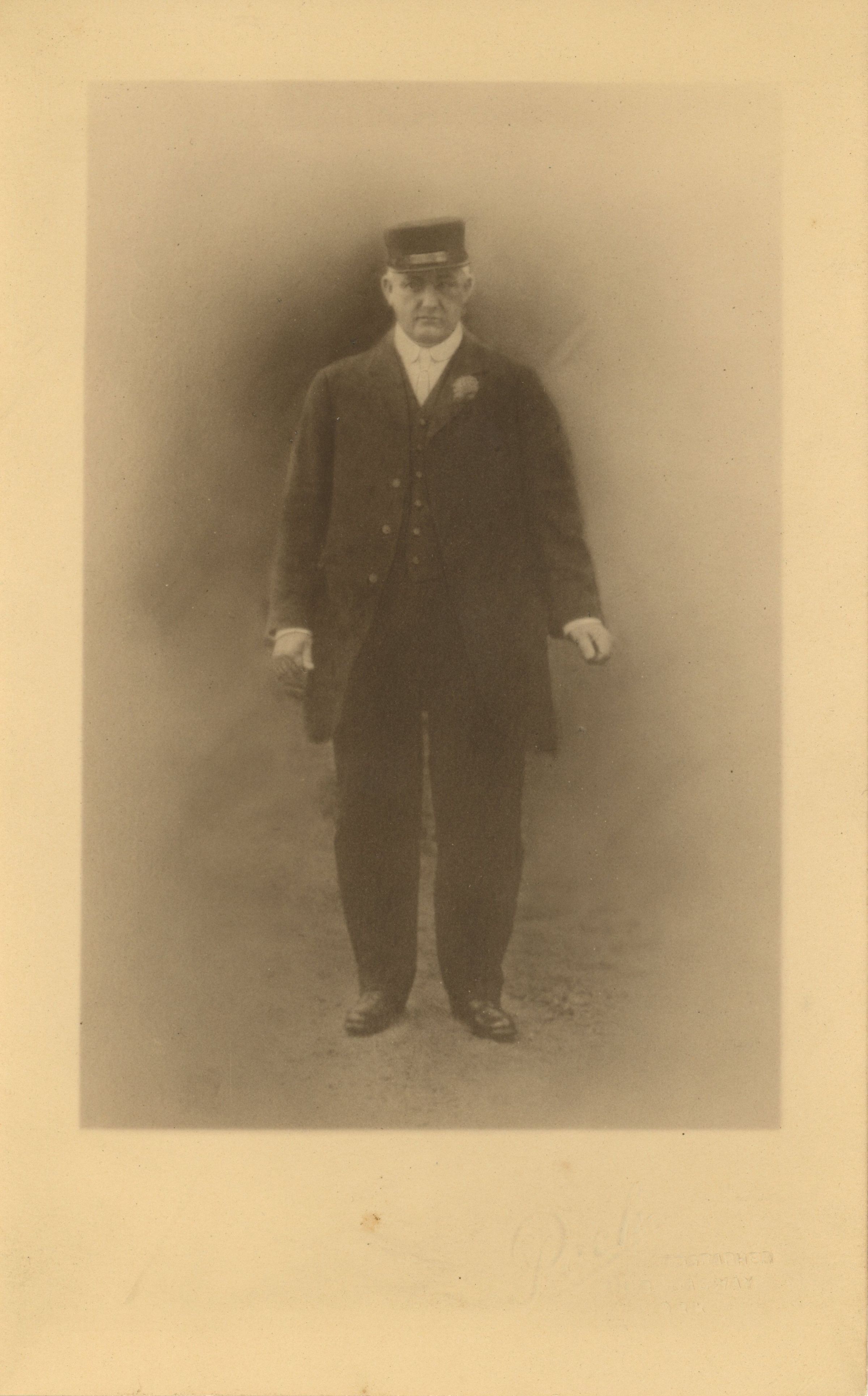 Photograph of an unidentified man wearing, what appears to be, a railroad conductor's uniform taken at Pach photograph studios, 111 Broadway, NY. The photograph has the studio name embossed on the matte and came in a protective folder labeled Pach in the upper left.