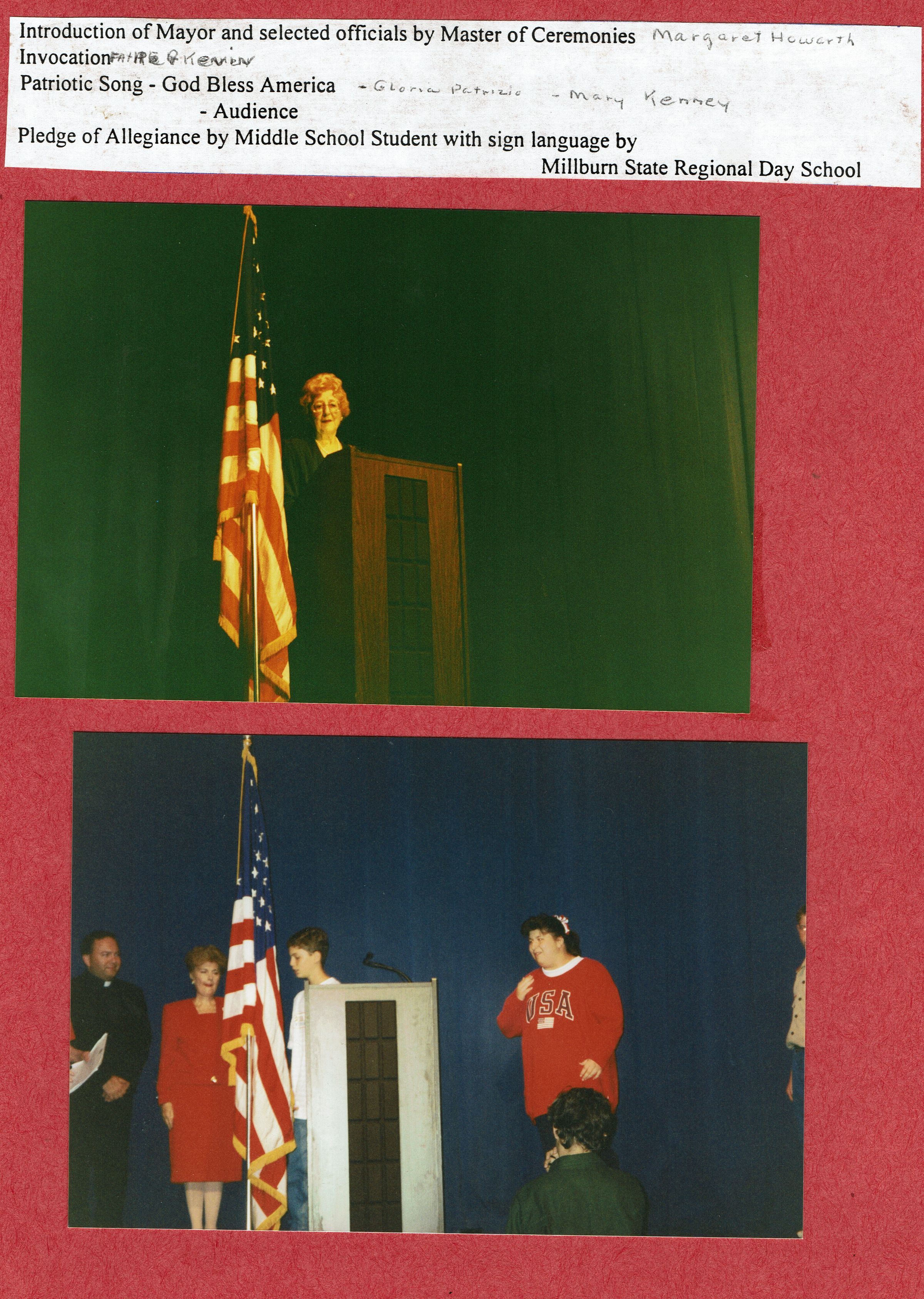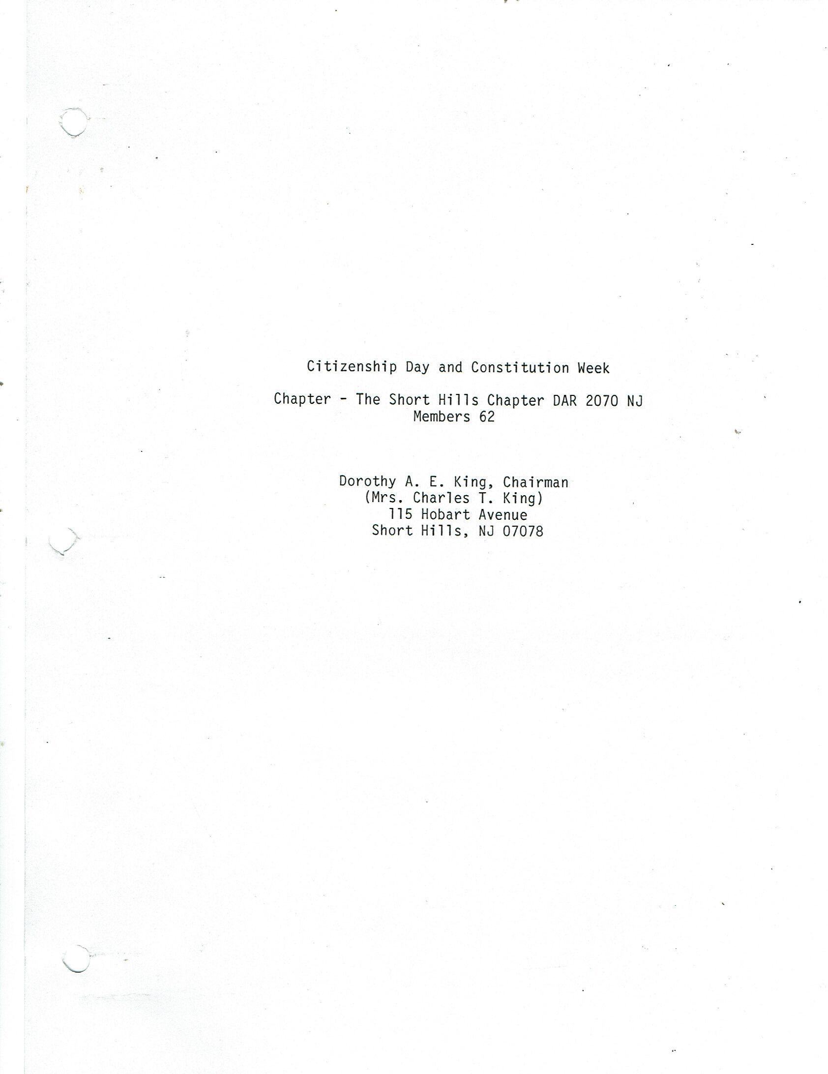 Scrapbook from the 1996 Citizenship Day and Constitution Week celebrations in Millburn sponsored by The Short Hills Chapter DAR (Daughters of the American Revolution), Dorothy King Chairman. Blue binder with photographs and clippings from the celebration pasted on colored construction paper, Township Proclamation of Constitution Week, acknowledgement letter from President Bill Clinton, Third Place award from the National Society of the Daughters of the American Revolution.