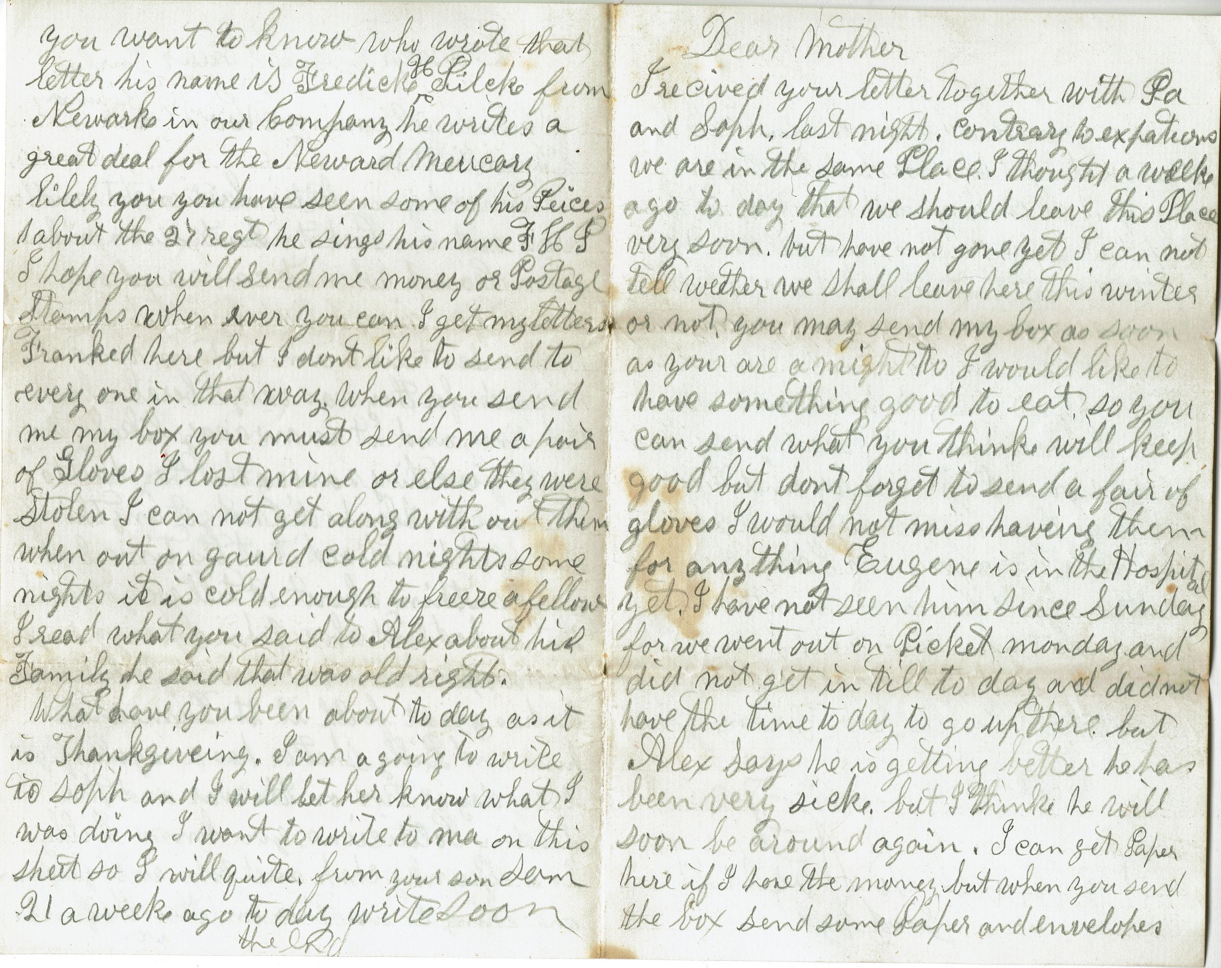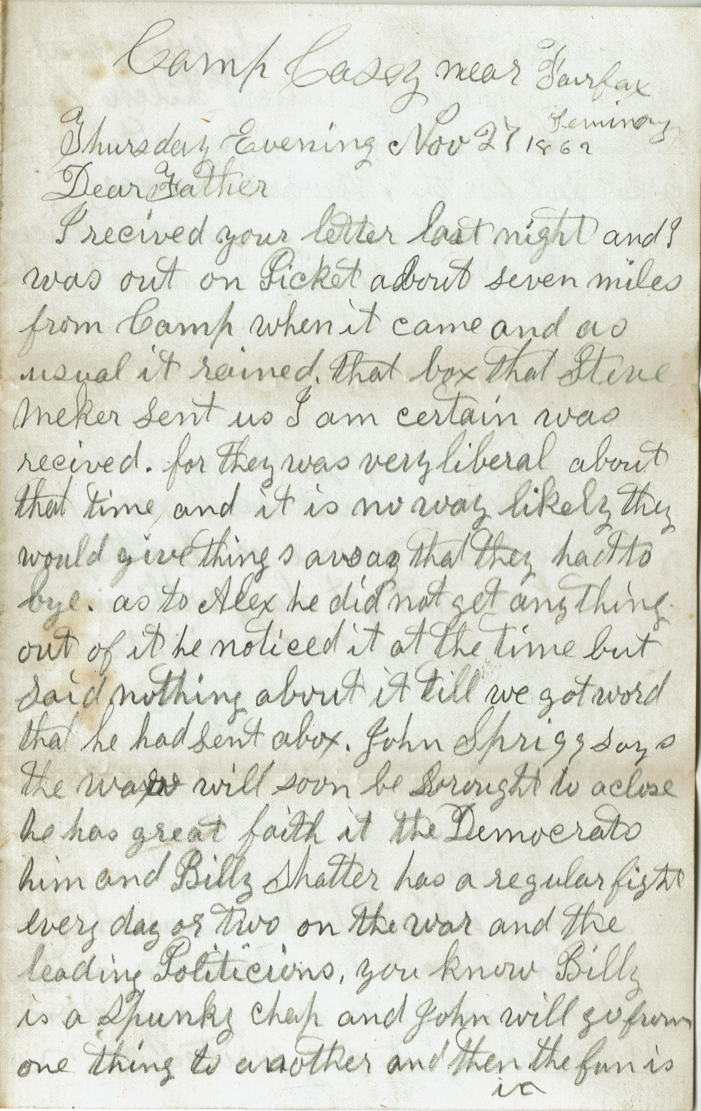 Letter from Samuel B. Parsil to his father and mother dated November 27, 1862, while serving with the 27th NJ Infantry at Camp Casey near Fairfax Seminary, Virginia. Refers to a box that Steve Meeker sent. "John Sprigg says the war will soon be brought to a close. He has great faith in the Democrats. He and Billy Shatter has (sic) a regular fight every day or two on the war and the leading Politicians...." Mentions Caleb Van Welt and Dave Ketchel (Retchel)? Asks for money for paper, pencils and stamps.