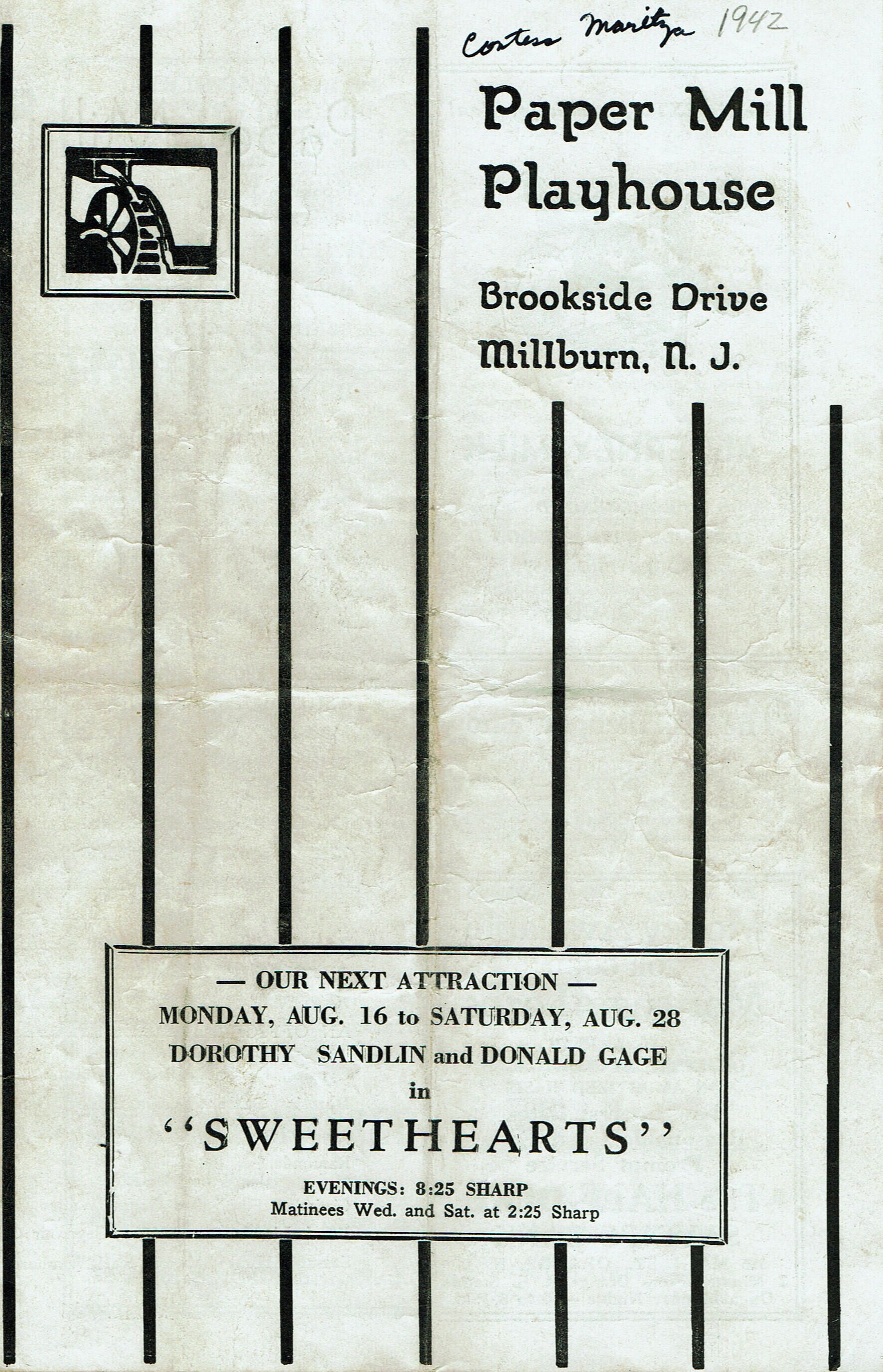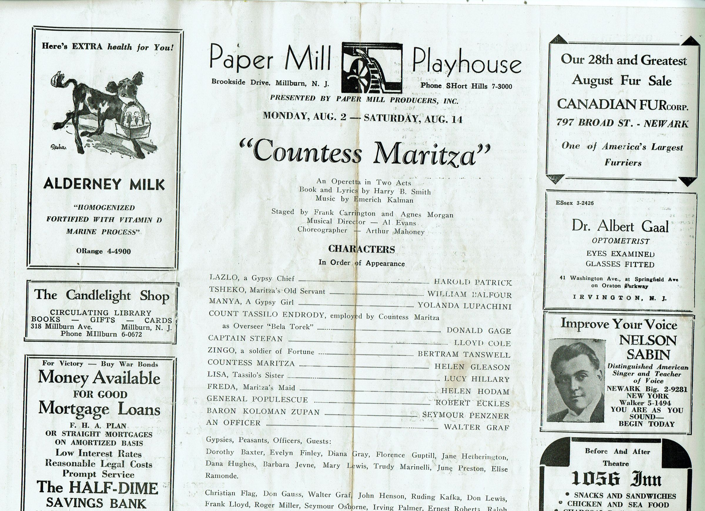Paper Mill Playhouse Program for Countess Maritza, August 2-14, 1942 with Seymour Penzner, Harold Patrick, Lucy Hillary, Helen Gleason, Donald Gage, Yolanda Lupachini and Lloyd Cole. 4 pp. Illustrated with B&W advertisements for local businesses.