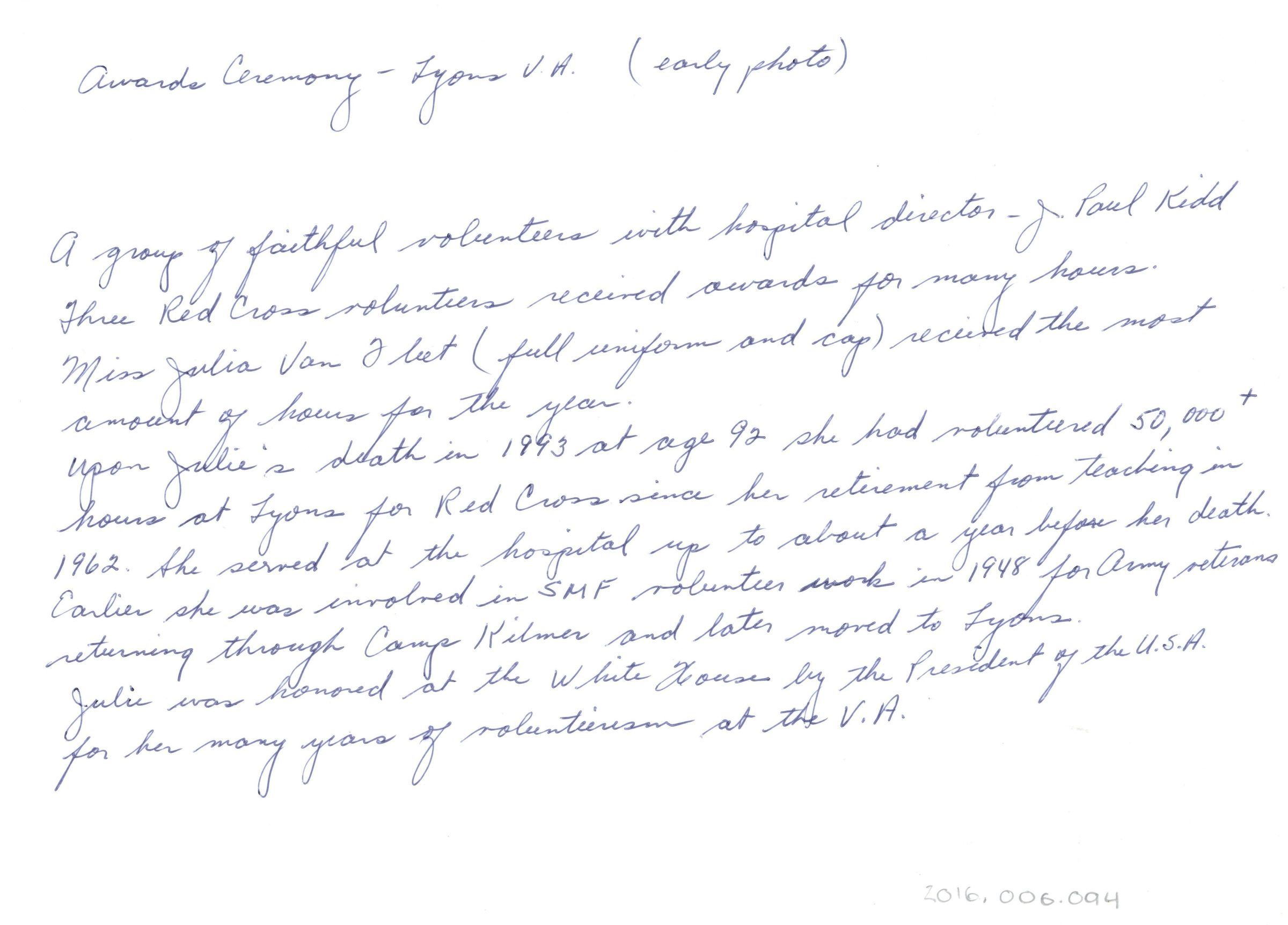 Awards Ceremony- Lyons V.A. (early photo). A group of faithful volunteers with hospital director - Paul Kidd. Three Red Cross volunteers received awards for many hours. Miss Julia Van Fleet (Full uniform and cap) received the most amount of hours for the year. Upon Julia's death in 1993 at age 92 she had volunteered 50,000+ hours at Lyons for Red Cross since her retirement from teaching in 1962. she served at the hospital up to about a year before her death. Earlier she was involved in SMF volunteer work in 1948 for army veterans. Julie was honored at the White House by the President of the U.S.A. for her many years of volunteerism at the V.A.