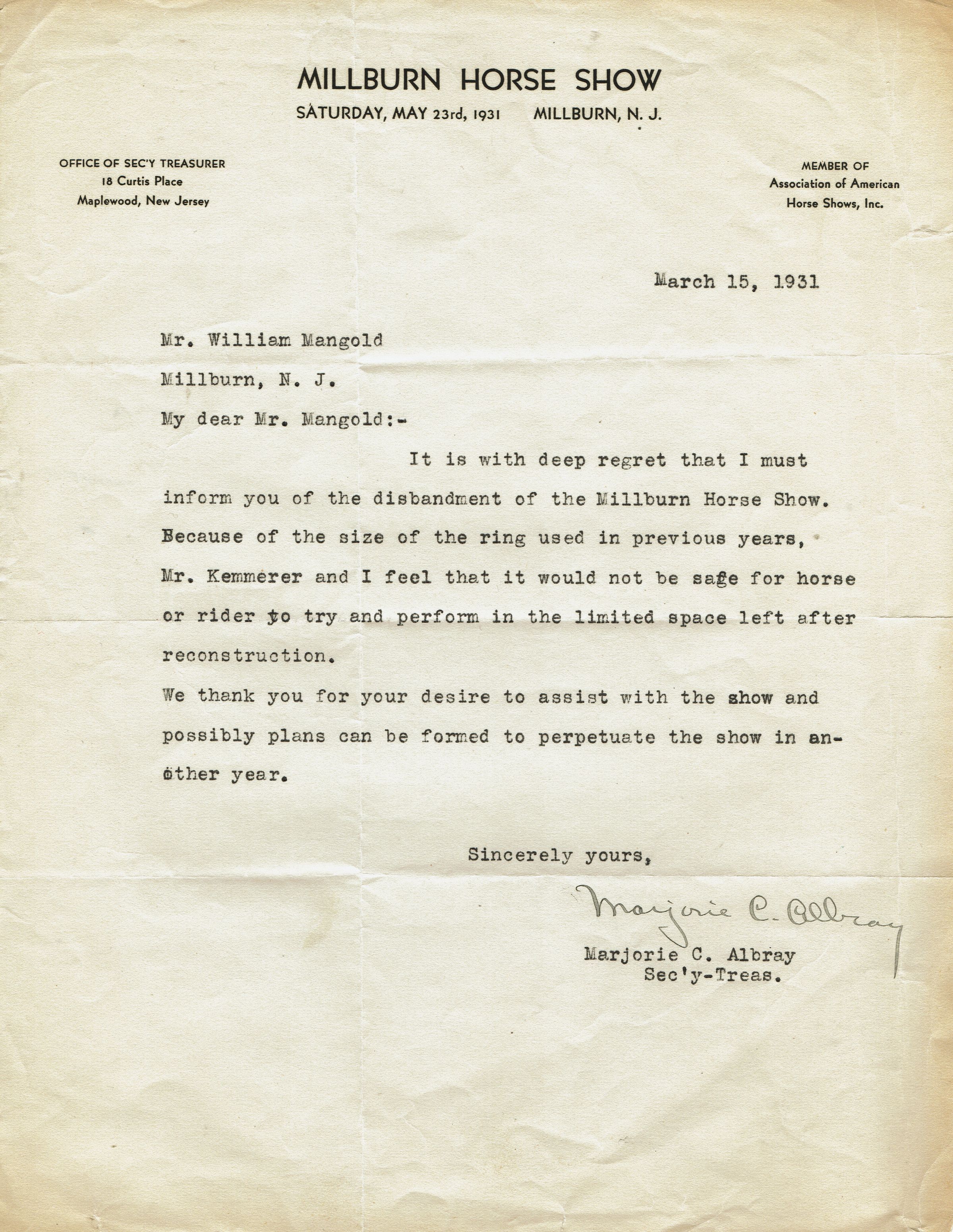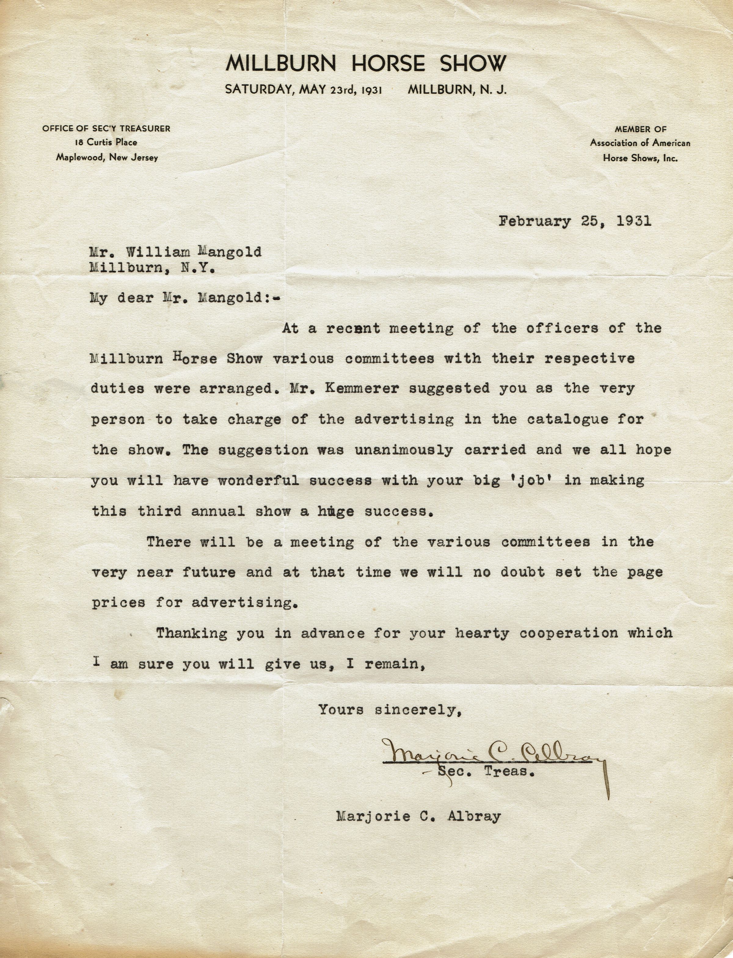 Two letters to William Mangold concerning the 1931 Millburn Horse Show. The letters, dating February 25 and 15, 1931, are from the Secretary Treasurer of the Millburn Horse Show Marjorie C. Albray. The first letter is a request for who Mr. Mangold to take charge of the advertising for the show as suggested by Mr. Kemmerer. The second expresses regret over the disbandment of the Horse Show, which had been scheduled to take place on Saturday, May 22, 1931. The documents also include a photograph from a horse show, but neither the show, nor the rider are identified.