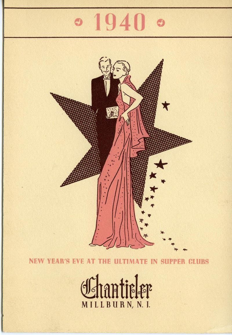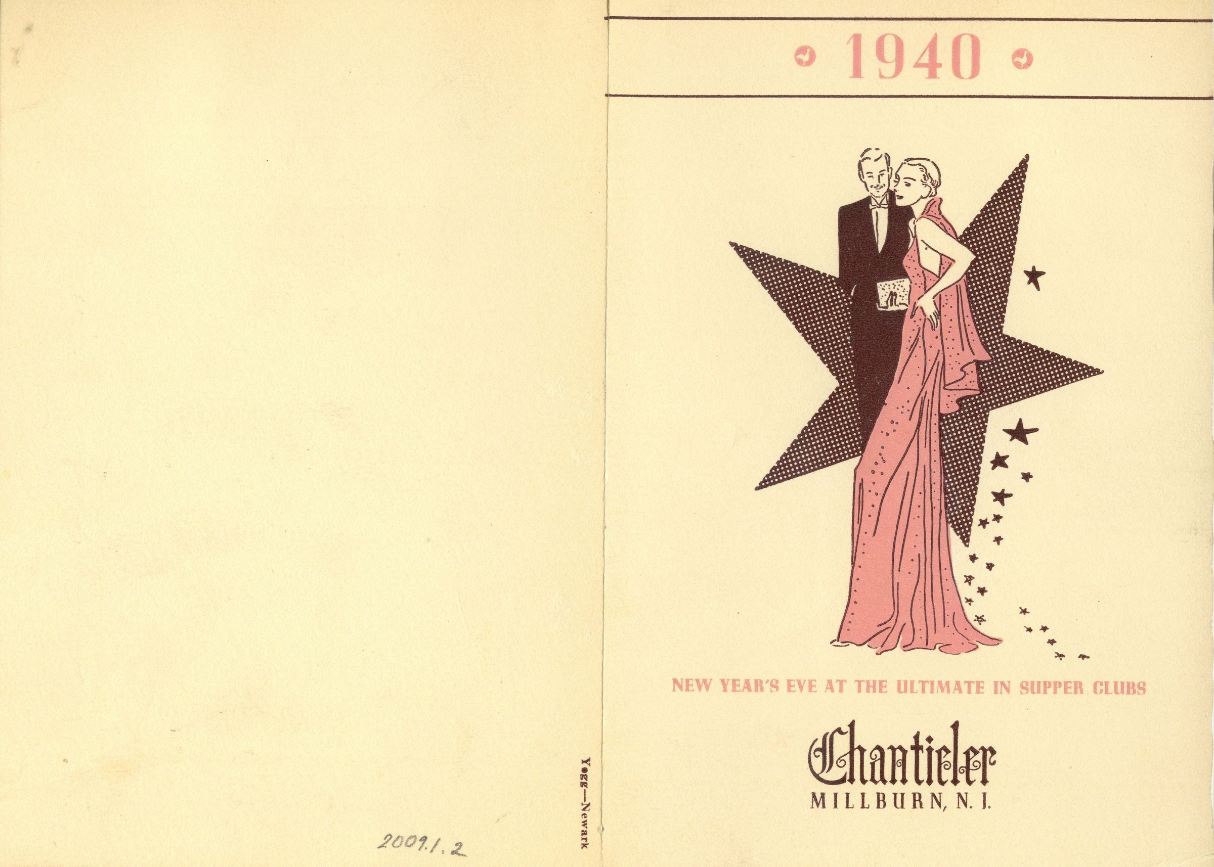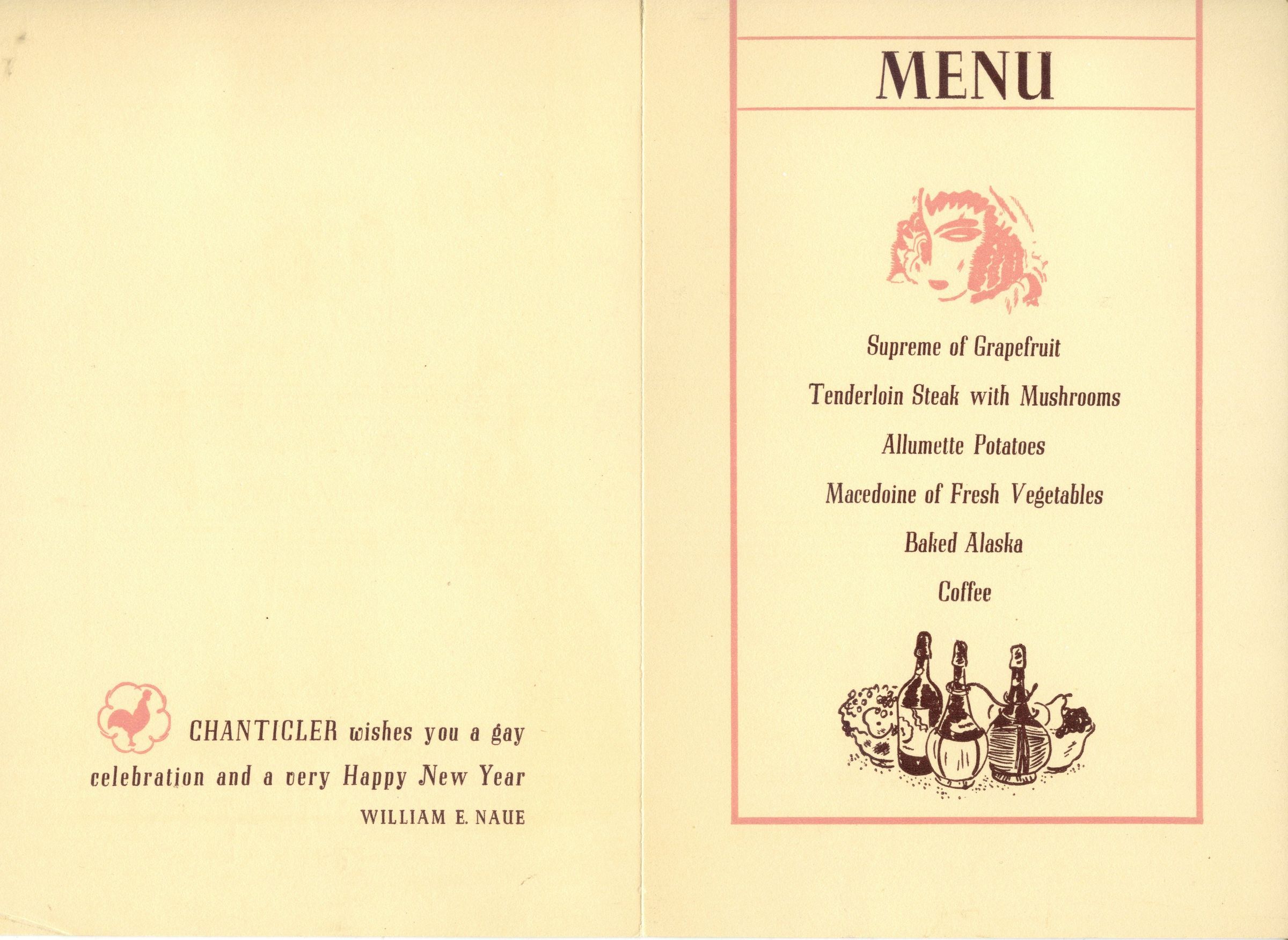 1940 New Year's Eve menu from Chanticler in Millburn, N.J. Menu in overall good condition with mild fading and small 0.5" fold in lower right corner of front page. Inside left page of single sheet, folded menu are New Year's wishes in lower center from William E. Naue and inside right page is description of dinner menu for evening. Menu was printed by Yogg, Inc., Newark.