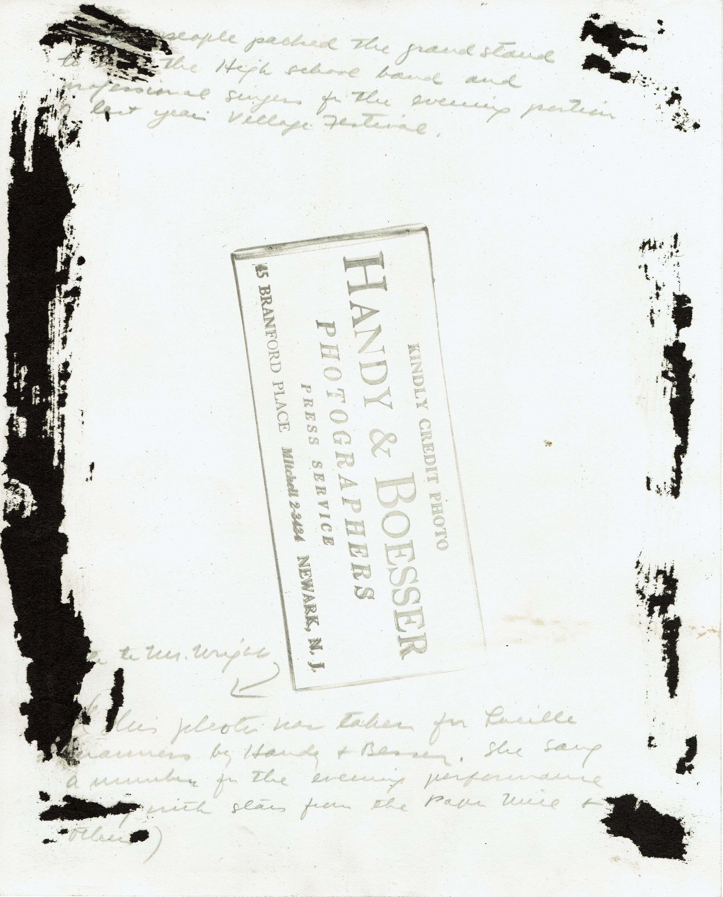 Photograph of the evening performances at Village Festival in Taylor Park on June 3, 1944. Caption on verso of photograph reads: Townspeople packed the grand stand to listen to the High School Bank and professional singers for the evening portion of last year's Village Festival. Note to Mr. Wright (?): This photo was taken for Lucille Manners by Handy & Boesser. She sang a number for the evening performance with stars from the Paper Mill and others.