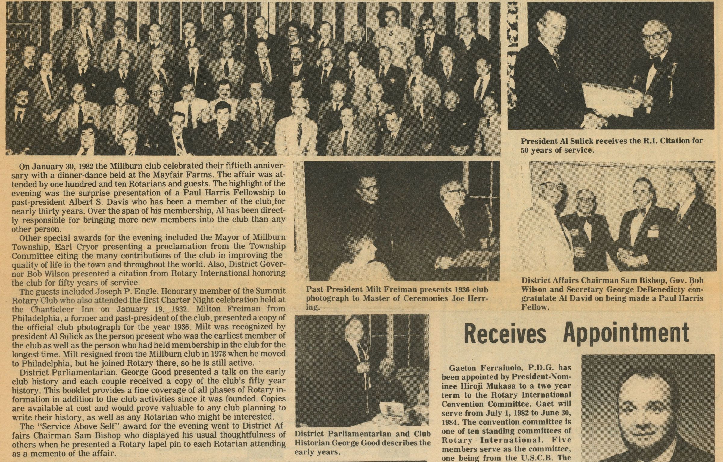 Archive Entry Archive Entry Go back Prev Item Next Item Rotary: Millburn Rotary Celebrates 50 Years, 1982 Publication Entry/Object ID2025.023.083AcquisitionAccession2025.023DimensionsHeight17-1/2 inWidth11-1/2 in