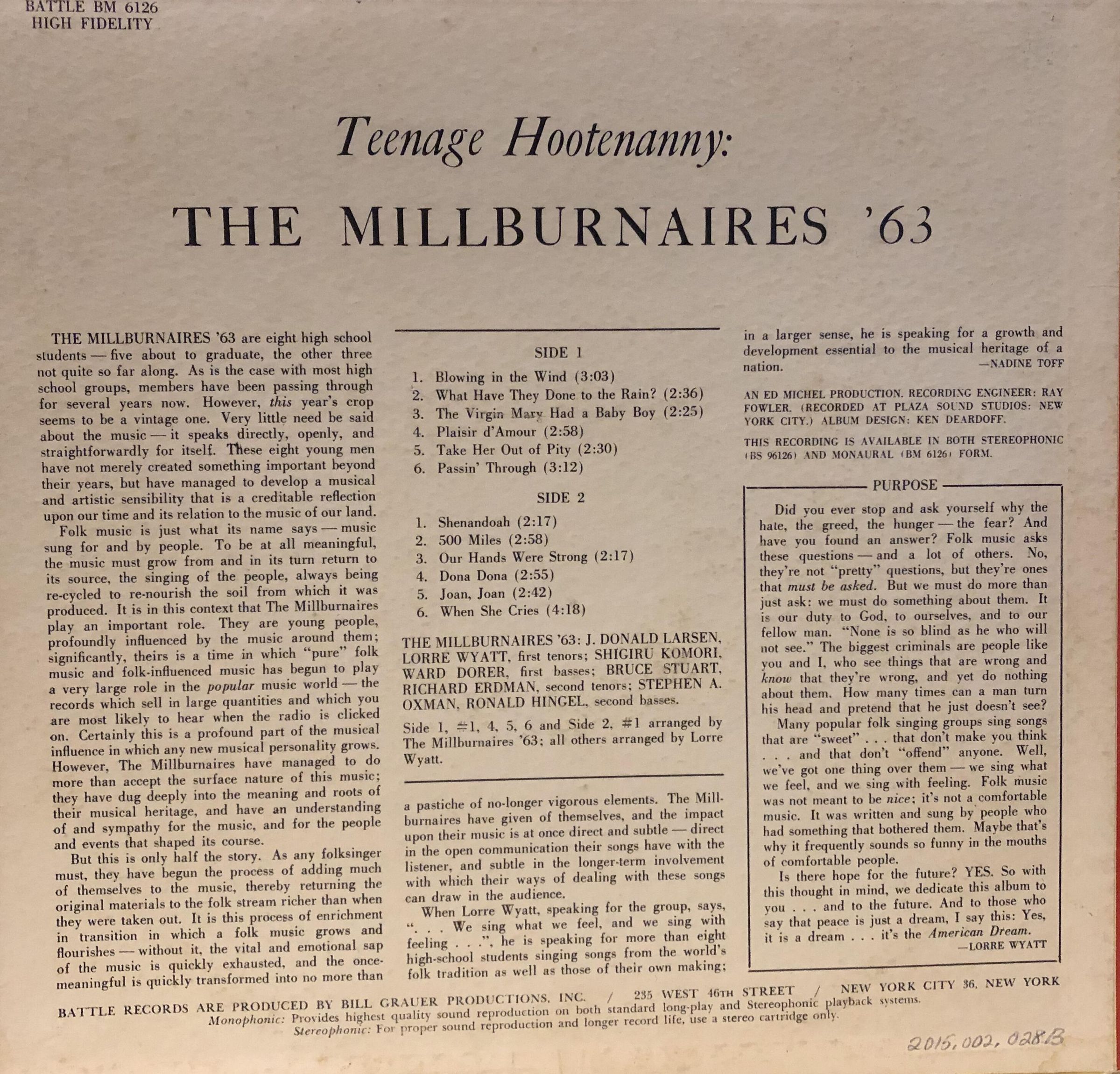 Millburnaires Record Album, "Teen-age Hootenanny: The Millburnaries '63," 1963