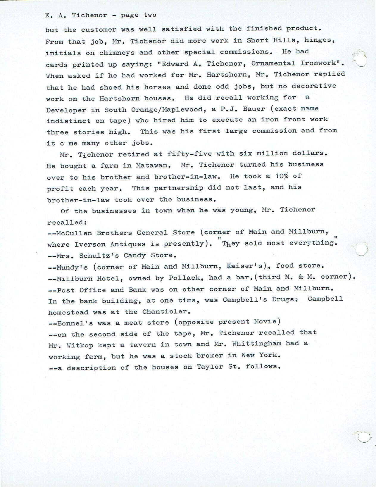 Tichenor's were some of the first settlers in Millburn in the 18th century. Edward's grandfather and father were blacksmiths, and Edward learned the trade from his father. He taught himself decorative ironwork. Tichenor retired at 55 years old with 6 million dollars and bought a farm in Matawan. Businesses he recalled in Millburn were: Mc Cullen Brothers General Store (Corner of Main & Millburn), Mrs. Schultz's Candy Store, Mundy's food store (corner of Main and Millburn), Milburn Hotel (owned by Pollack), In the Bank building at one time was Campbell's Drugs. Campbell's homestead was at the Chanticler and Bonnel's meat store.