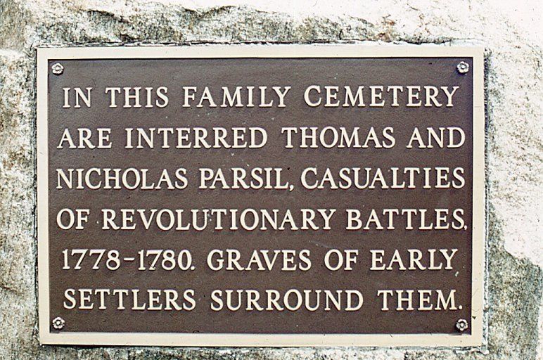 Photograph of the Sign on a rock outside the Parsil Family Cemetery which reads "In this family cemetery are interred Thomas and Nicholas Parsil, casualties of Revolutionary Battles 1778 - 1780. Graves of early settlers surround them."