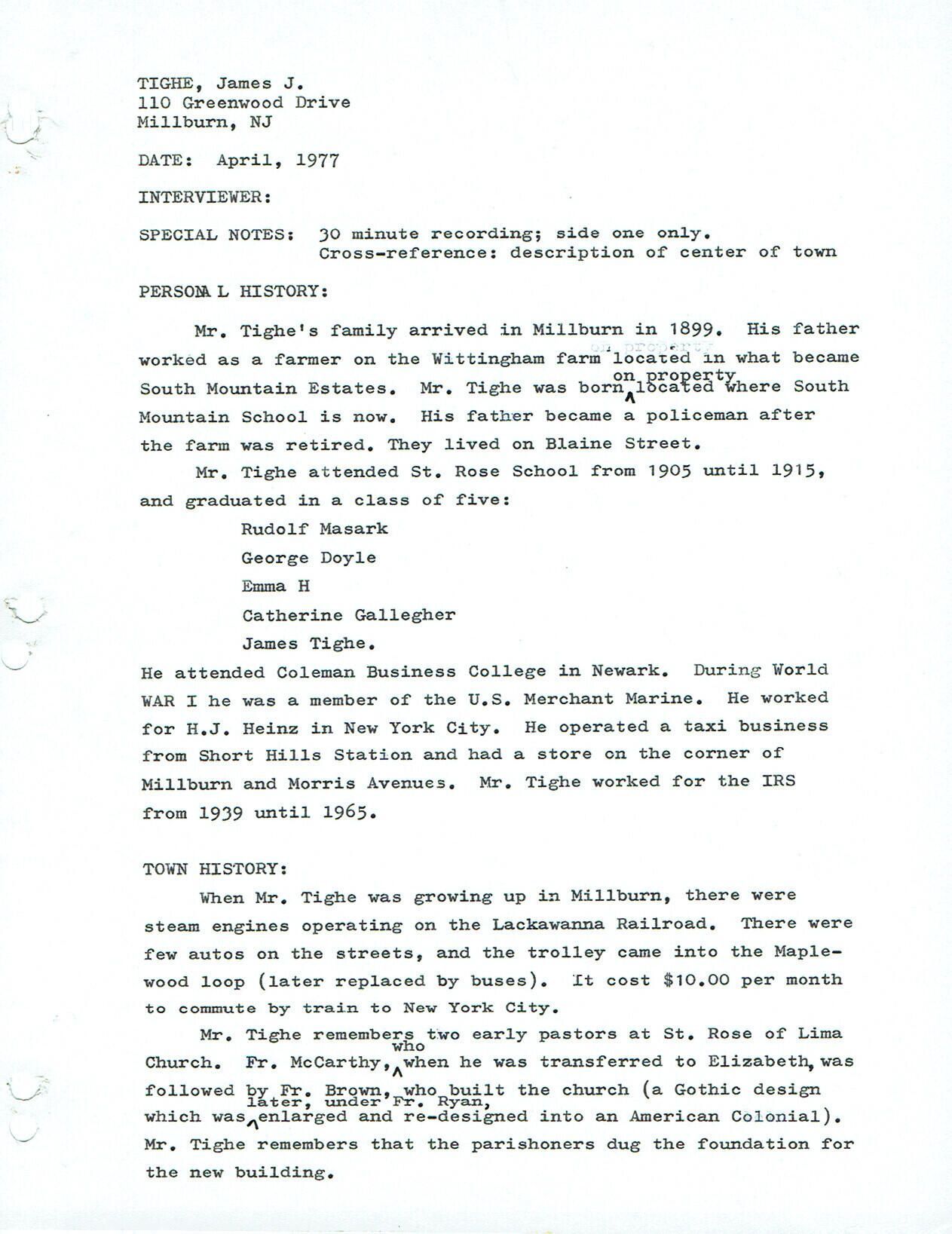 Tighe's family arrived in Millburn in 1899. His father worked as a farmer on the Whittingham farm, located on what would become South Mountain Estates. Tighe was born on the property where South Mountain School is today. His father became a policeman and they moved to Blaine Street. He attended st. Rose School from 1905-1915. The five members of his graduating class were: Rudolf Masark, George Doyle, Emma H, Catherine Gallagher, James Tighe. Tighe had a store on the corner of Millburn & Morris Avenue & operated a taxi service from the Short Hills Station.