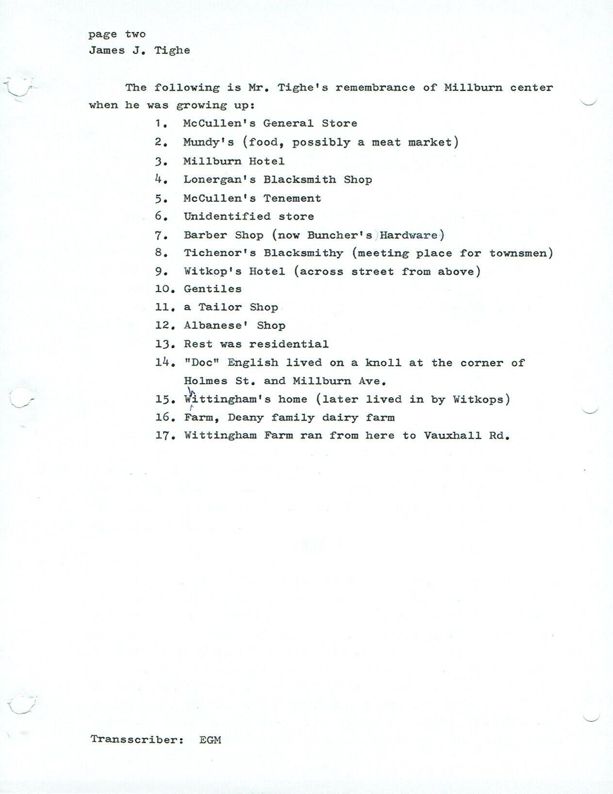 Describes the transportation: trains and trolley lines, early years at St. Rose of Lima, and the following businesses & individuals: McCullen's General Store, Mundy's groceries, Millburn Hotel Lonergan's Blacksmith Shop, McCullen's Tenement, Barber Shop (present day Bunchers), Tichenor's Blacksmithy, Witkop's Hotel, Gentiles, Albanese's Shop, "Doc" English (lived on a knoll at the corner of Holmes Street and Millburn Avenue), Whittingham's home, Deany family dairy farm.