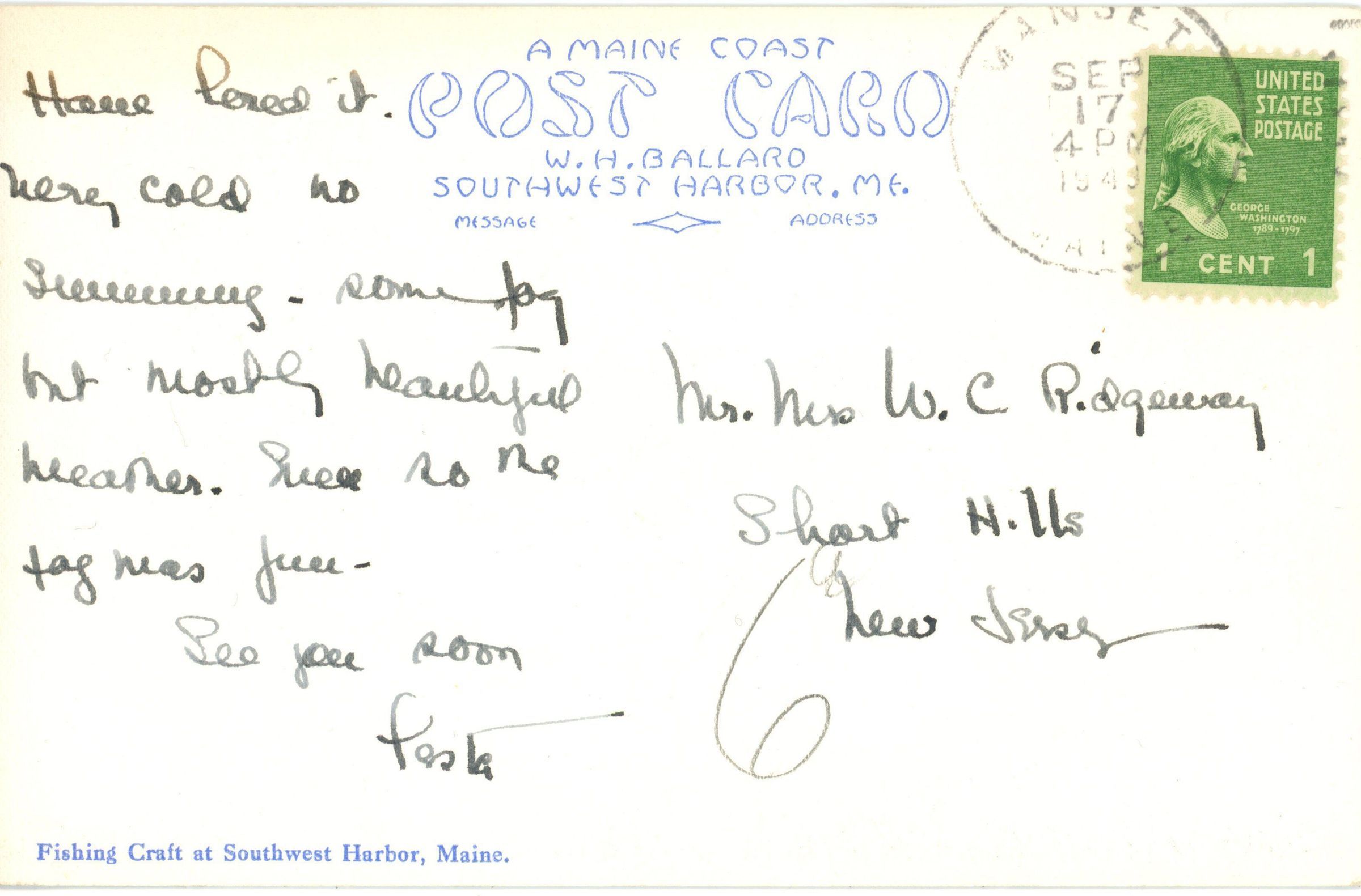 Postcards sent to Mr. and Mrs. William Coombs Ridgeway, 250 Hartshorn Drive, Short Hills, N.J., postmarked September 17, 1946 and September 14, 1940. Postcards have messages about Maine.
