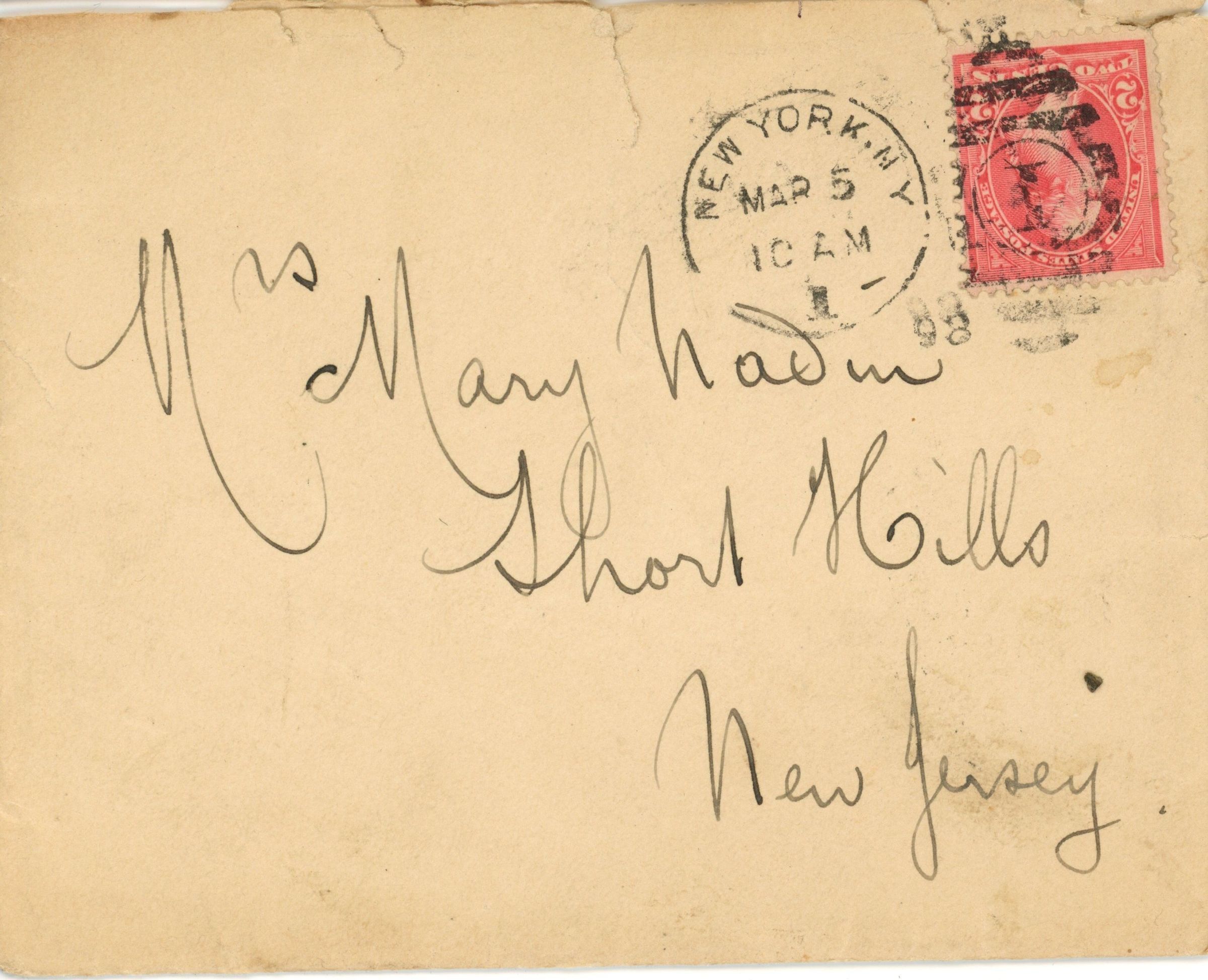 Handwritten 1 page letter and postally used envelope from P. de Longpre, 877 West End Avenue, NY, NY to Mars. Mary Nadin dated March 4, 1898. The letter reads: