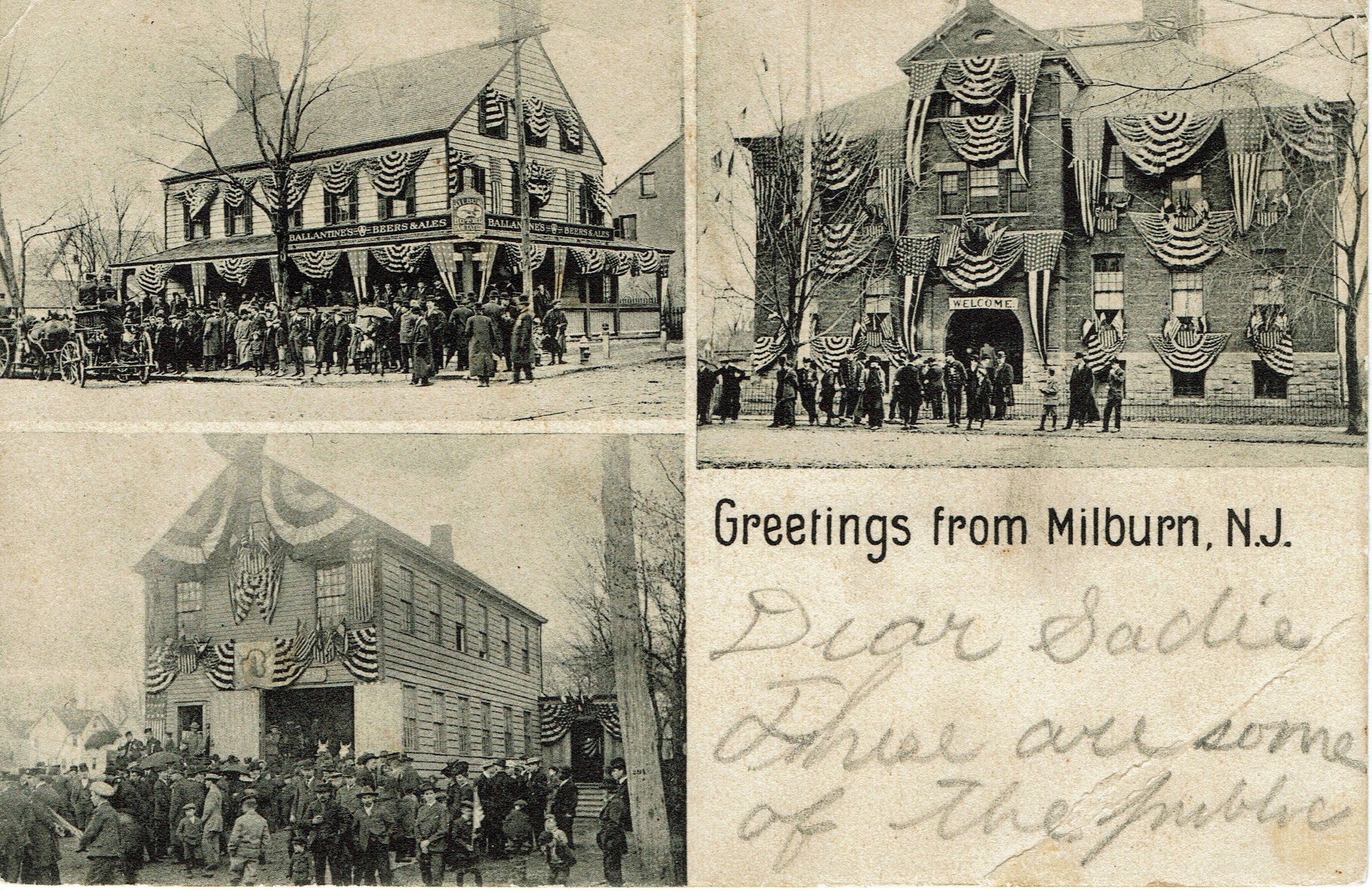 ostcard of image # 22 in the centennial photograph collection showing the 1907 semi-centennial celebrations in Millburn. Photograph from the Centennial Collection of postcard featuring Millburn Hotel, Town Hall & Washington School all decked out with bunting for Millburn Centennial Celebration, April 13, 1907.