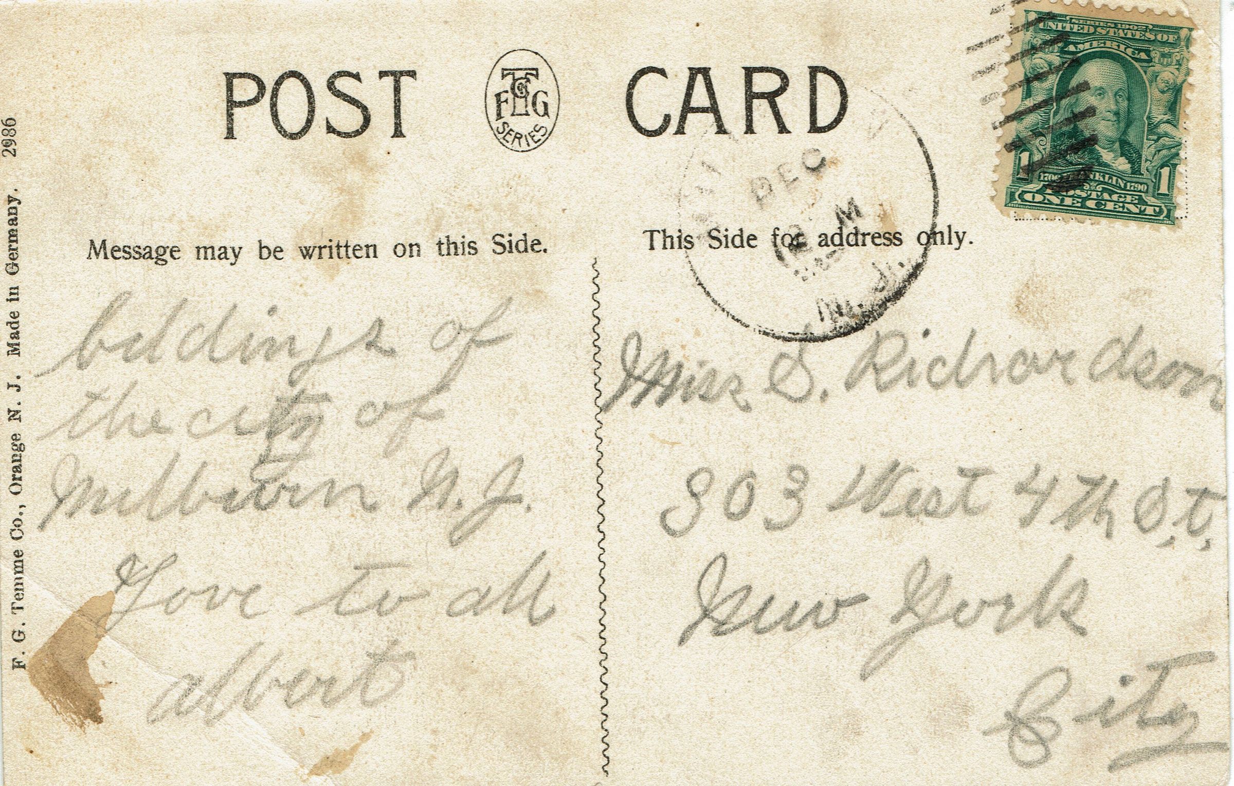 Postally used. Date of postmark is unclear. Addressed to Miss S. Richardson, 303 West 4th Street, New York City. Message on front and verso of card reads," Dear Sadie, These are some of the public buildings of the city of Millburn, N.J. Love to all, Albert."