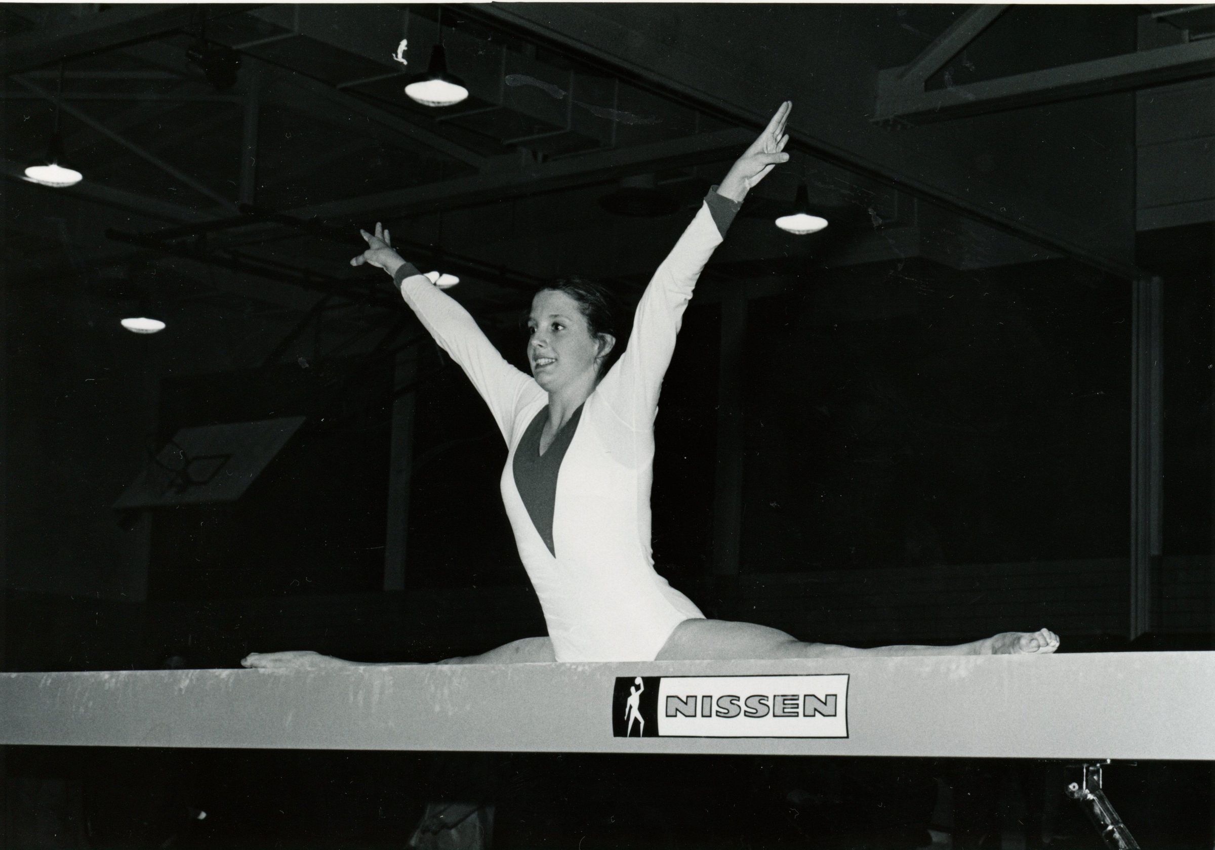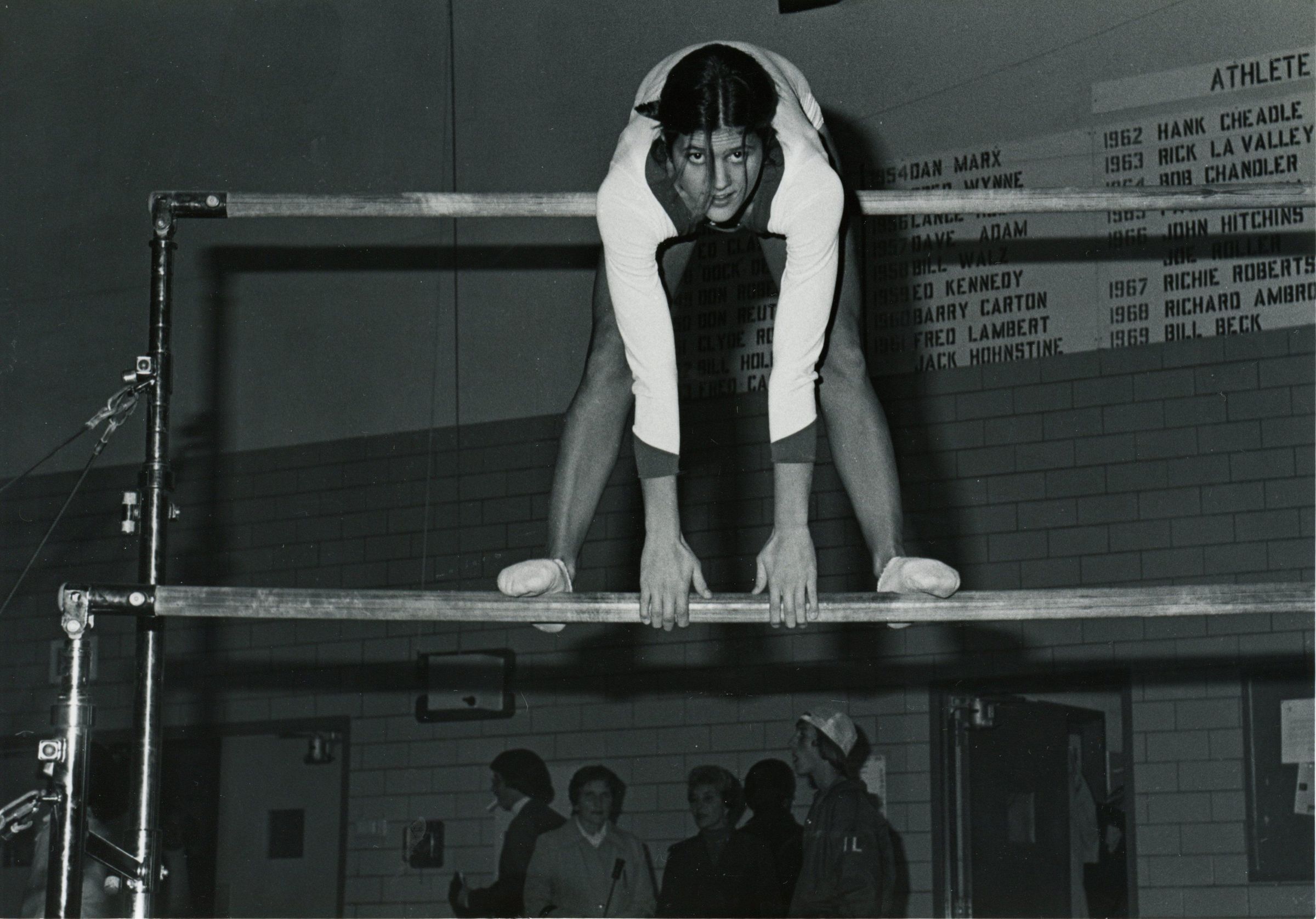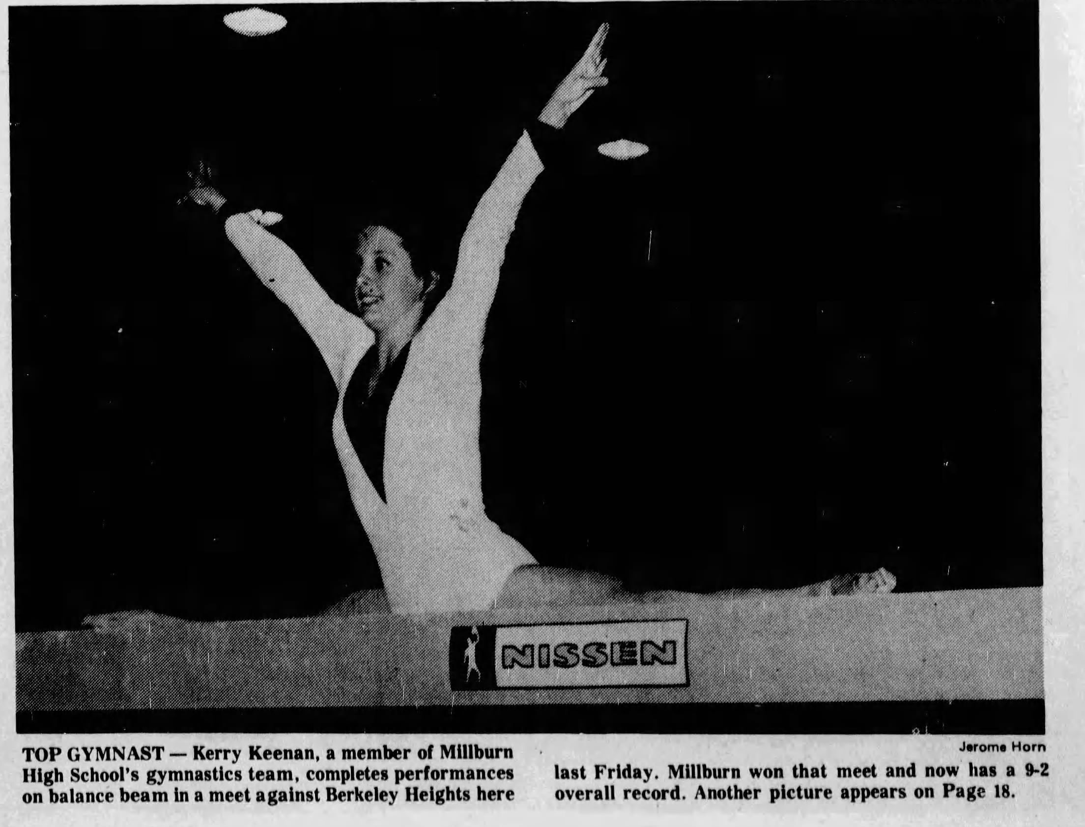 Photographs from the Millburn High School Gymnastics Meet, October 14, 1977 taken by Jerry Horn and published in the October 20, 1977 issue of The Item. Kerry Keenan on Balance Beam andMary Ellen Mulcahy on uneven bars.