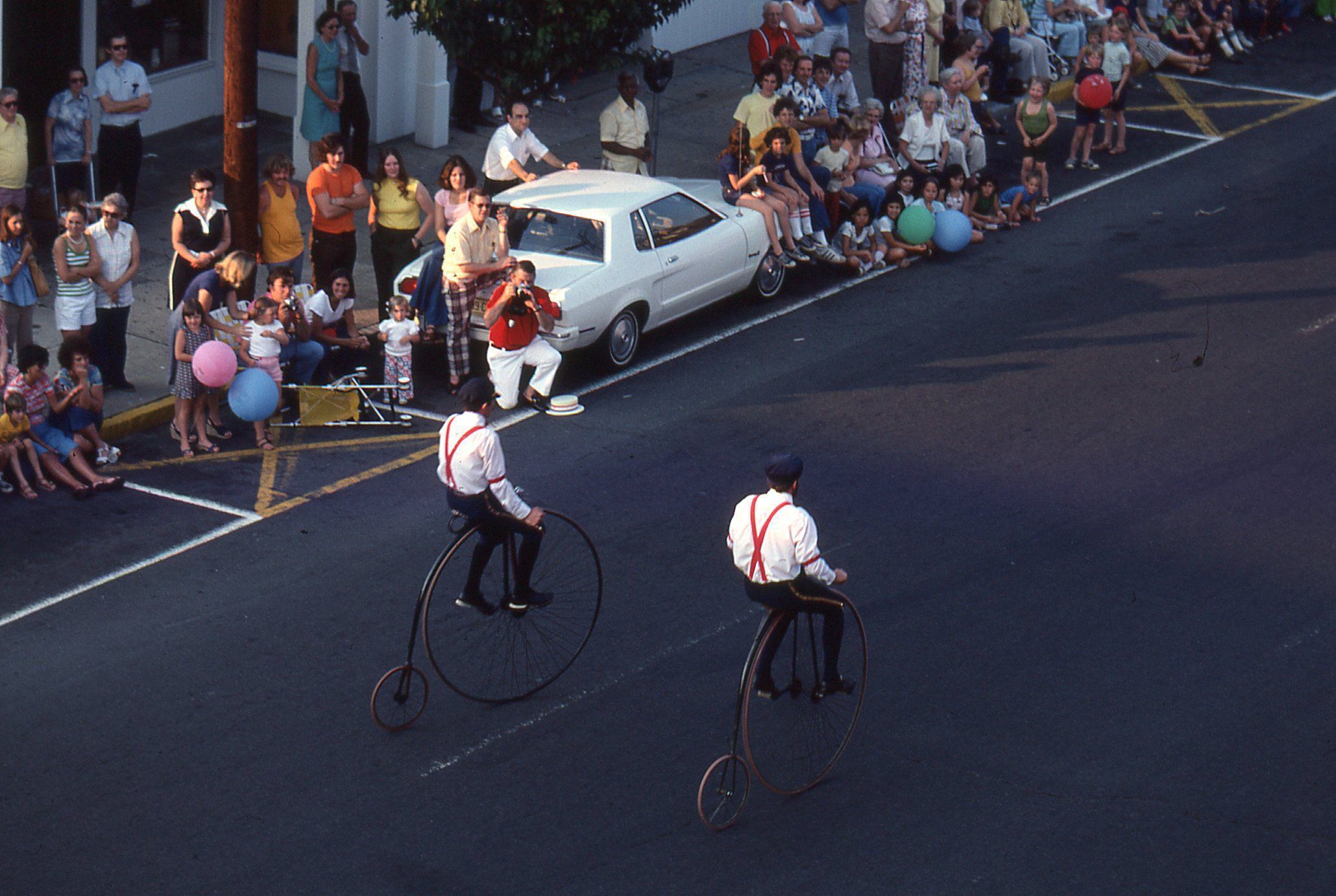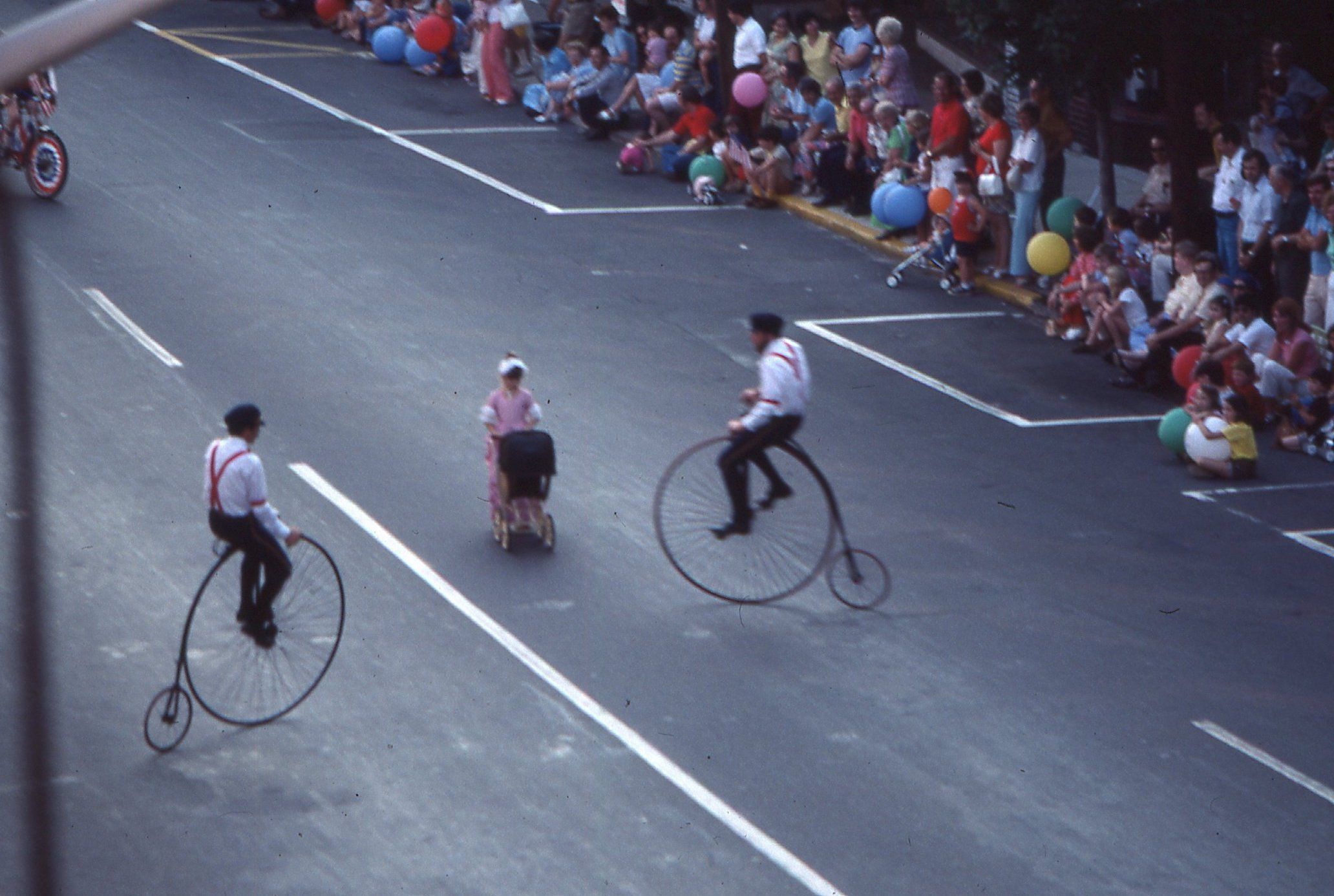 Photographs taken by Owen Lampe of Hi-Wheel Riders in the July 2, 1976 parade on Millburn Avenue, celebrating the American Bicentennial.