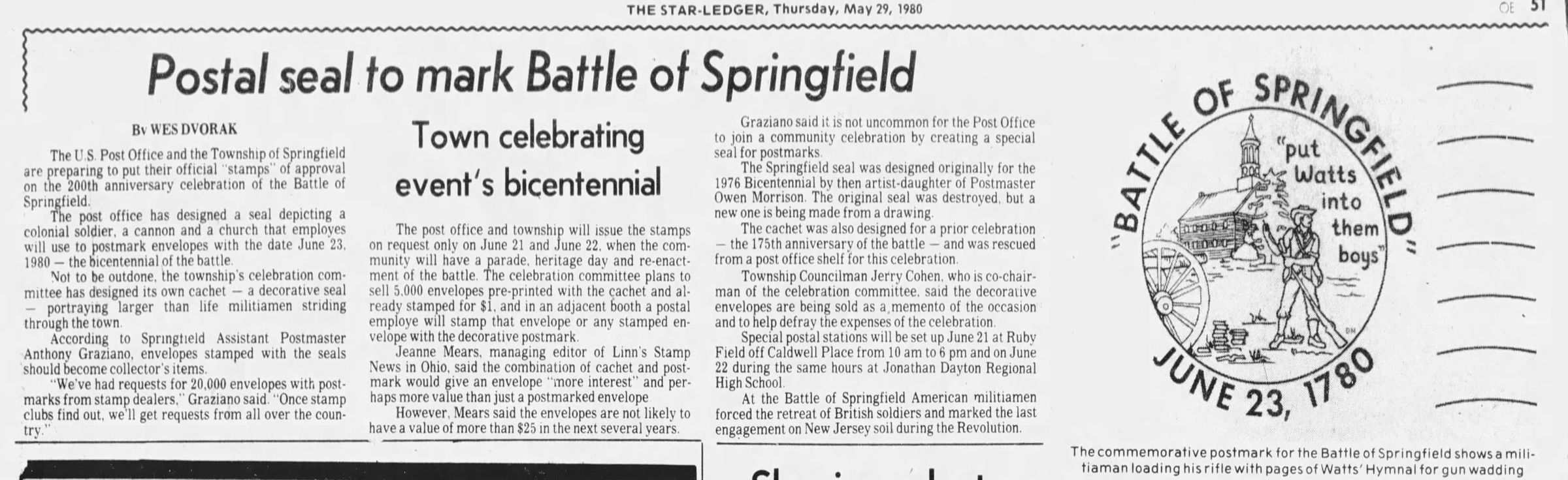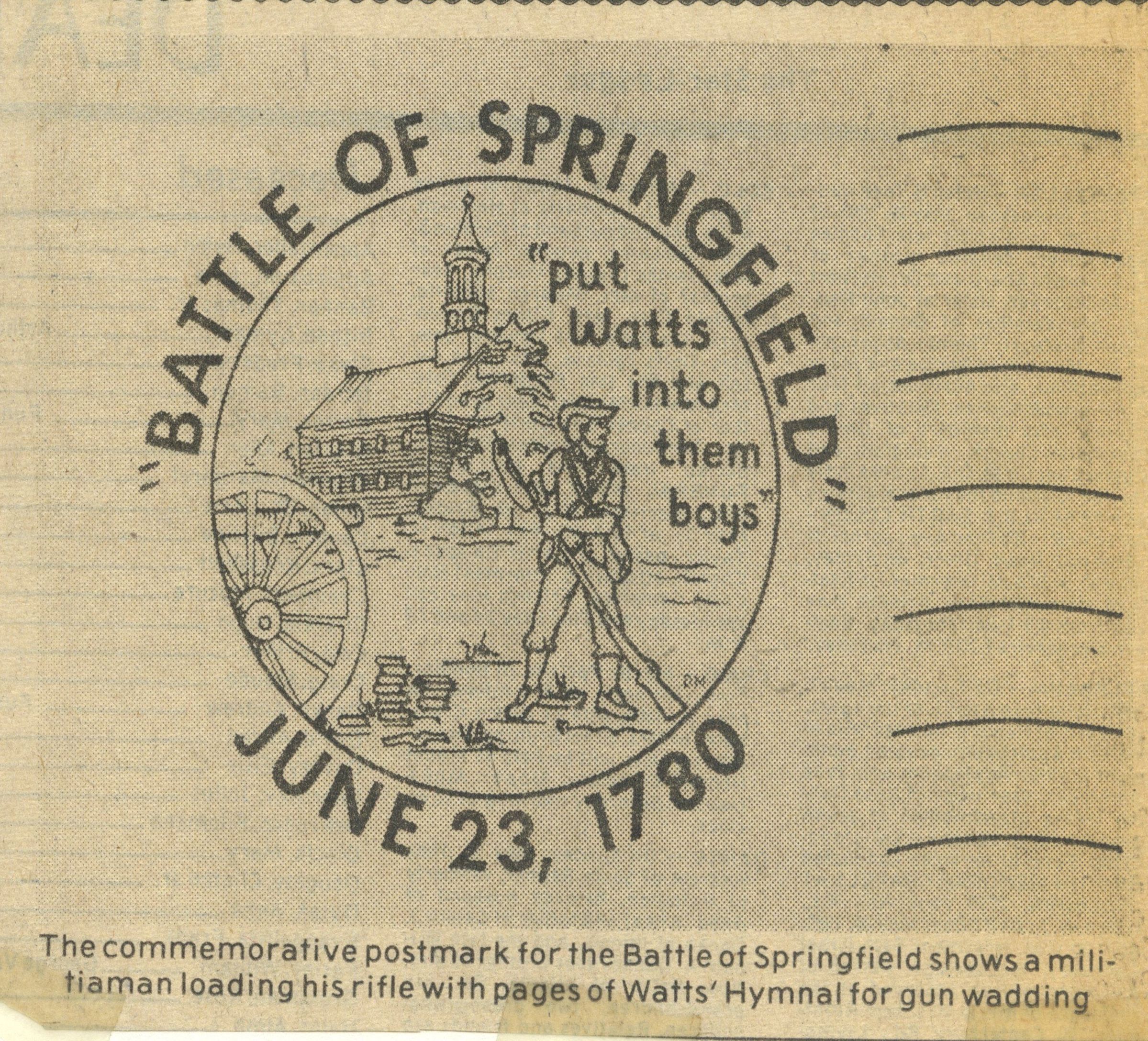 Newspaper clipping from The Star Ledger, May 29, 1980 showing the commemorative Postmark issued for the Battle of Springfield, featuring "Put Watts into them boys," Shows a militiaman loading his rifle with pages of Watts' Hymnal for gun wadding.