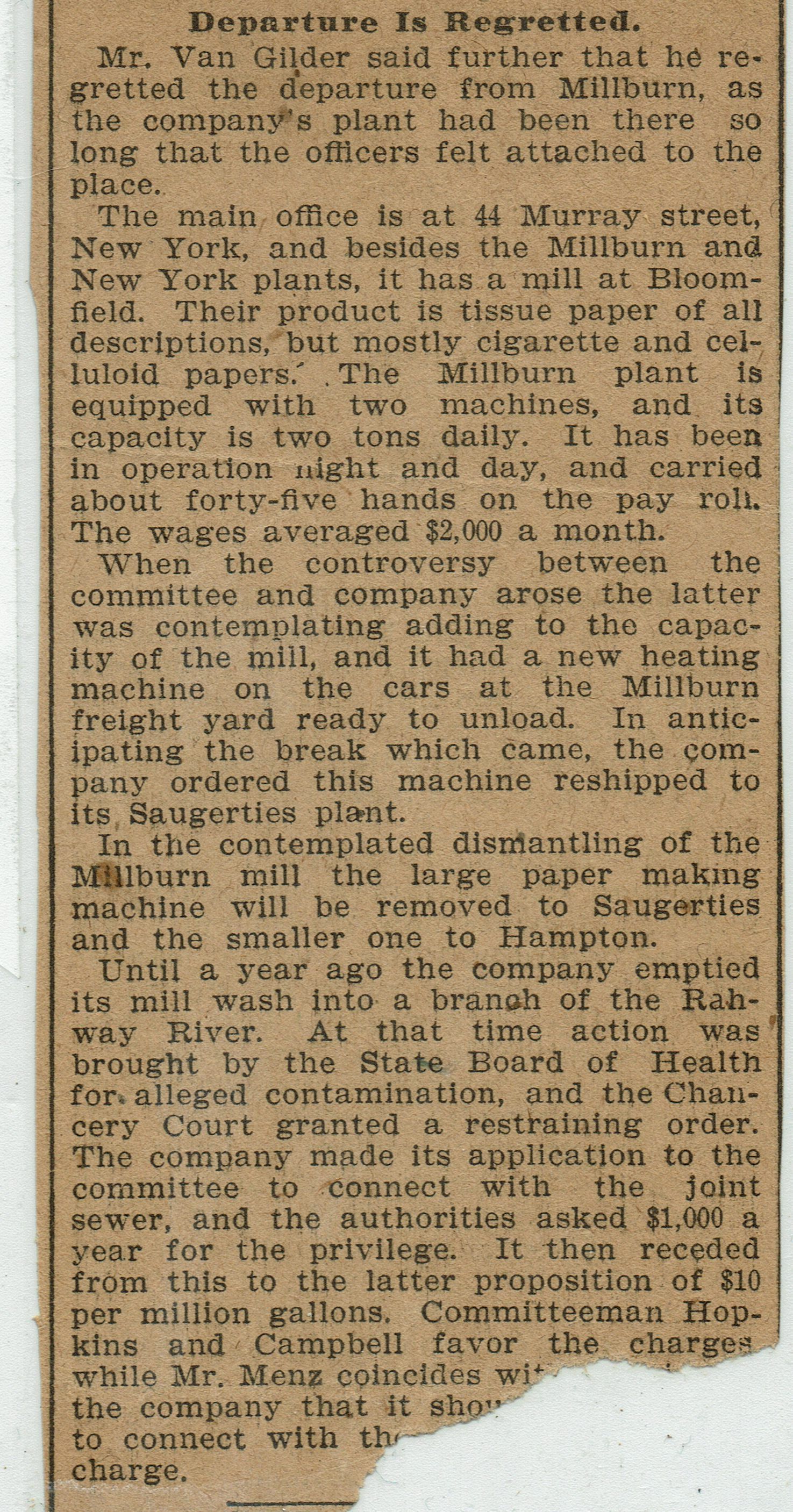Archive Entry Archive Entry Go back Prev Item Next Item Flanagan: Diamond Paper Mill To Quit Millburn, 1904 Publication Entry/Object ID2023.246.049CollectionFlanagan CollectionAcquisitionAccession2023.246DimensionsHeight13 inWidth2-3/8 in