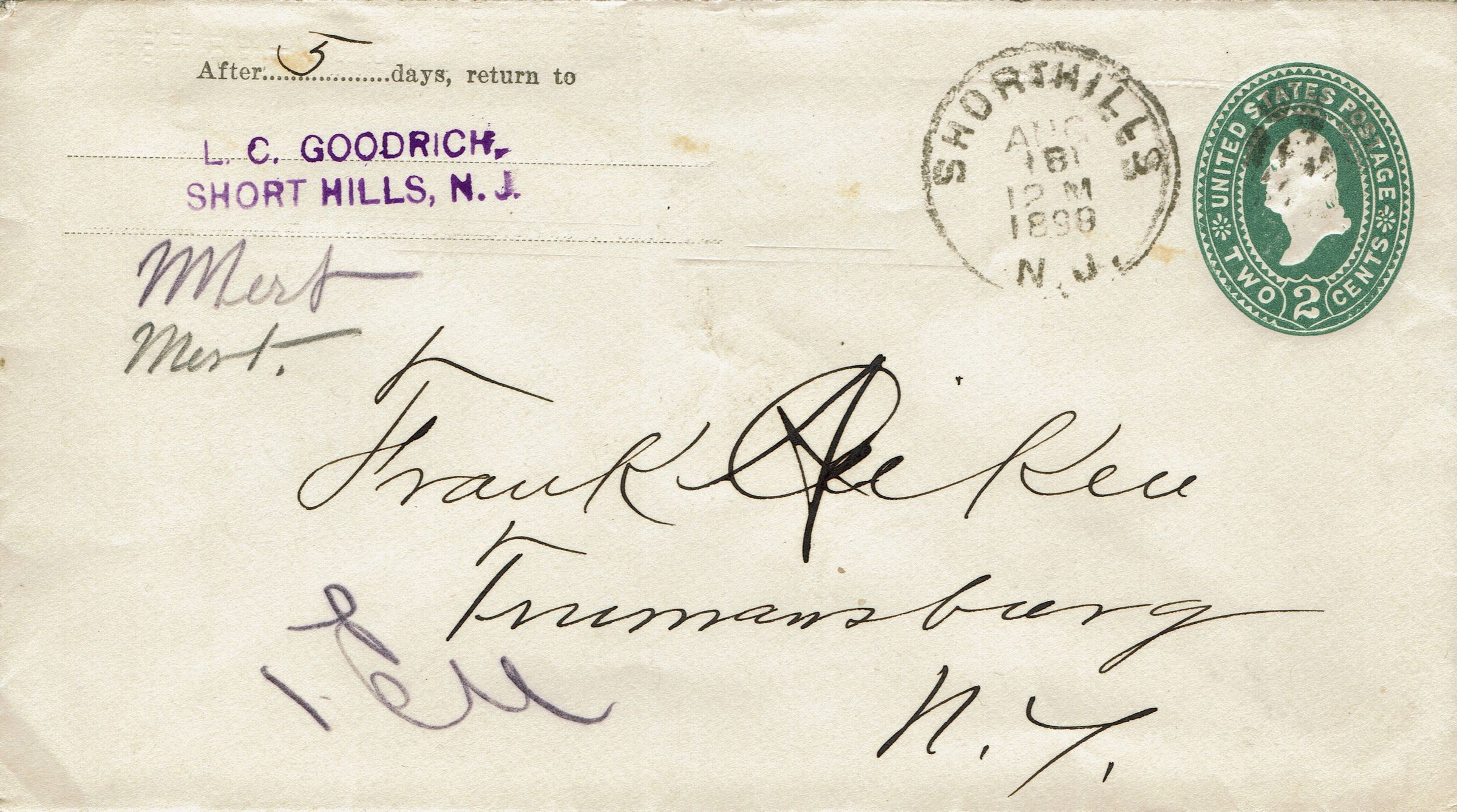 Envelope from L.C. Goodrich, Short Hills, N.J. to Frank Aiken (?), Trumansburg, N.Y. postmarked Short Hills, August 8, 1898, 12 M. received, New York, NJ August 16, 2:30 pm.