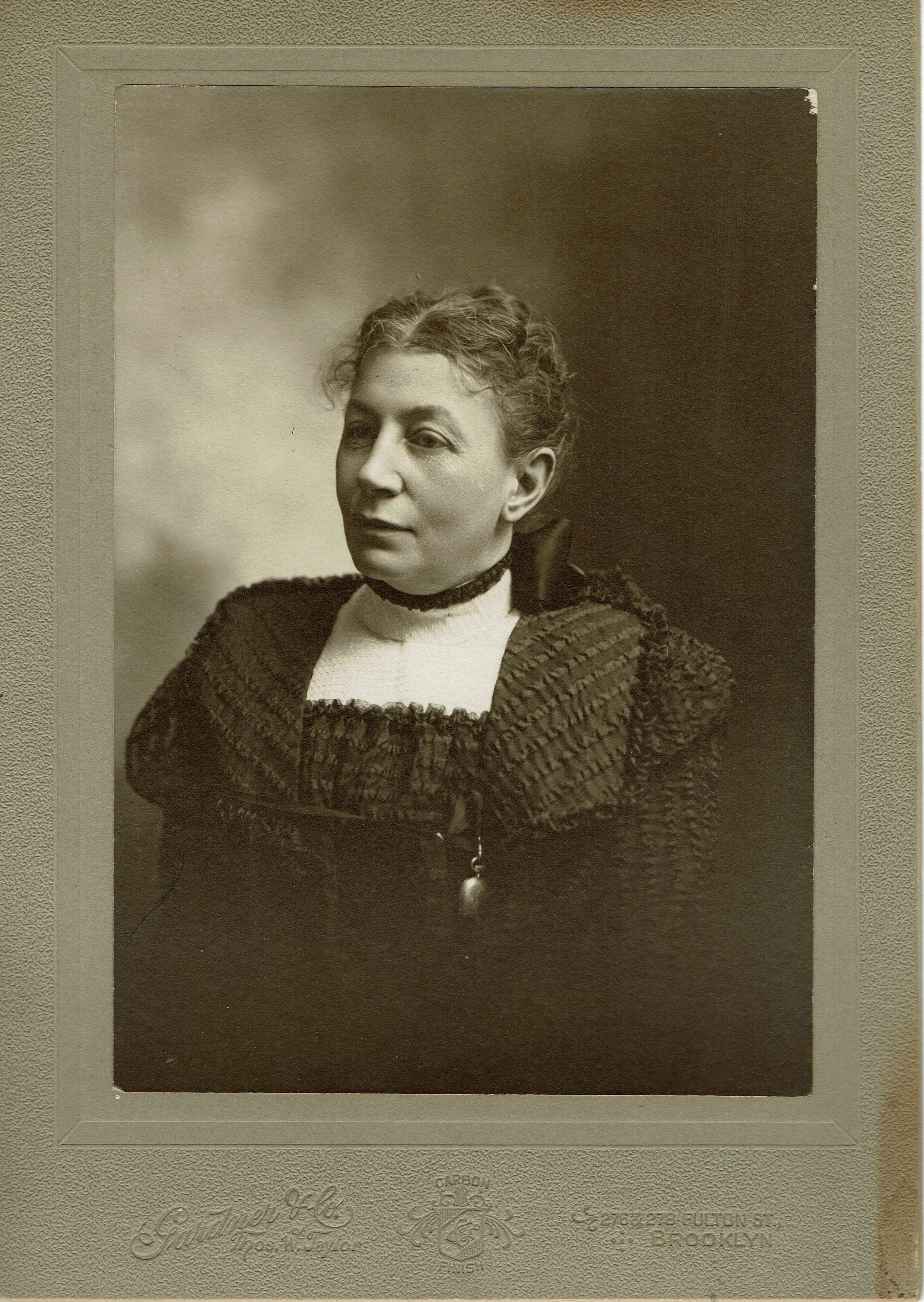 Photograph of Elizabeth Kellogg with an inscription on the verso: " Sincerely Yours, Elizabeth Lyle Kellogg, December 23rd 1898," The Photograph was taken at Gardner & Co. Thomas W. Taylor, 276 & 278 Fulton Street, Brooklyn. In 1898, Elizabeth Kellogg was 48 years old.