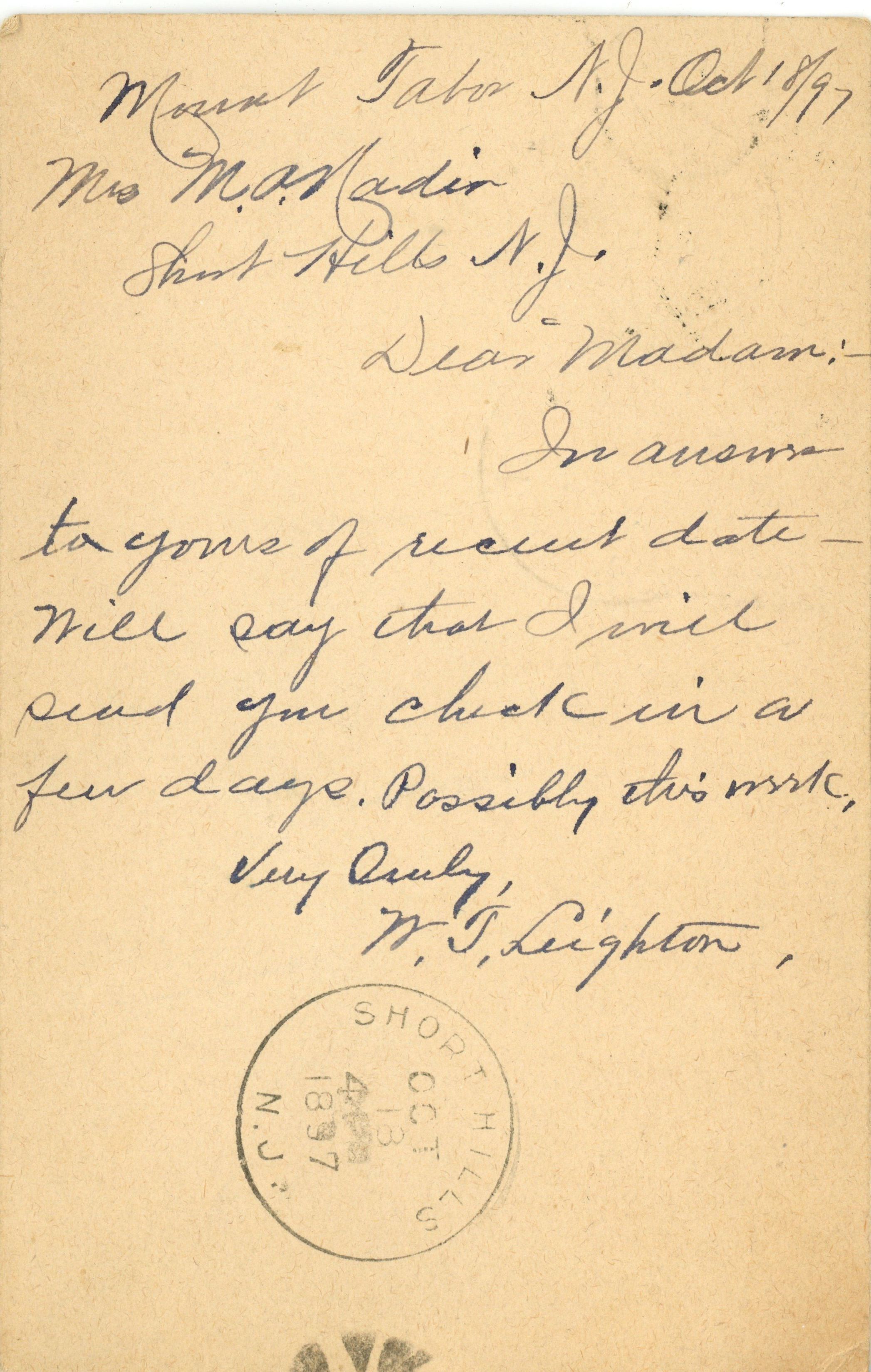 Handwritten postcard from W.J. Leighton to Mary Nadin from Mount Tabor, NJ, dated October 18, 1897. The message reads: